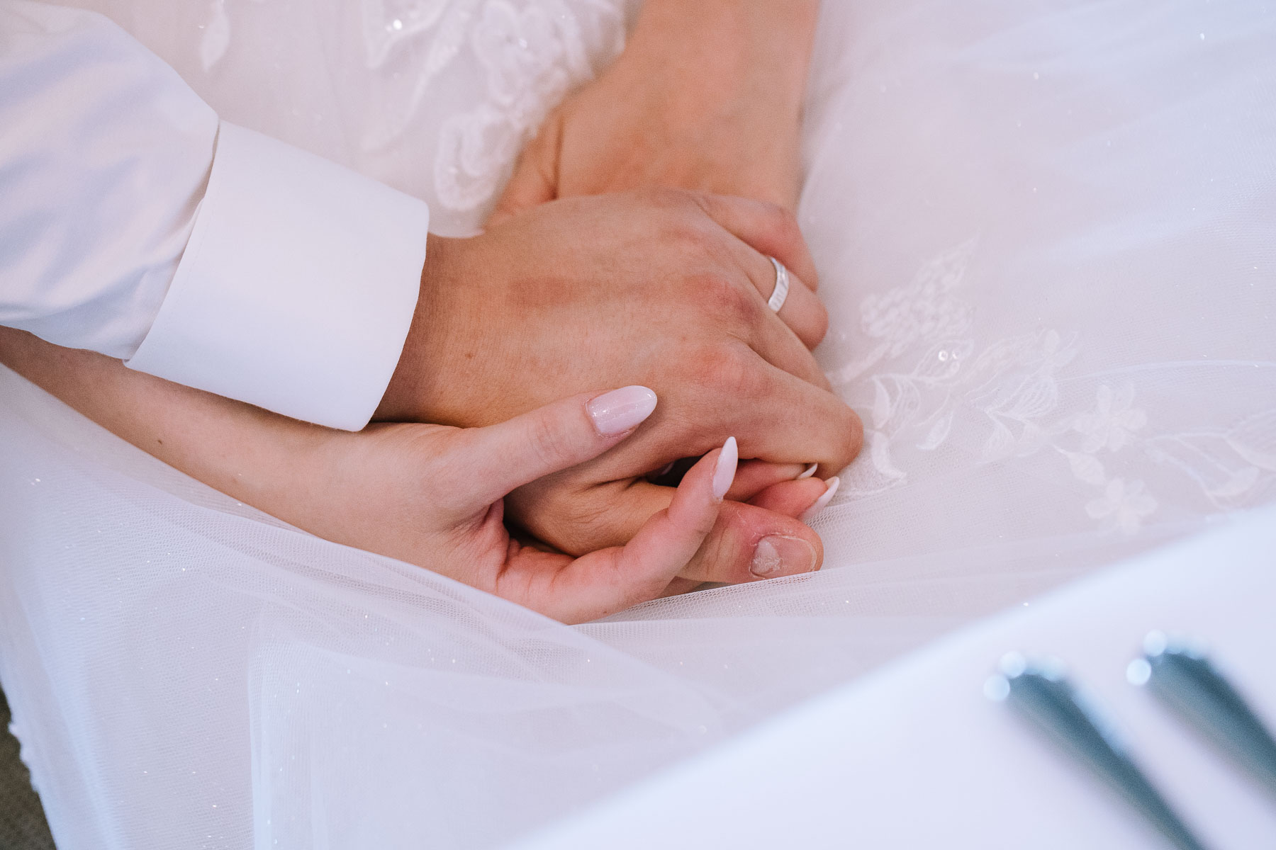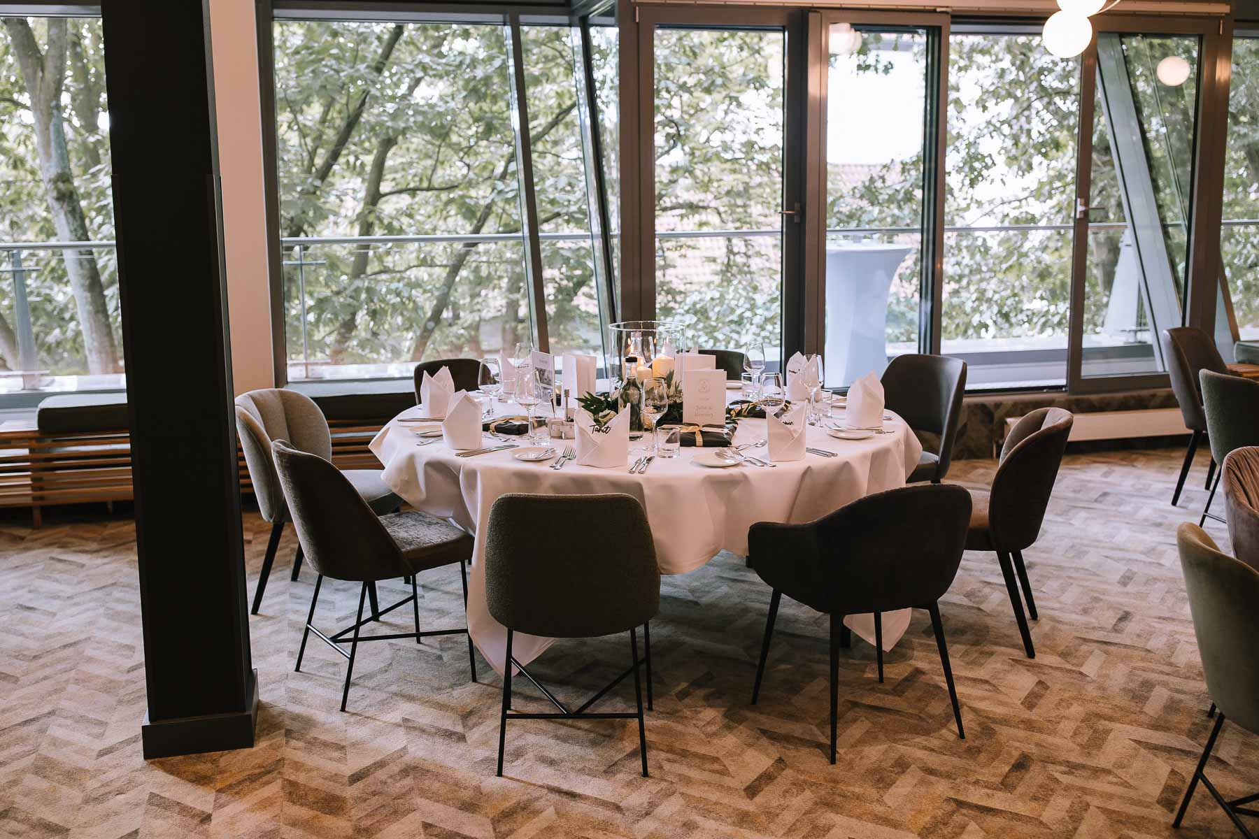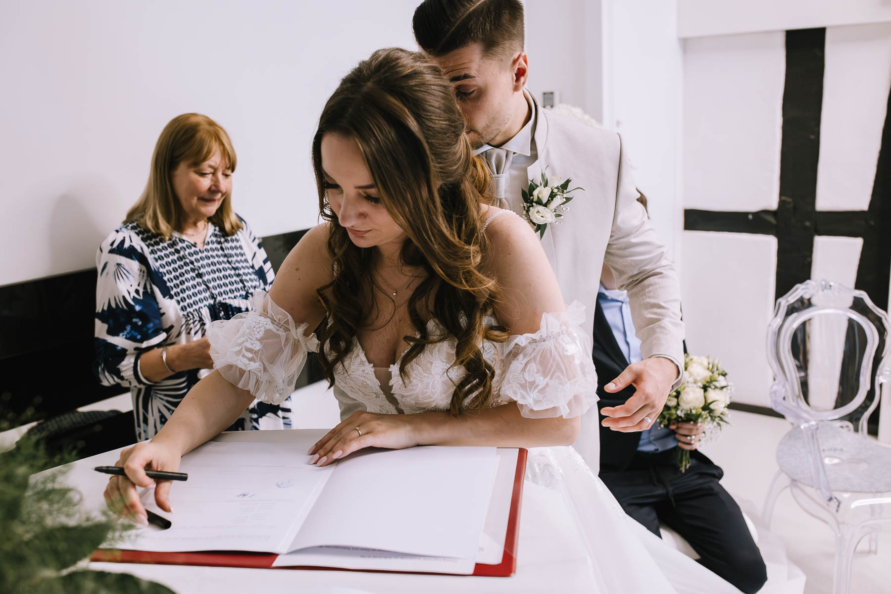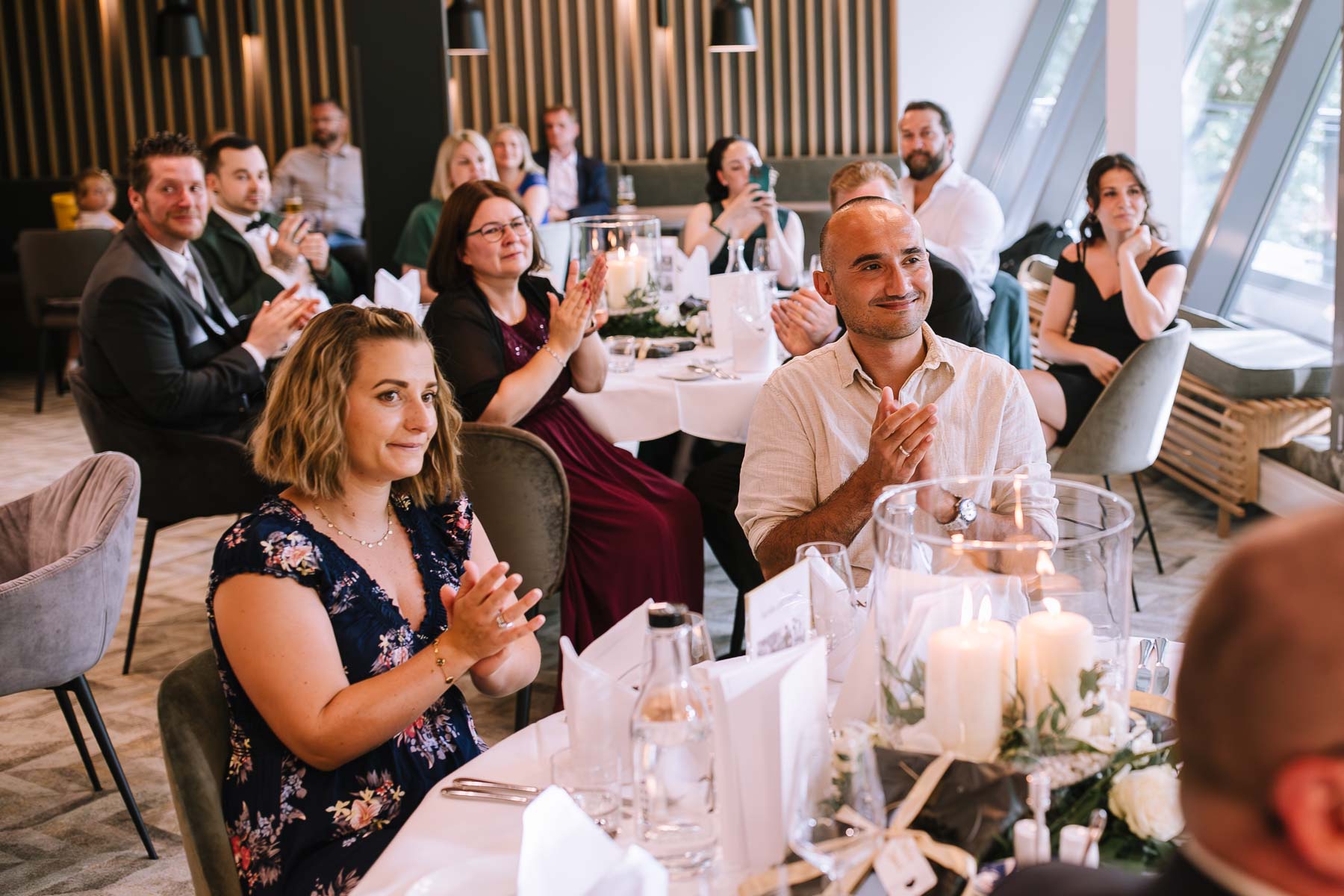 Gänsehaut pur! Nach dieser emotionalen Begegnung ging es weiter zur Freien Trauung. Der Hof Middendorf war der perfekte Ort für eine solche Zeremonie – idyllisch, ruhig, und dennoch voller Leben. Es war eine ganz persönliche, intime Atmosphäre, in der Julia und Henning sich das Ja-Wort gaben. Direkt im Anschluss an die Trauung warteten die Gäste auf das frisch vermählte Paar, und was für ein Empfang! Ein Schwarz-Gelbes Spalier! Henning ist ein riesiger BVB-Fan, und das war natürlich ein absoluter Highlight-Moment. Die Begeisterung war spürbar, als Henning voller Stolz durch das Spalier ging – und ganz nebenbei, der Clou: Im Ring von Henning ist der Signal-Iduna-Park eingraviert. Eine wahre Hommage an sein Herz für Borussia Dortmund! Nach dieser emotionalen Zeremonie fuhren wir weiter ins Hotel am Kloster in Werne. Der moderne Saal im Dachgeschoss war wirklich ein Traum. Riesige Fensterfronten, die den Raum in ein wunderschönes, warmes Licht tauchten, und der Rooftop-Balkon, von dem man einen atemberaubenden Ausblick hatte – ein ganz besonderer Ort für eine Feier, die genauso einzigartig war wie das Brautpaar selbst. Als die Gäste nach und nach eintrafen, spielte der DJ schon moderne Bachata-Musik – eine so entspannte Stimmung, die sofort alle in Feierlaune versetzte. Ich habe die Freude und das Lachen der Gäste förmlich gespürt. Man konnte die Liebe und die Freude von Julia und Henning und ihrer Familie und Freunden in jedem Moment sehen. Aber nicht nur die Stimmung war besonders, sondern auch die Reden der Väter. Beide Väter hielten Worte, die das Herz berührten. Es waren nicht nur Geschichten über die Kindheit der beiden, sondern auch tiefgründige und sehr emotionale Gedanken über die Bedeutung von Familie, Liebe und Zusammenhalt. Ich habe wirklich nicht nur mit den Augen, sondern auch mit dem Herzen fotografiert – solche Momente darf man nicht verpassen. Wenn ich an Julia und Henning denke, dann sehe ich eine Hochzeit voller Emotionen, persönlicher Details und einer unglaublichen Stimmung. Jeder Moment war einzigartig, und ich bin so dankbar, dass ich Teil dieses besonderen Tages sein durfte. Für mich als Hochzeitsfotografin gibt es kaum etwas Schöneres, als die Liebe zwischen zwei Menschen auf solche Weise festzuhalten – die zarten, emotionalen Momente genauso wie die ausgelassenen, fröhlichen Augenblicke. Ich wünsche Julia und Henning alles Liebe und freue mich, diese wunderschönen Erinnerungen für sie auf Bildern festgehalten zu haben!