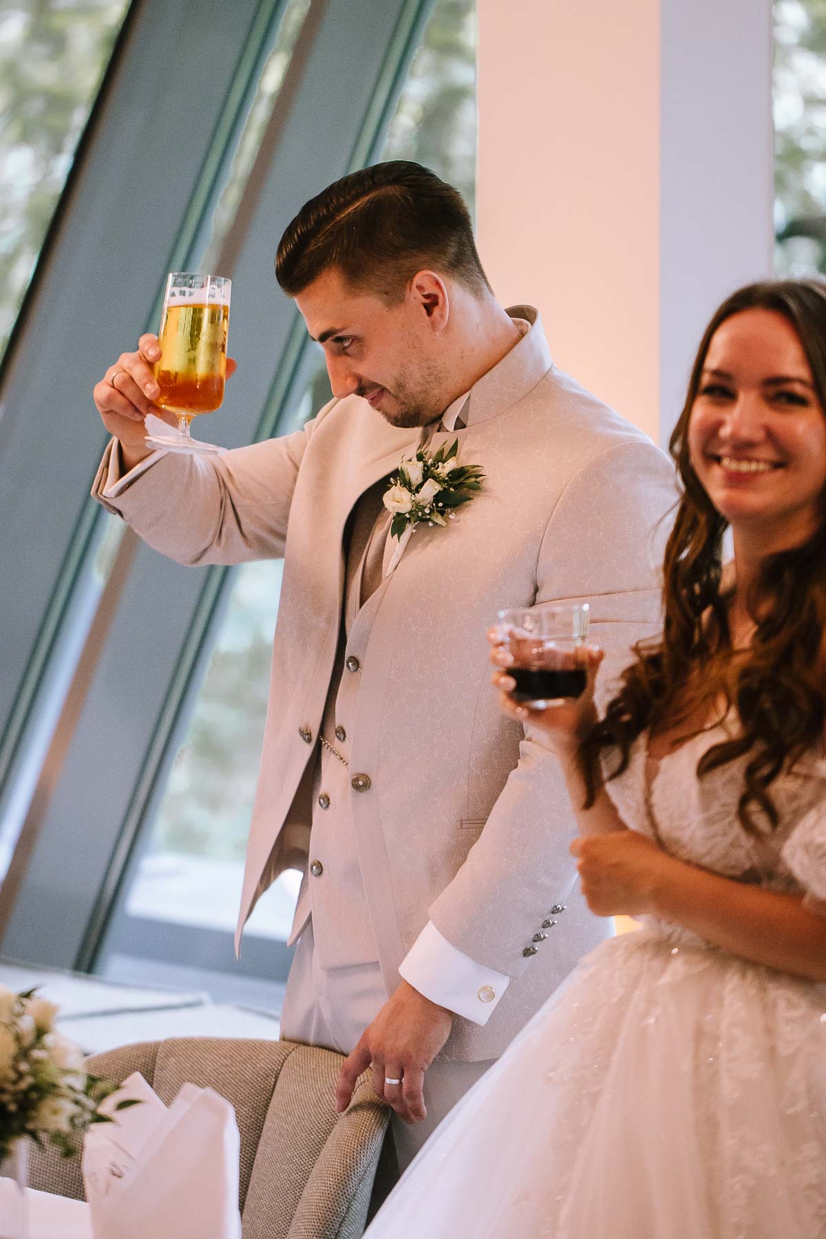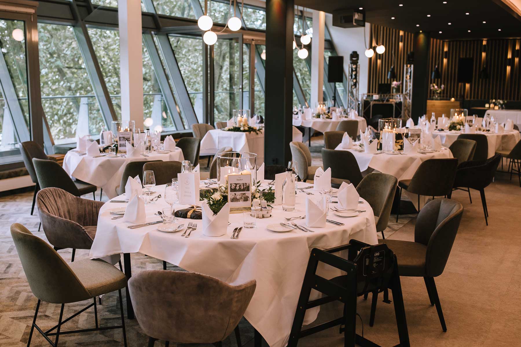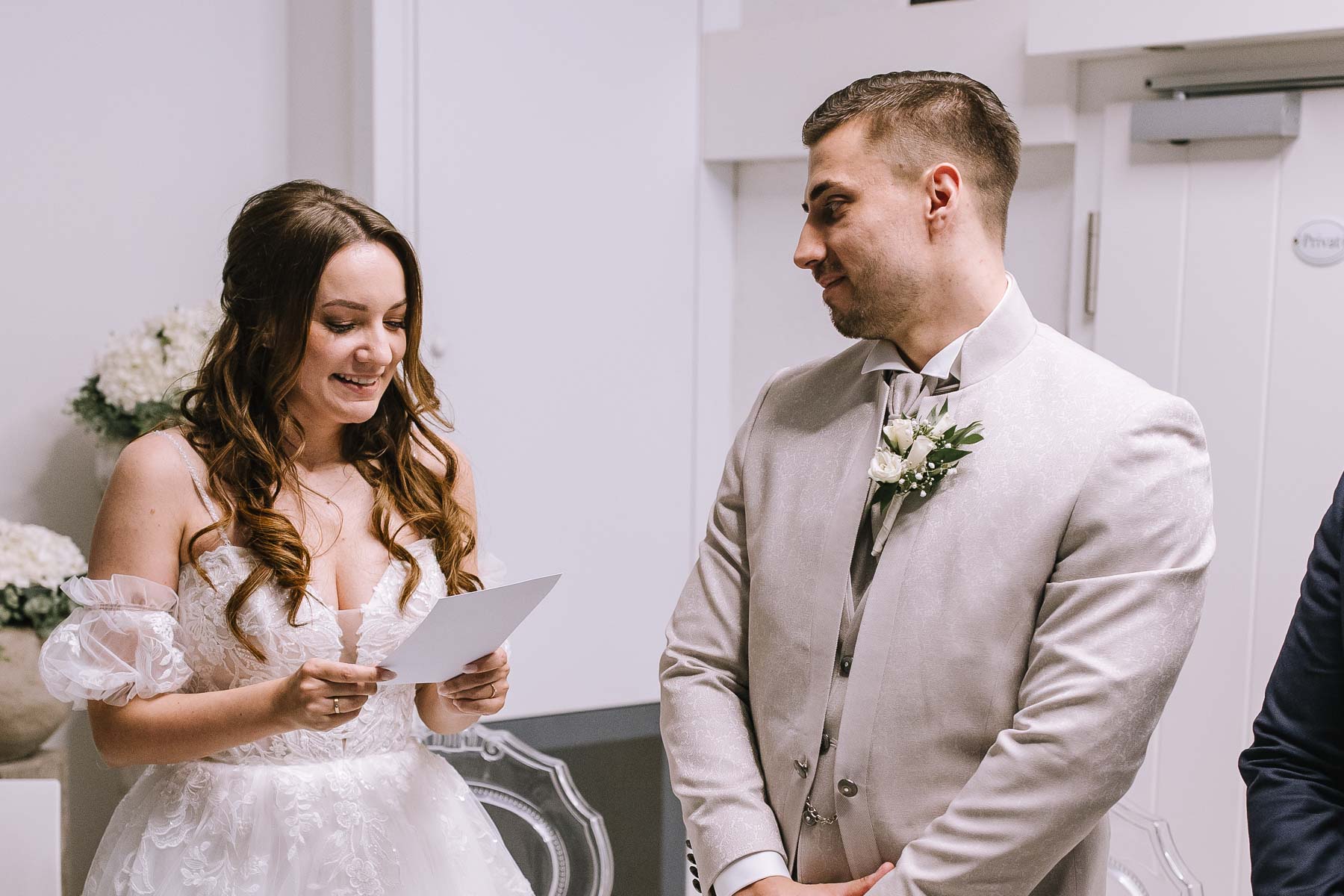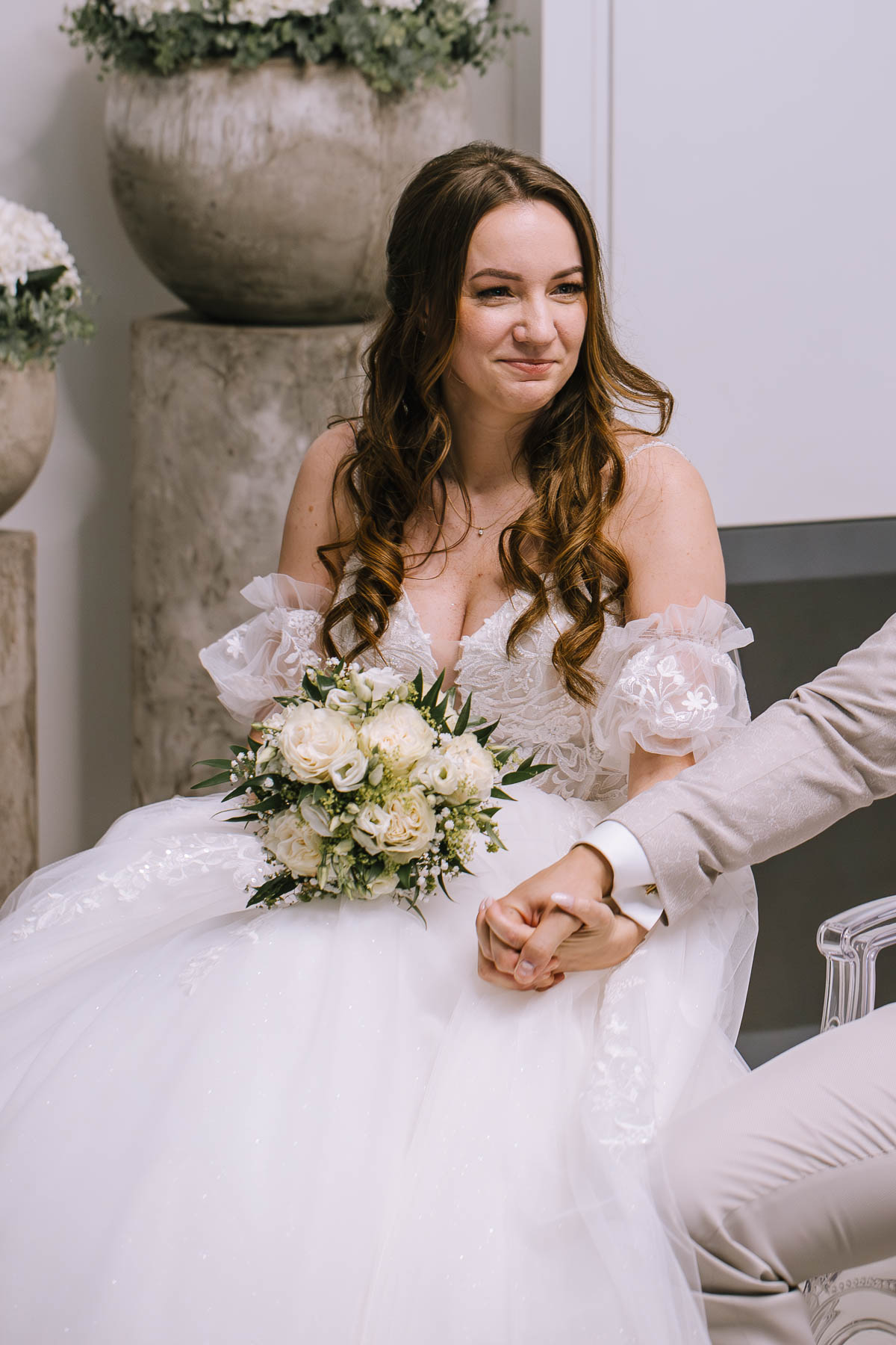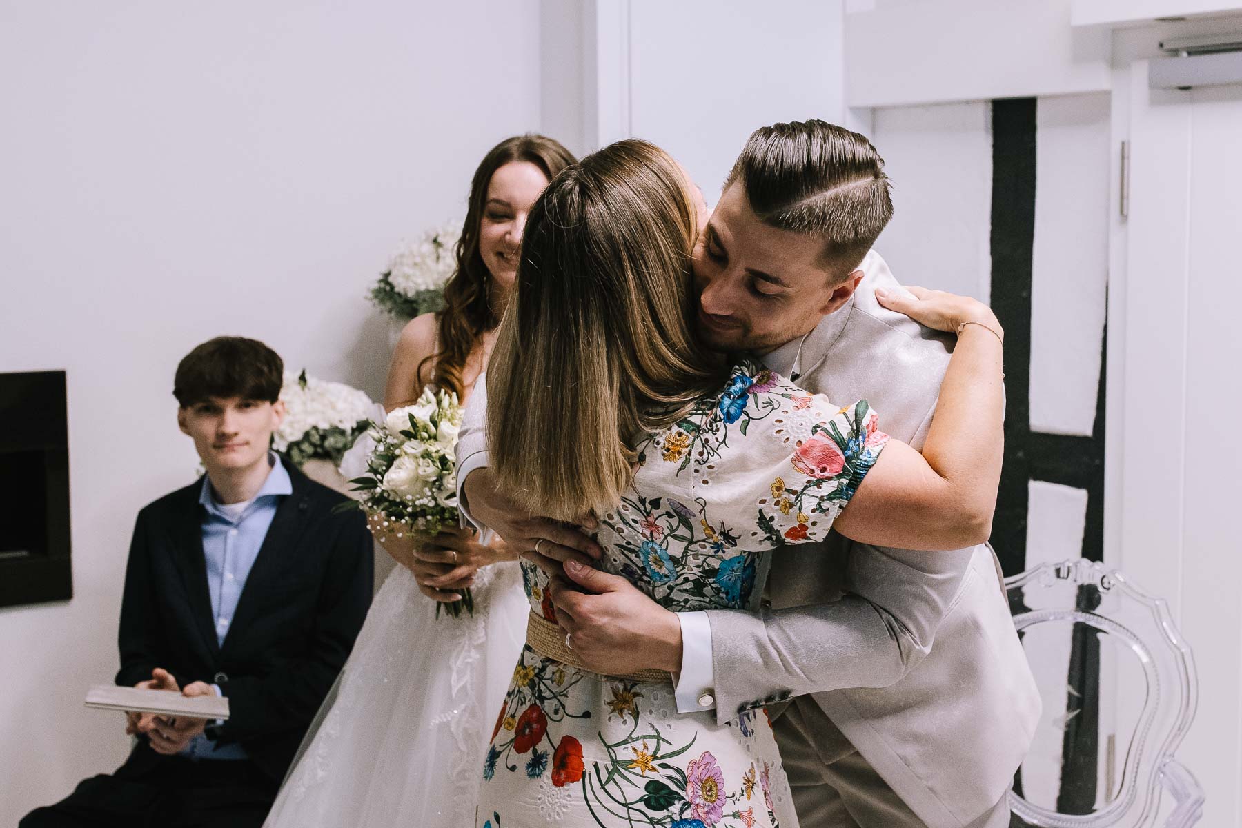 Gänsehaut pur! Nach dieser emotionalen Begegnung ging es weiter zur Freien Trauung. Der Hof Middendorf war der perfekte Ort für eine solche Zeremonie – idyllisch, ruhig, und dennoch voller Leben. Es war eine ganz persönliche, intime Atmosphäre, in der Julia und Henning sich das Ja-Wort gaben. Direkt im Anschluss an die Trauung warteten die Gäste auf das frisch vermählte Paar, und was für ein Empfang! Ein Schwarz-Gelbes Spalier! Henning ist ein riesiger BVB-Fan, und das war natürlich ein absoluter Highlight-Moment. Die Begeisterung war spürbar, als Henning voller Stolz durch das Spalier ging – und ganz nebenbei, der Clou: Im Ring von Henning ist der Signal-Iduna-Park eingraviert. Eine wahre Hommage an sein Herz für Borussia Dortmund! Nach dieser emotionalen Zeremonie fuhren wir weiter ins Hotel am Kloster in Werne. Der moderne Saal im Dachgeschoss war wirklich ein Traum. Riesige Fensterfronten, die den Raum in ein wunderschönes, warmes Licht tauchten, und der Rooftop-Balkon, von dem man einen atemberaubenden Ausblick hatte – ein ganz besonderer Ort für eine Feier, die genauso einzigartig war wie das Brautpaar selbst. Als die Gäste nach und nach eintrafen, spielte der DJ schon moderne Bachata-Musik – eine so entspannte Stimmung, die sofort alle in Feierlaune versetzte. Ich habe die Freude und das Lachen der Gäste förmlich gespürt. Man konnte die Liebe und die Freude von Julia und Henning und ihrer Familie und Freunden in jedem Moment sehen. Aber nicht nur die Stimmung war besonders, sondern auch die Reden der Väter. Beide Väter hielten Worte, die das Herz berührten. Es waren nicht nur Geschichten über die Kindheit der beiden, sondern auch tiefgründige und sehr emotionale Gedanken über die Bedeutung von Familie, Liebe und Zusammenhalt. Ich habe wirklich nicht nur mit den Augen, sondern auch mit dem Herzen fotografiert – solche Momente darf man nicht verpassen. Wenn ich an Julia und Henning denke, dann sehe ich eine Hochzeit voller Emotionen, persönlicher Details und einer unglaublichen Stimmung. Jeder Moment war einzigartig, und ich bin so dankbar, dass ich Teil dieses besonderen Tages sein durfte. Für mich als Hochzeitsfotografin gibt es kaum etwas Schöneres, als die Liebe zwischen zwei Menschen auf solche Weise festzuhalten – die zarten, emotionalen Momente genauso wie die ausgelassenen, fröhlichen Augenblicke. Ich wünsche Julia und Henning alles Liebe und freue mich, diese wunderschönen Erinnerungen für sie auf Bildern festgehalten zu haben!