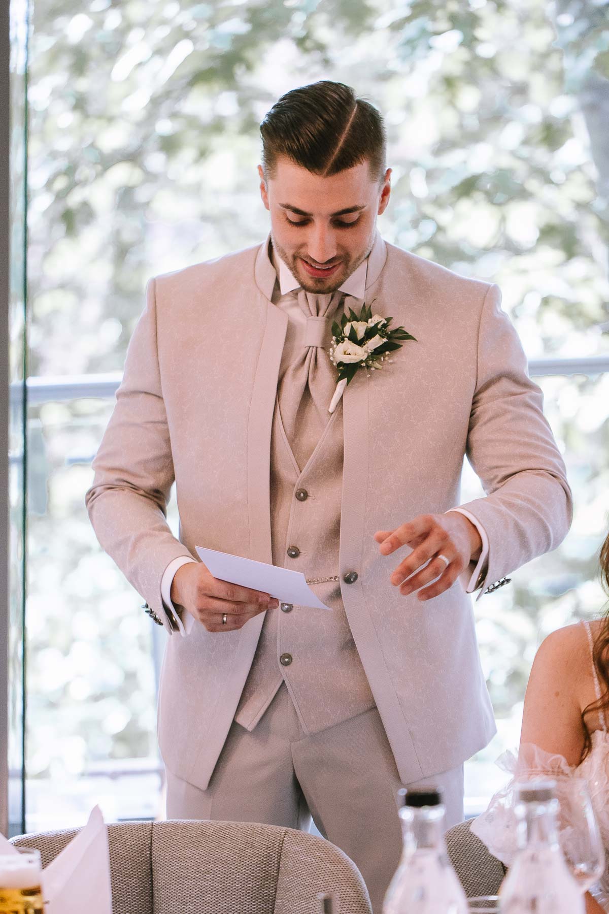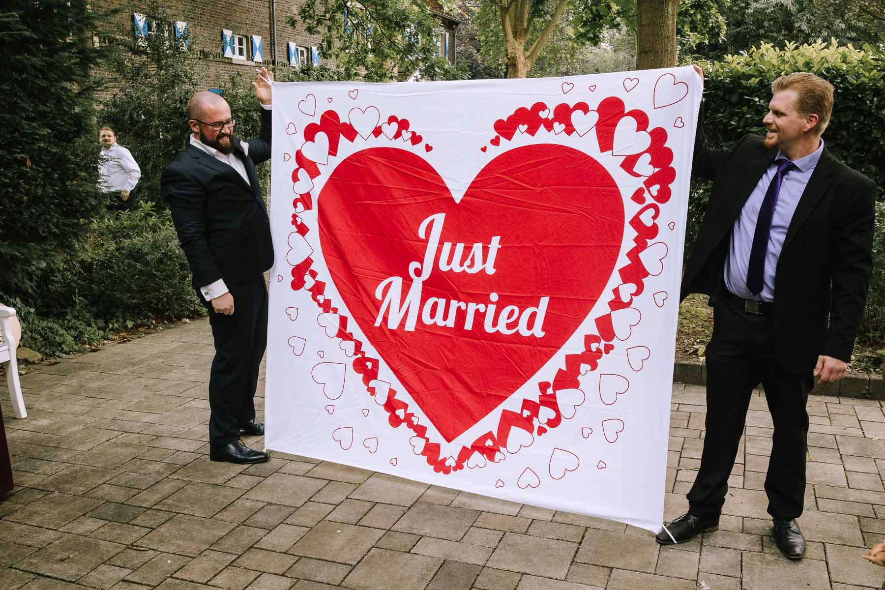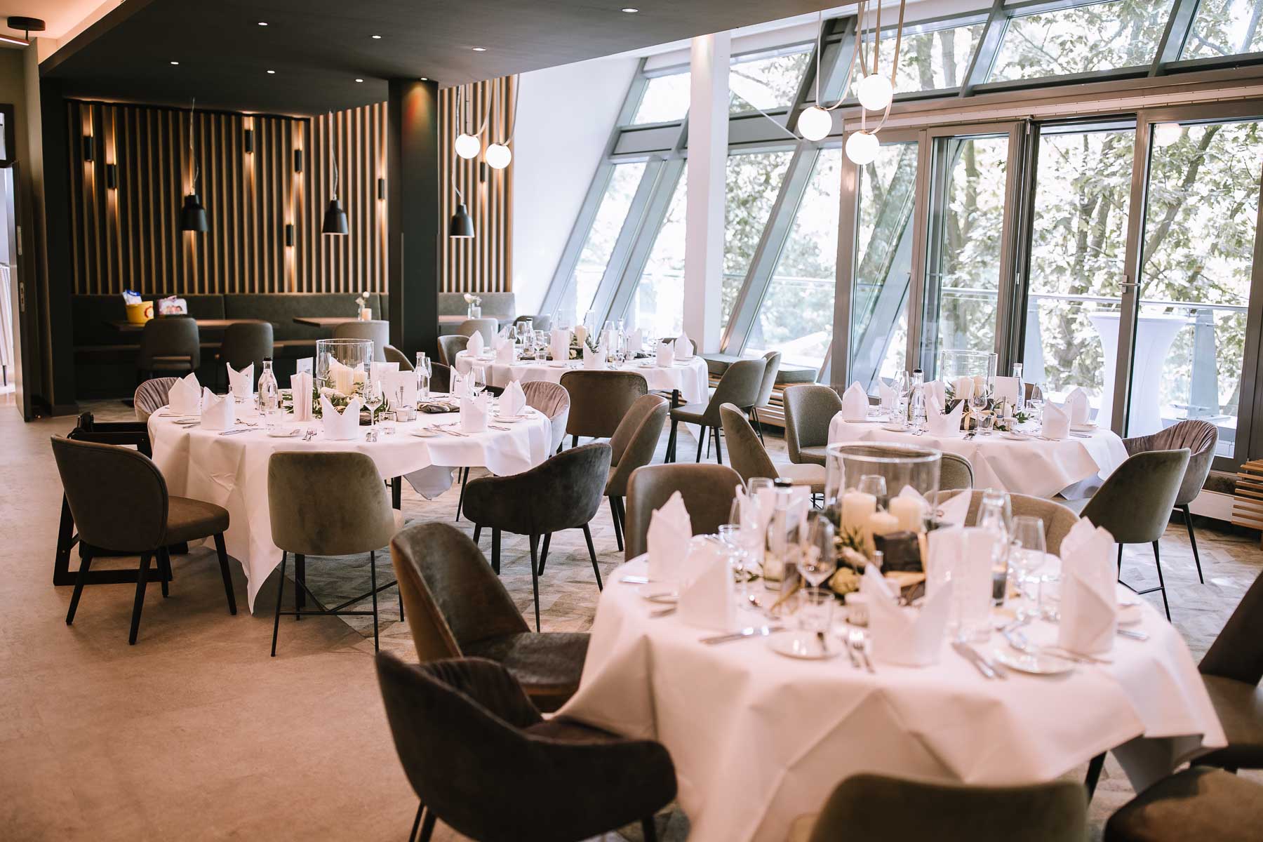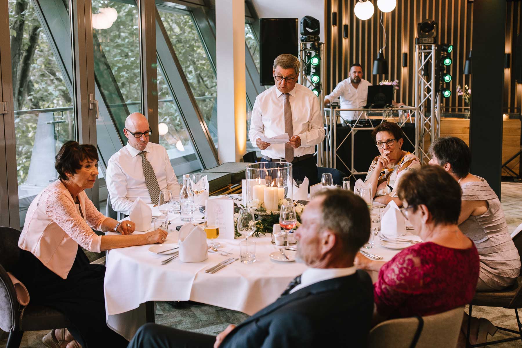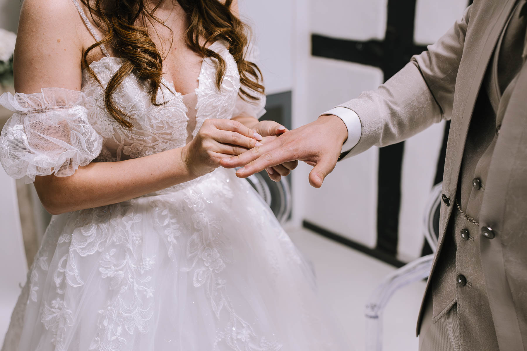 Gänsehaut pur! Nach dieser emotionalen Begegnung ging es weiter zur Freien Trauung. Der Hof Middendorf war der perfekte Ort für eine solche Zeremonie – idyllisch, ruhig, und dennoch voller Leben. Es war eine ganz persönliche, intime Atmosphäre, in der Julia und Henning sich das Ja-Wort gaben. Direkt im Anschluss an die Trauung warteten die Gäste auf das frisch vermählte Paar, und was für ein Empfang! Ein Schwarz-Gelbes Spalier! Henning ist ein riesiger BVB-Fan, und das war natürlich ein absoluter Highlight-Moment. Die Begeisterung war spürbar, als Henning voller Stolz durch das Spalier ging – und ganz nebenbei, der Clou: Im Ring von Henning ist der Signal-Iduna-Park eingraviert. Eine wahre Hommage an sein Herz für Borussia Dortmund! Nach dieser emotionalen Zeremonie fuhren wir weiter ins Hotel am Kloster in Werne. Der moderne Saal im Dachgeschoss war wirklich ein Traum. Riesige Fensterfronten, die den Raum in ein wunderschönes, warmes Licht tauchten, und der Rooftop-Balkon, von dem man einen atemberaubenden Ausblick hatte – ein ganz besonderer Ort für eine Feier, die genauso einzigartig war wie das Brautpaar selbst. Als die Gäste nach und nach eintrafen, spielte der DJ schon moderne Bachata-Musik – eine so entspannte Stimmung, die sofort alle in Feierlaune versetzte. Ich habe die Freude und das Lachen der Gäste förmlich gespürt. Man konnte die Liebe und die Freude von Julia und Henning und ihrer Familie und Freunden in jedem Moment sehen. Aber nicht nur die Stimmung war besonders, sondern auch die Reden der Väter. Beide Väter hielten Worte, die das Herz berührten. Es waren nicht nur Geschichten über die Kindheit der beiden, sondern auch tiefgründige und sehr emotionale Gedanken über die Bedeutung von Familie, Liebe und Zusammenhalt. Ich habe wirklich nicht nur mit den Augen, sondern auch mit dem Herzen fotografiert – solche Momente darf man nicht verpassen. Wenn ich an Julia und Henning denke, dann sehe ich eine Hochzeit voller Emotionen, persönlicher Details und einer unglaublichen Stimmung. Jeder Moment war einzigartig, und ich bin so dankbar, dass ich Teil dieses besonderen Tages sein durfte. Für mich als Hochzeitsfotografin gibt es kaum etwas Schöneres, als die Liebe zwischen zwei Menschen auf solche Weise festzuhalten – die zarten, emotionalen Momente genauso wie die ausgelassenen, fröhlichen Augenblicke. Ich wünsche Julia und Henning alles Liebe und freue mich, diese wunderschönen Erinnerungen für sie auf Bildern festgehalten zu haben!