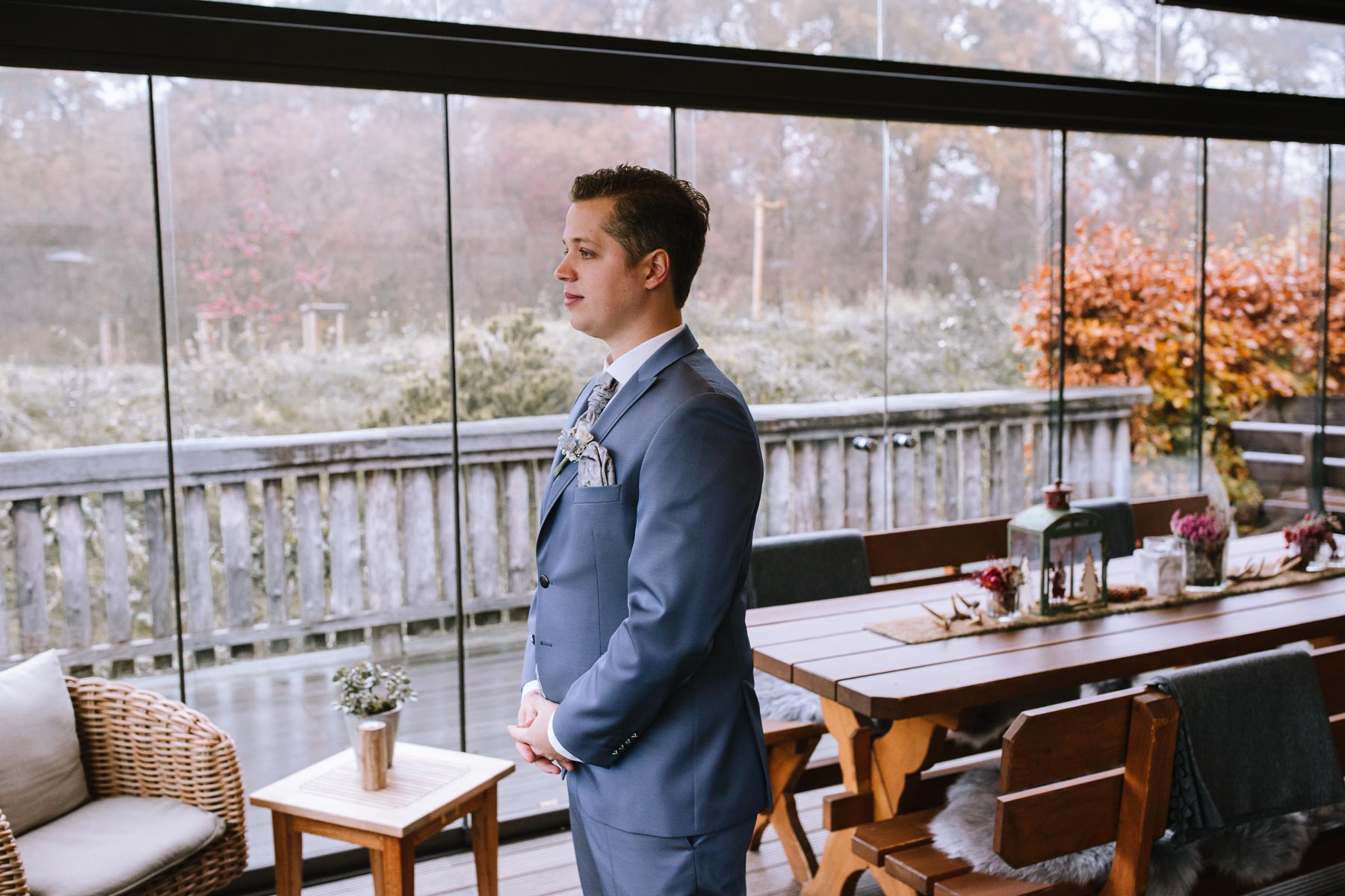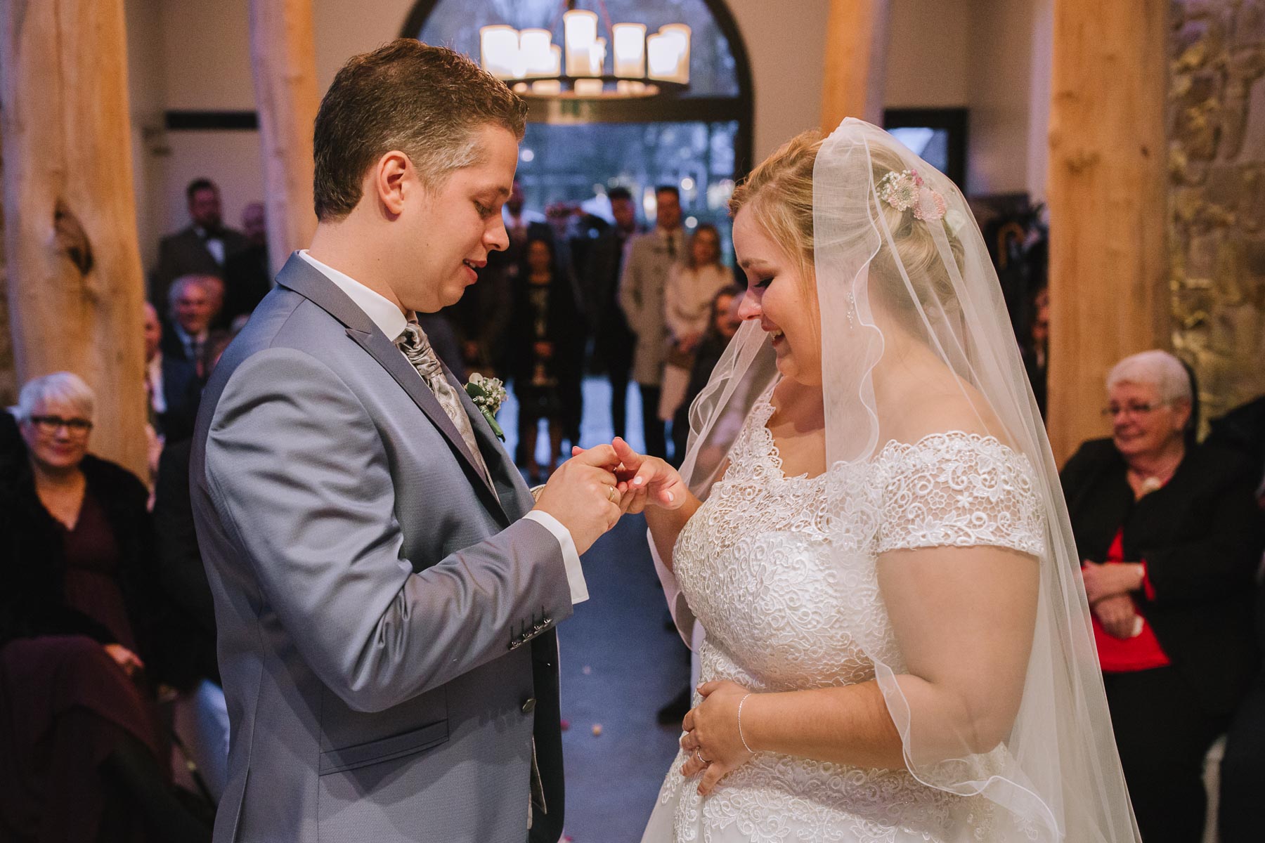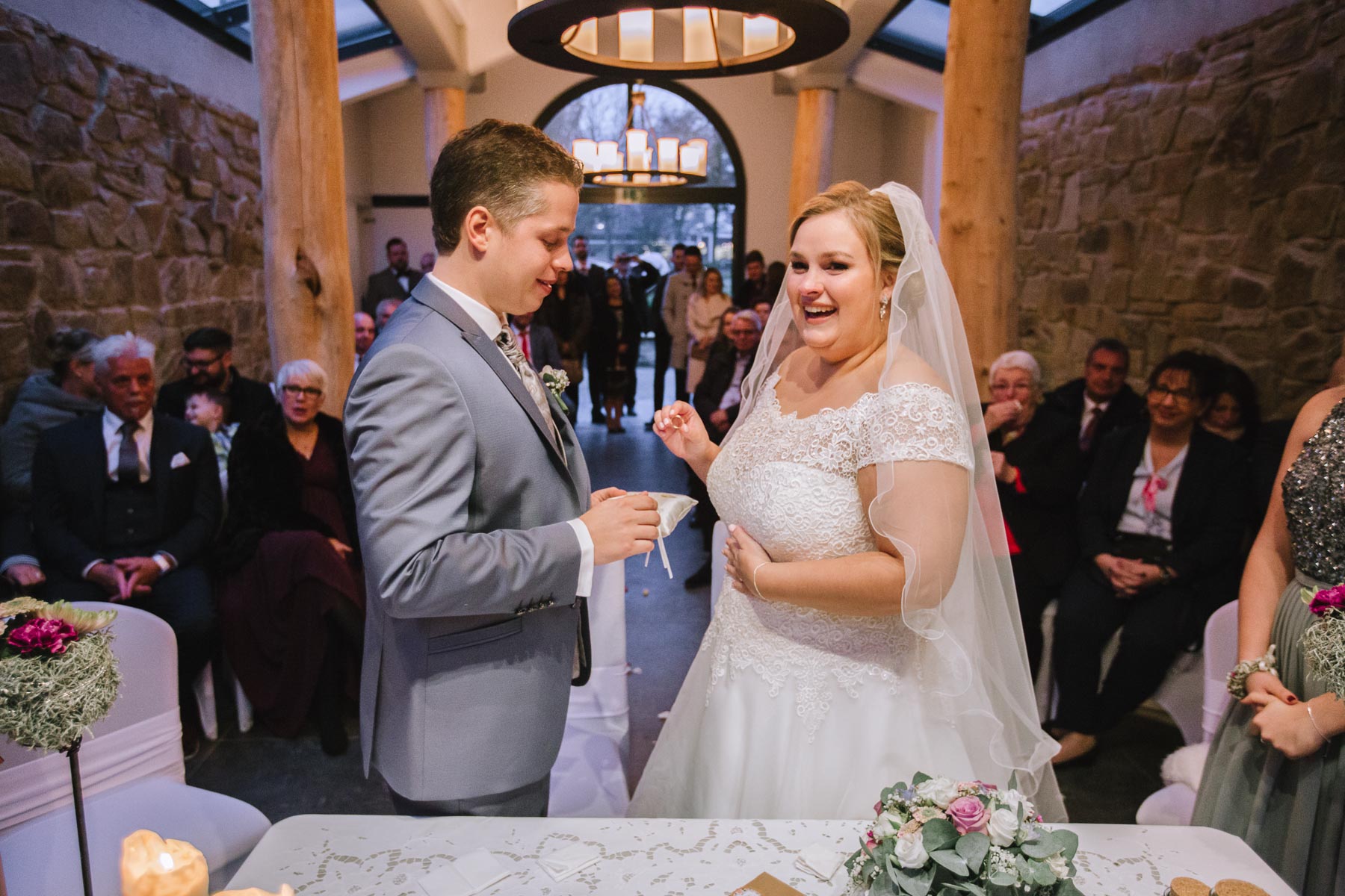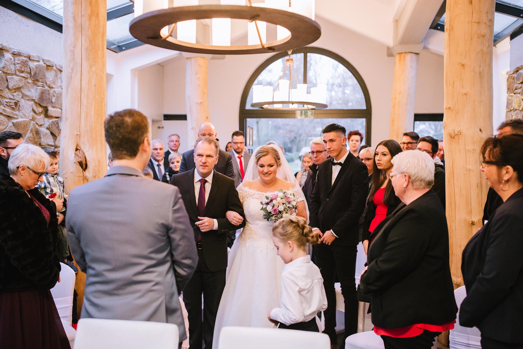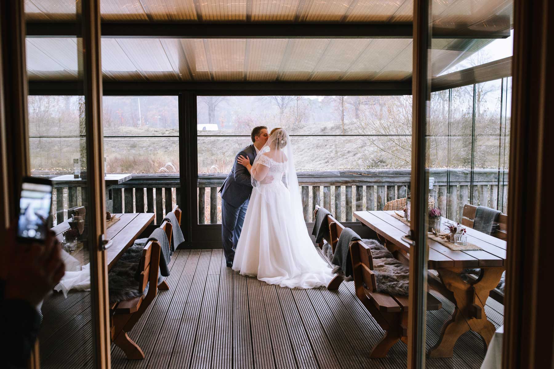 Währenddessen sahen wir schon durch das Fenster, dass Sascha sich bereits auf den Weg zur Ernst-August-Hütte gemacht hatte, wo der First Look stattfinden sollte. Leider herrschte draußen ein ungemütlicher Mix aus Nieselregen, Schneeregen und Nebel. Aus diesem Grund haben wir das Shooting nach drinnen verlegt. Und dann war es auch soweit: bereits auf dem Weg, den wir mit transparenten Regenschirmen beschritten, stieg die Spannung immer mehr. Angekommen in der Hütte war es dann soweit und eines kann ich euch sagen: es war ein First Look, wie er im Buche steht. Das Aufeinandertreffen war sooo emotional – einfach nur wunderschön. Und auch die Trauung im Confideum des Landhotels Voshövel war voller aufregender und emotionaler Momente. Nach der Trauung gingen wir dann in den Pavillon, wo die Feier stattfand. Nach dem köstlichen Essen mit Hochzeitstorte als Dessert, Feuershow, einem perfekt einstudierten Hochzeitstanz und einem Late-Night-Shooting, ging es für mich dann zurück ins Sauerland. Vielen Dank Anna und Sascha für die vielen tollen Momente!