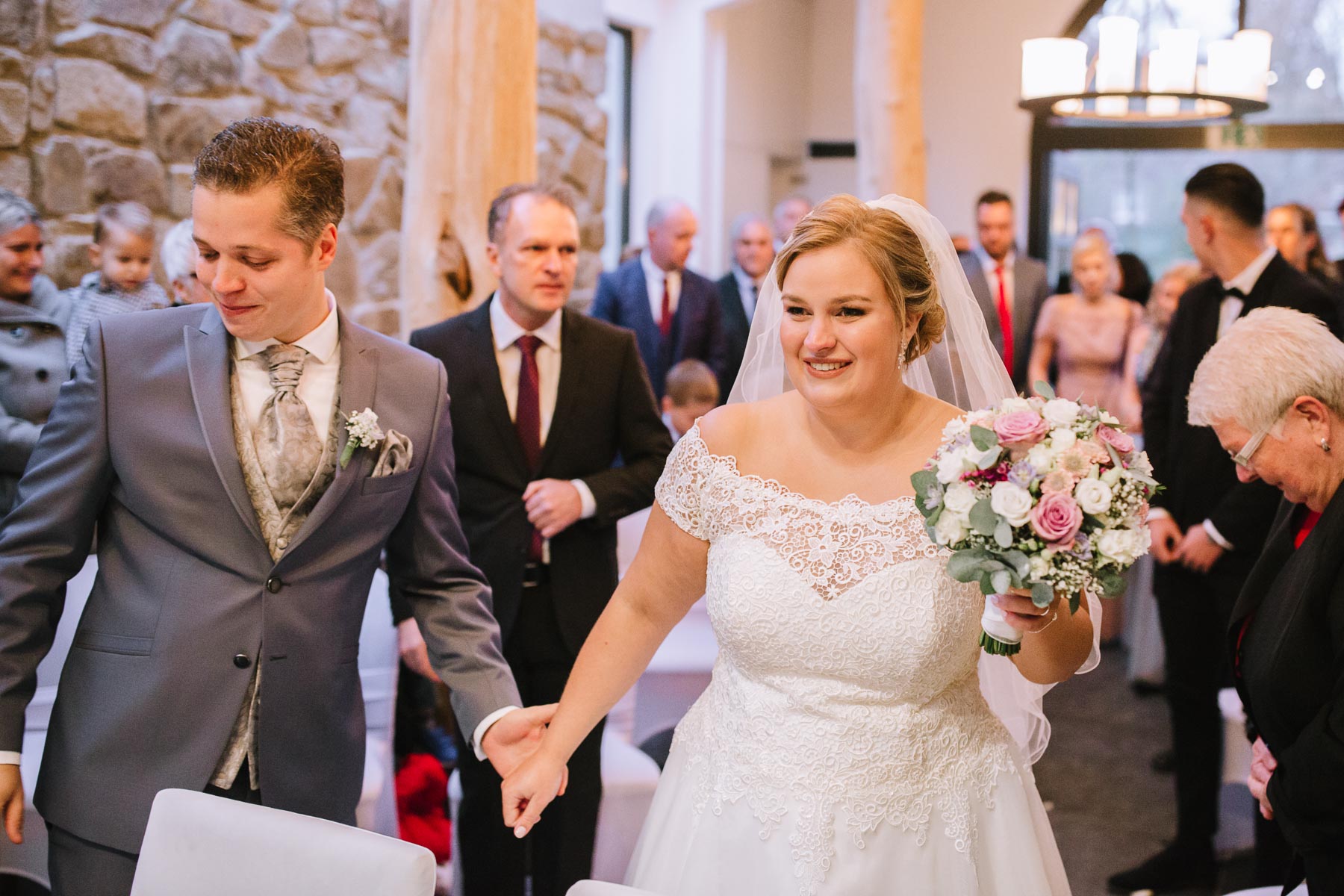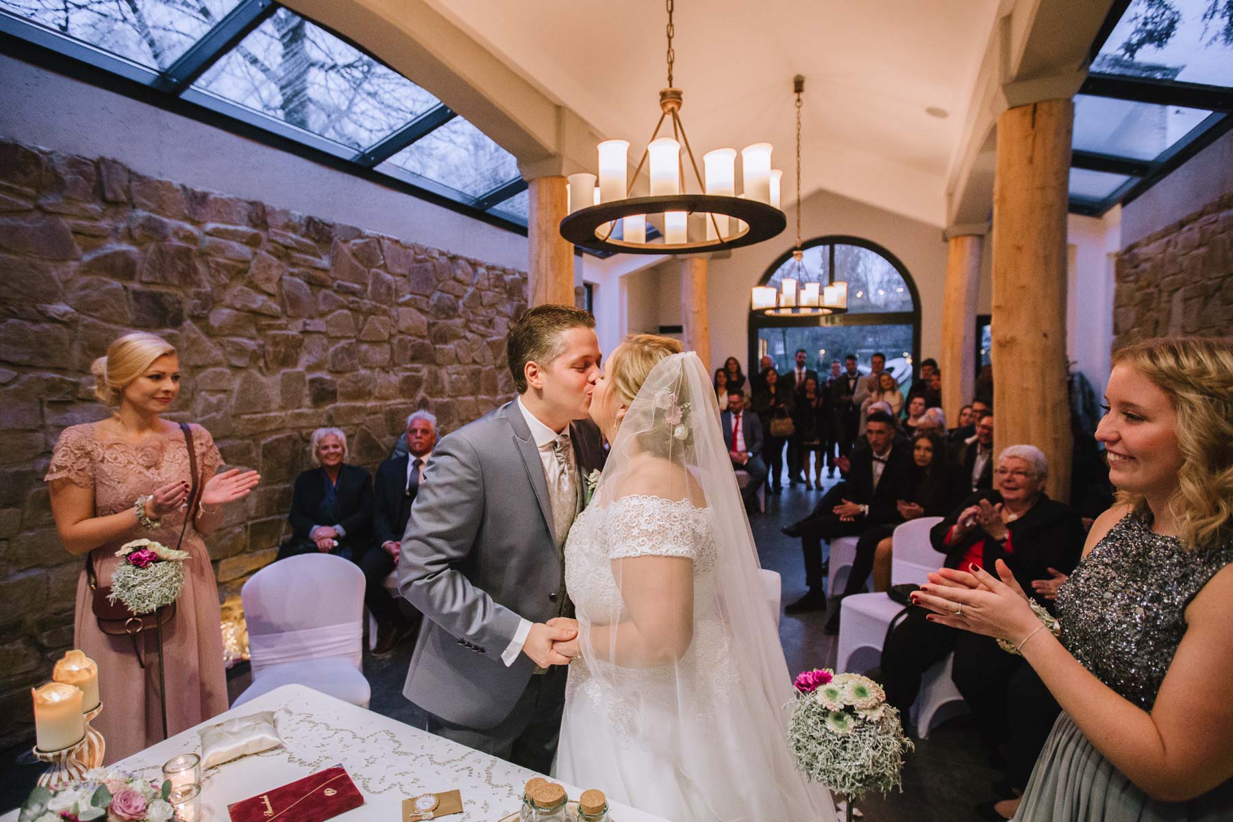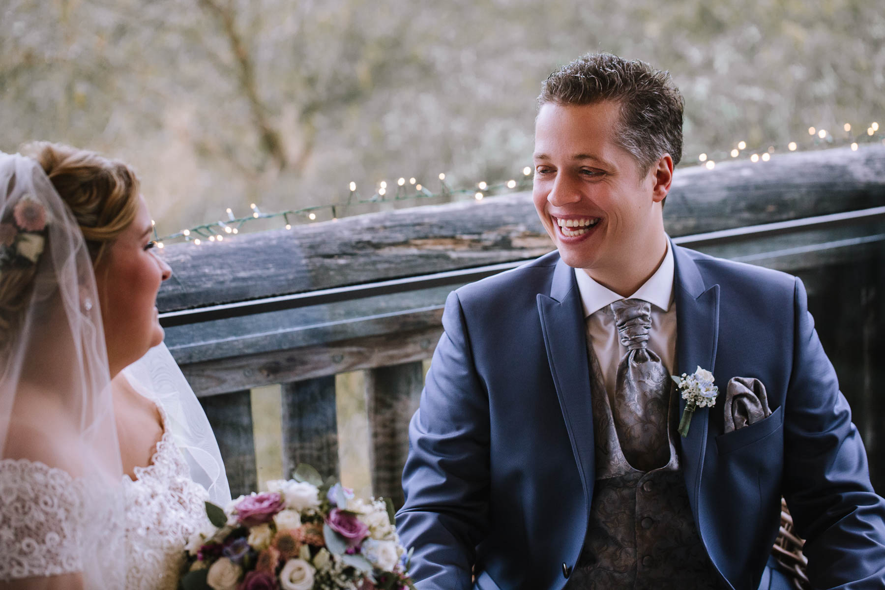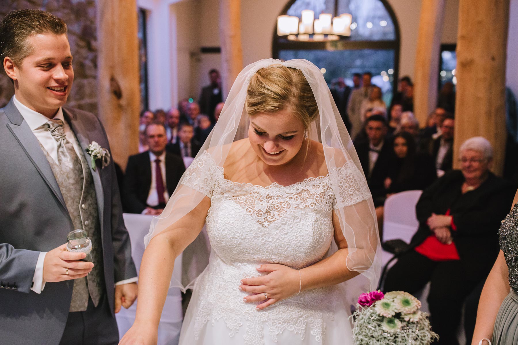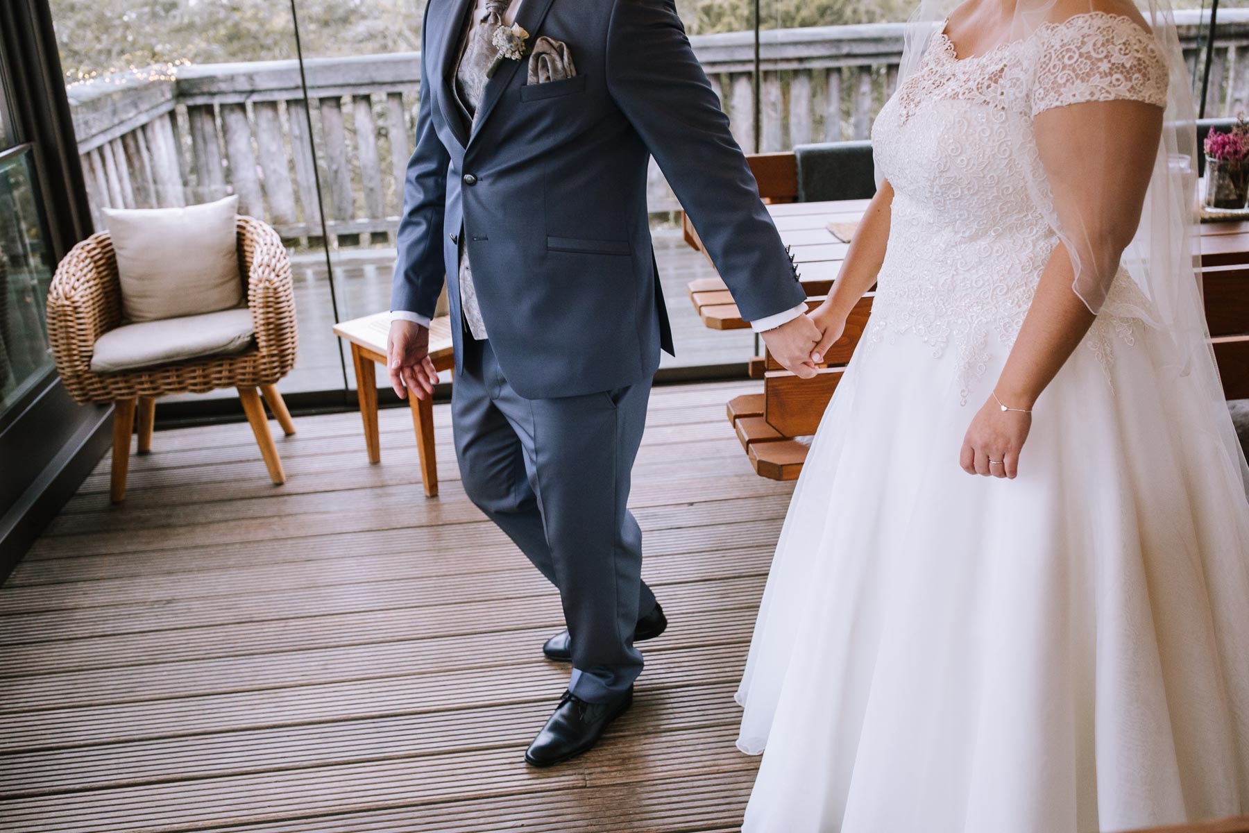 Währenddessen sahen wir schon durch das Fenster, dass Sascha sich bereits auf den Weg zur Ernst-August-Hütte gemacht hatte, wo der First Look stattfinden sollte. Leider herrschte draußen ein ungemütlicher Mix aus Nieselregen, Schneeregen und Nebel. Aus diesem Grund haben wir das Shooting nach drinnen verlegt. Und dann war es auch soweit: bereits auf dem Weg, den wir mit transparenten Regenschirmen beschritten, stieg die Spannung immer mehr. Angekommen in der Hütte war es dann soweit und eines kann ich euch sagen: es war ein First Look, wie er im Buche steht. Das Aufeinandertreffen war sooo emotional – einfach nur wunderschön. Und auch die Trauung im Confideum des Landhotels Voshövel war voller aufregender und emotionaler Momente. Nach der Trauung gingen wir dann in den Pavillon, wo die Feier stattfand. Nach dem köstlichen Essen mit Hochzeitstorte als Dessert, Feuershow, einem perfekt einstudierten Hochzeitstanz und einem Late-Night-Shooting, ging es für mich dann zurück ins Sauerland. Vielen Dank Anna und Sascha für die vielen tollen Momente!