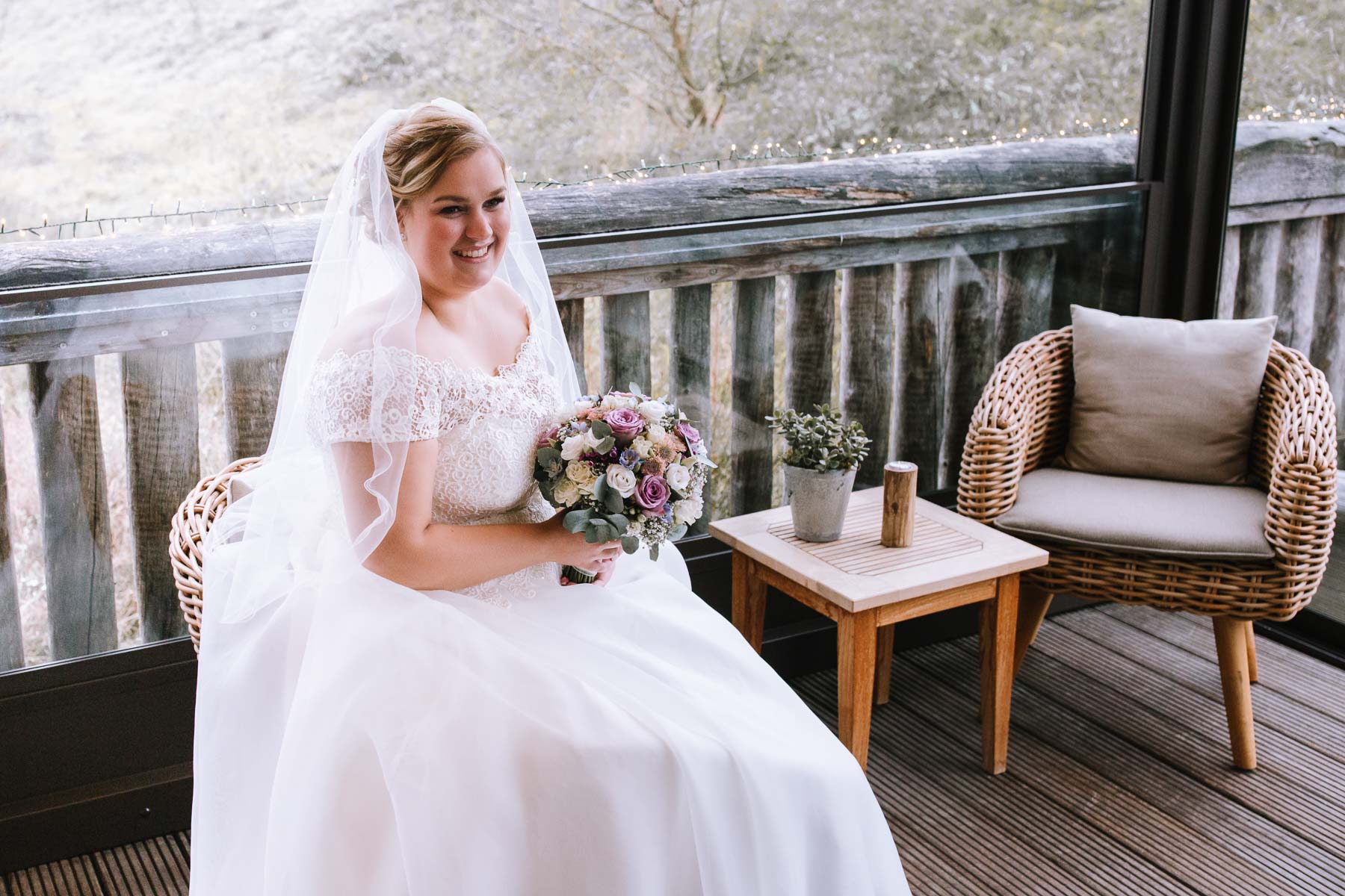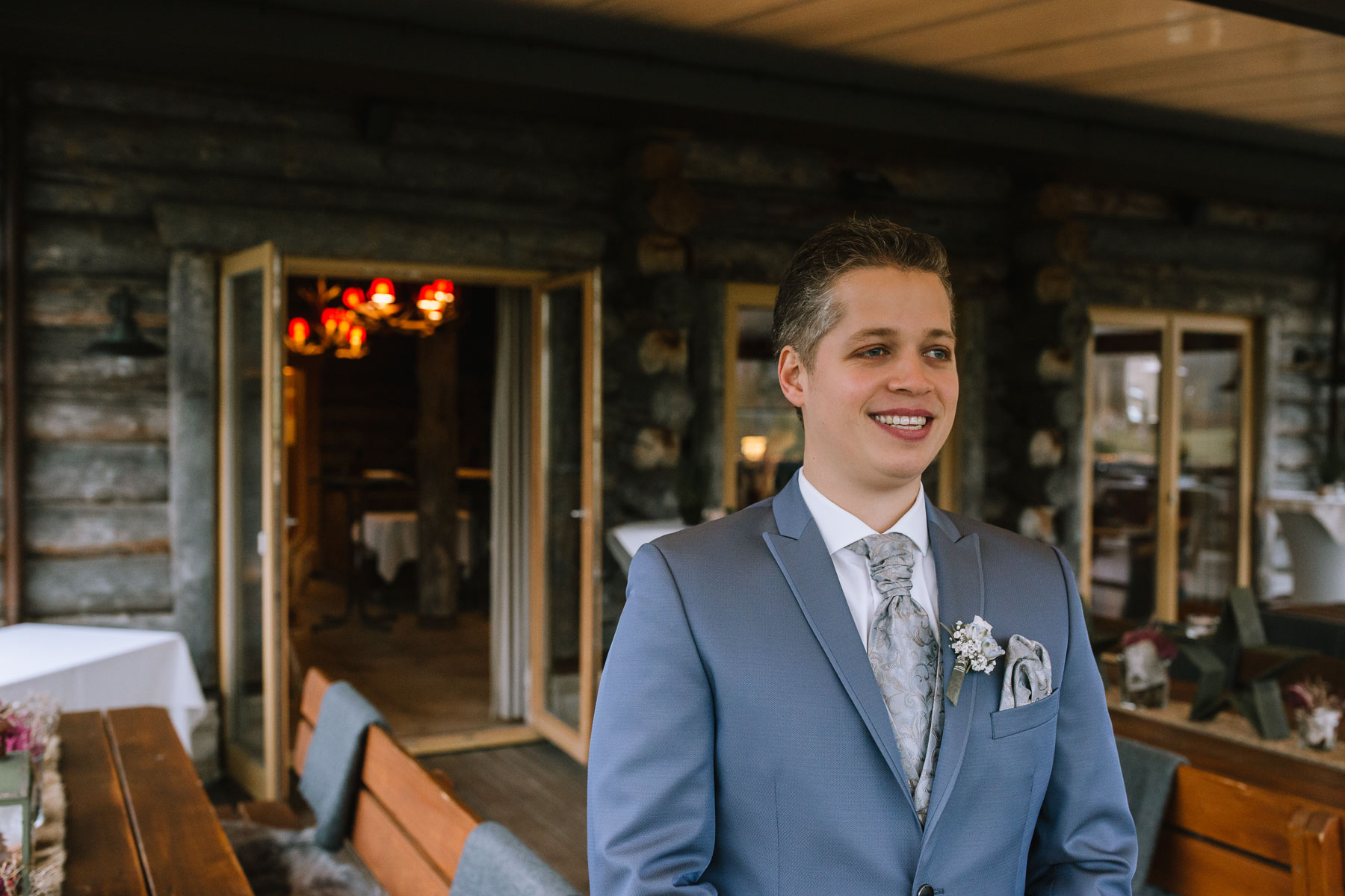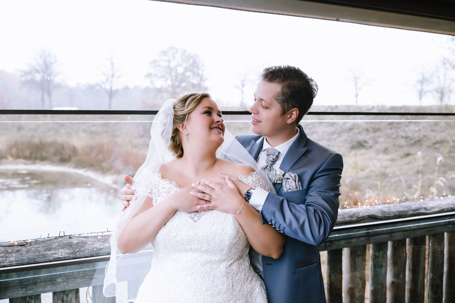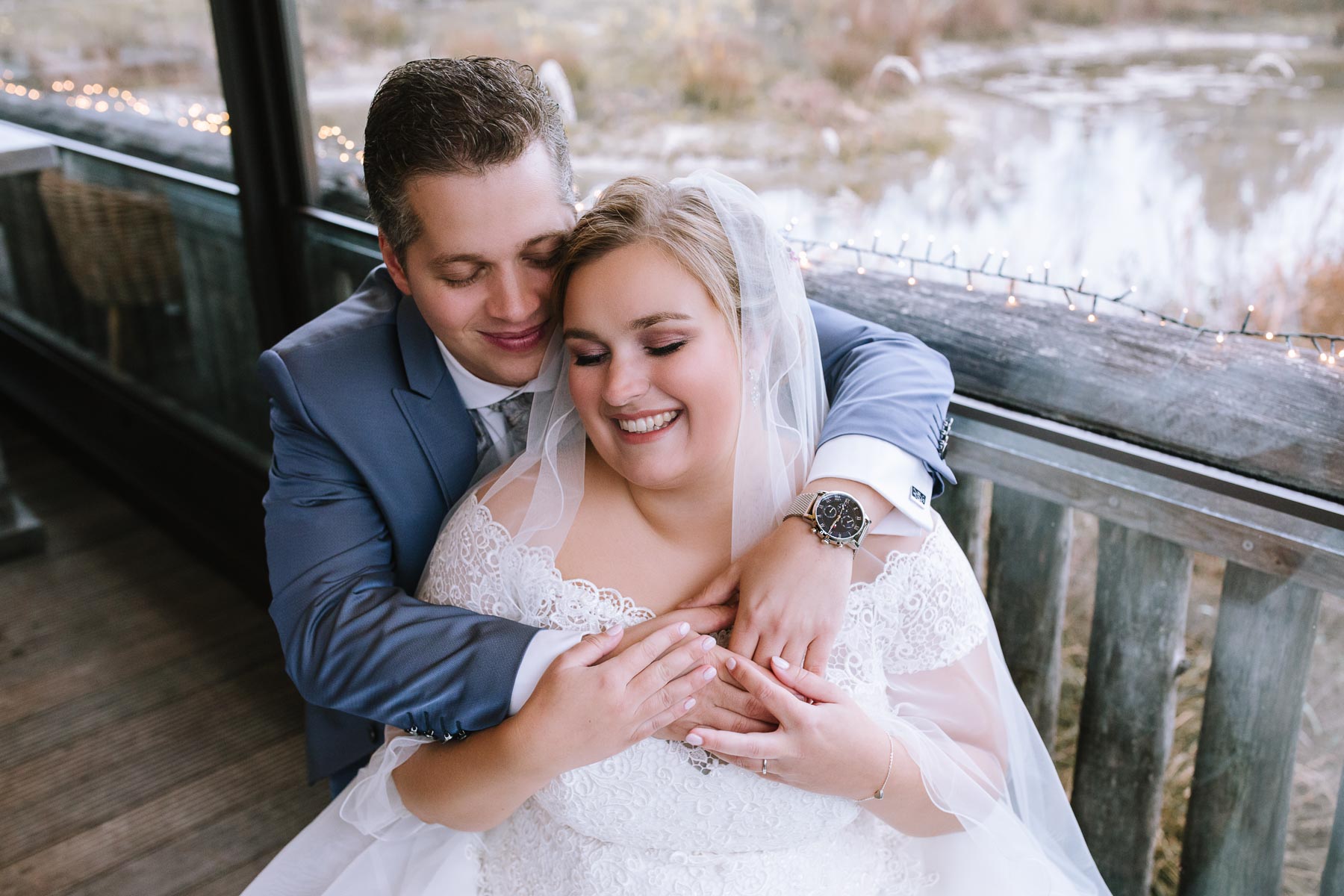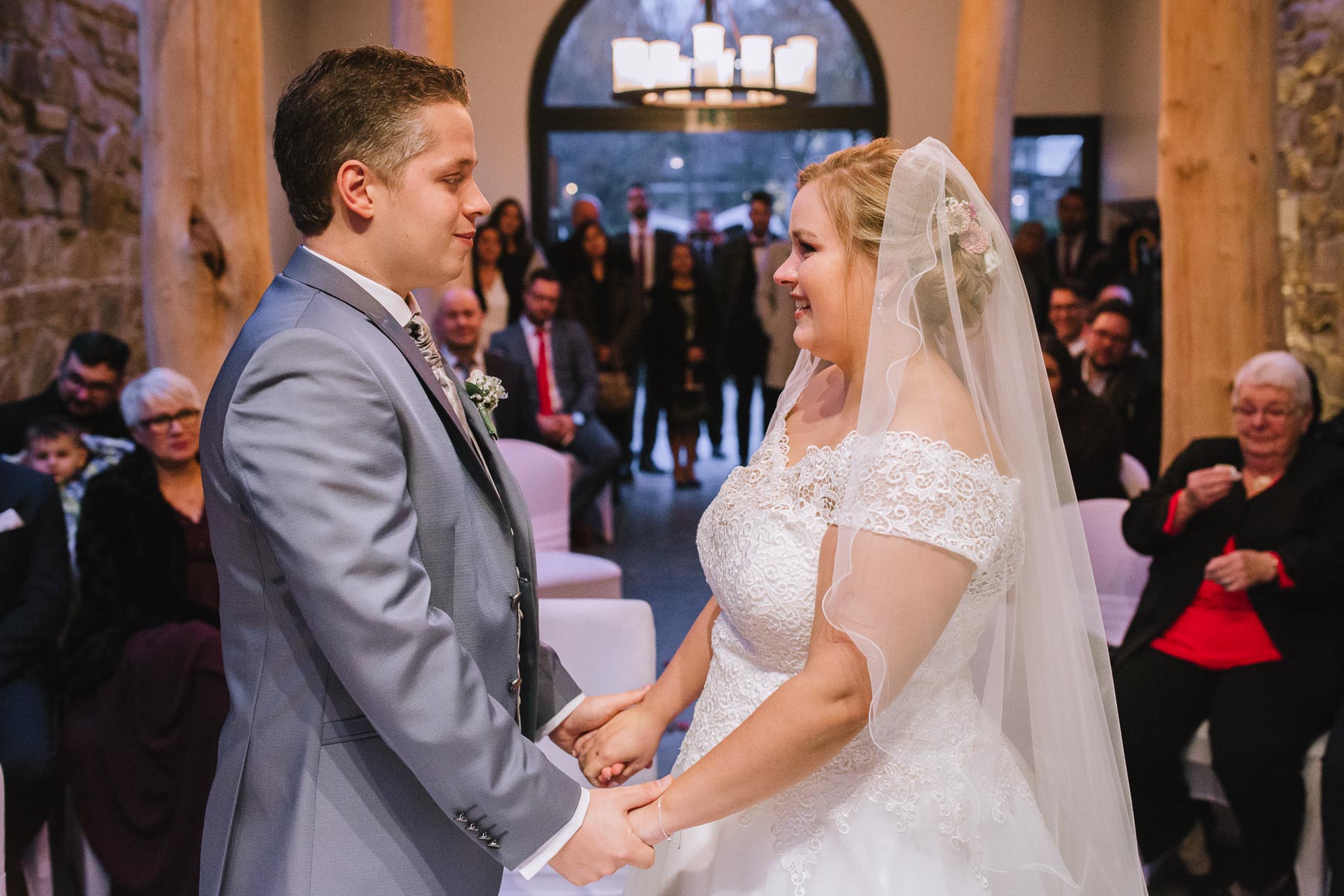 Währenddessen sahen wir schon durch das Fenster, dass Sascha sich bereits auf den Weg zur Ernst-August-Hütte gemacht hatte, wo der First Look stattfinden sollte. Leider herrschte draußen ein ungemütlicher Mix aus Nieselregen, Schneeregen und Nebel. Aus diesem Grund haben wir das Shooting nach drinnen verlegt. Und dann war es auch soweit: bereits auf dem Weg, den wir mit transparenten Regenschirmen beschritten, stieg die Spannung immer mehr. Angekommen in der Hütte war es dann soweit und eines kann ich euch sagen: es war ein First Look, wie er im Buche steht. Das Aufeinandertreffen war sooo emotional – einfach nur wunderschön. Und auch die Trauung im Confideum des Landhotels Voshövel war voller aufregender und emotionaler Momente. Nach der Trauung gingen wir dann in den Pavillon, wo die Feier stattfand. Nach dem köstlichen Essen mit Hochzeitstorte als Dessert, Feuershow, einem perfekt einstudierten Hochzeitstanz und einem Late-Night-Shooting, ging es für mich dann zurück ins Sauerland. Vielen Dank Anna und Sascha für die vielen tollen Momente!