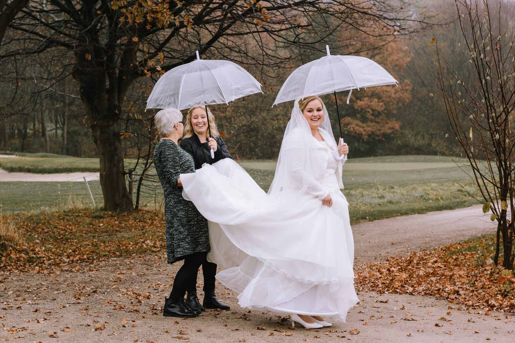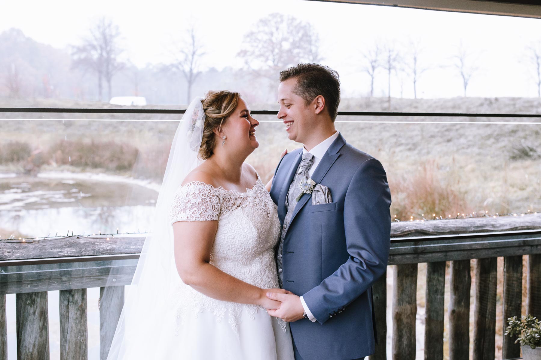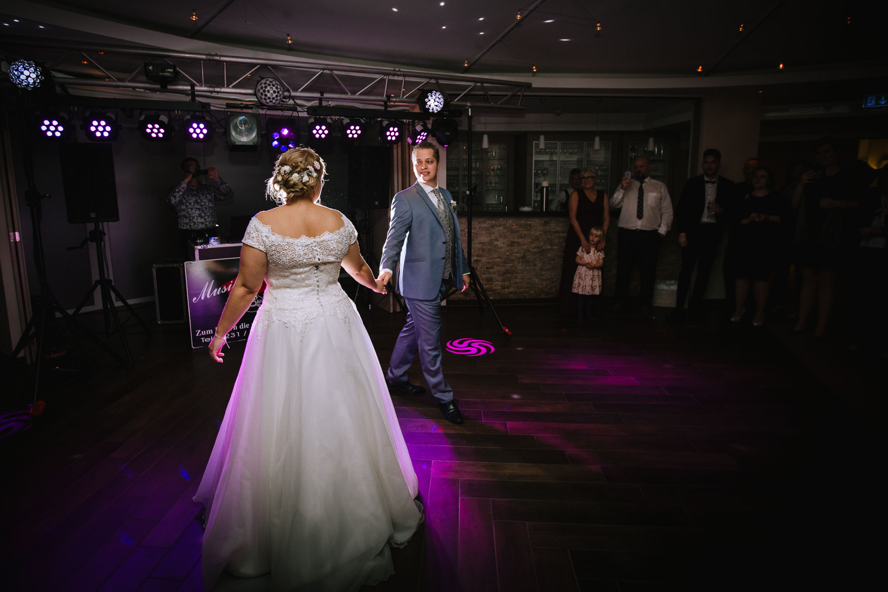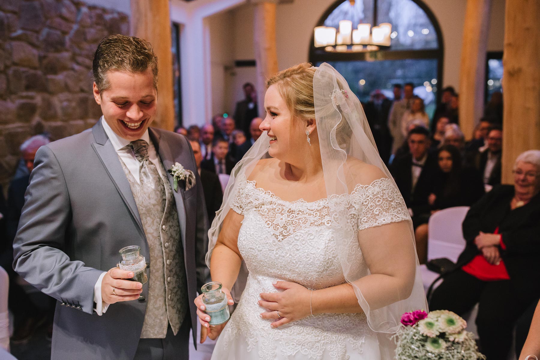 Währenddessen sahen wir schon durch das Fenster, dass Sascha sich bereits auf den Weg zur Ernst-August-Hütte gemacht hatte, wo der First Look stattfinden sollte. Leider herrschte draußen ein ungemütlicher Mix aus Nieselregen, Schneeregen und Nebel. Aus diesem Grund haben wir das Shooting nach drinnen verlegt. Und dann war es auch soweit: bereits auf dem Weg, den wir mit transparenten Regenschirmen beschritten, stieg die Spannung immer mehr. Angekommen in der Hütte war es dann soweit und eines kann ich euch sagen: es war ein First Look, wie er im Buche steht. Das Aufeinandertreffen war sooo emotional – einfach nur wunderschön. Und auch die Trauung im Confideum des Landhotels Voshövel war voller aufregender und emotionaler Momente. Nach der Trauung gingen wir dann in den Pavillon, wo die Feier stattfand. Nach dem köstlichen Essen mit Hochzeitstorte als Dessert, Feuershow, einem perfekt einstudierten Hochzeitstanz und einem Late-Night-Shooting, ging es für mich dann zurück ins Sauerland. Vielen Dank Anna und Sascha für die vielen tollen Momente!