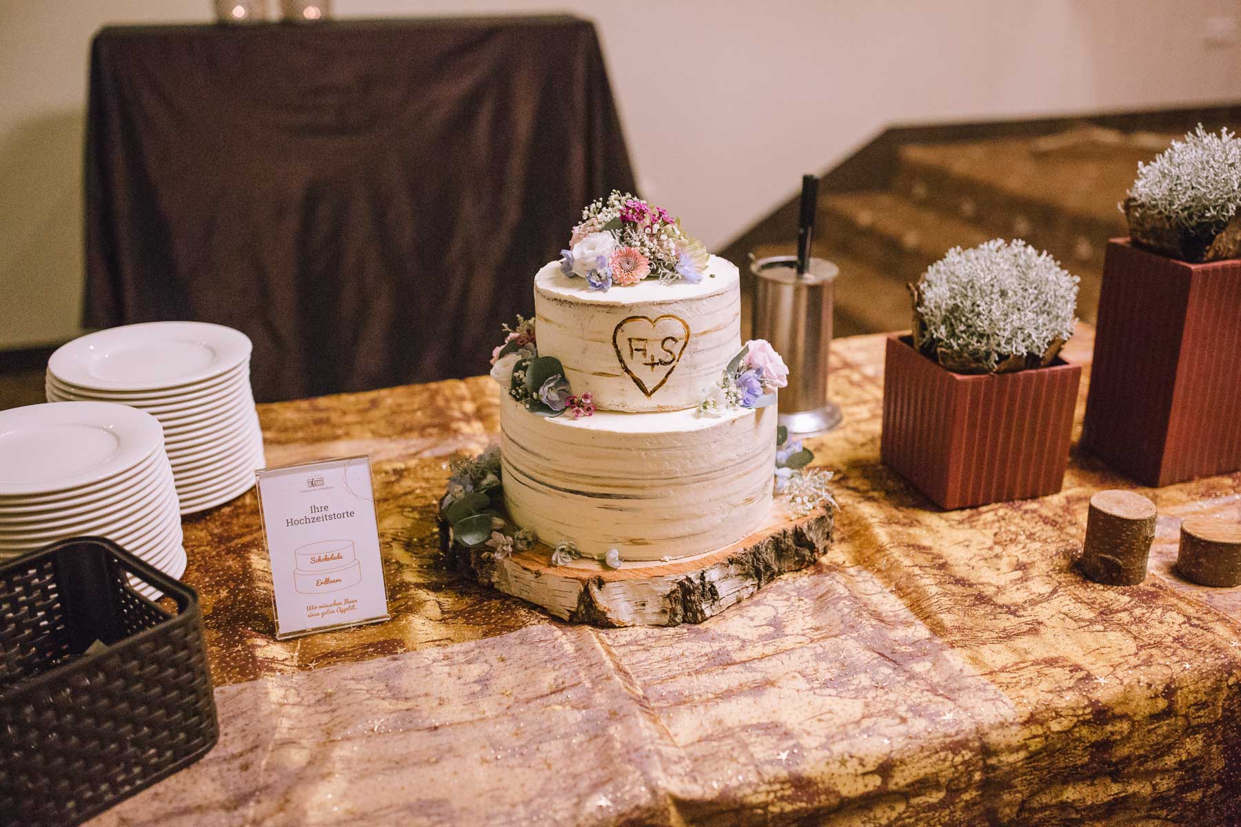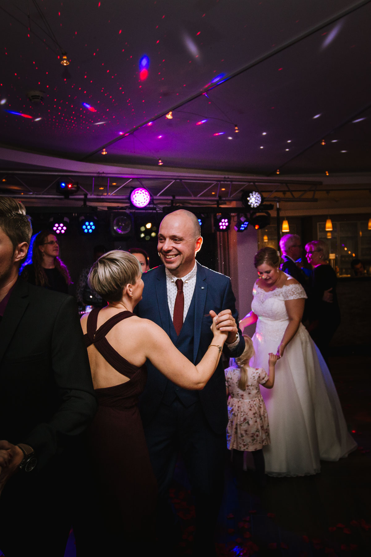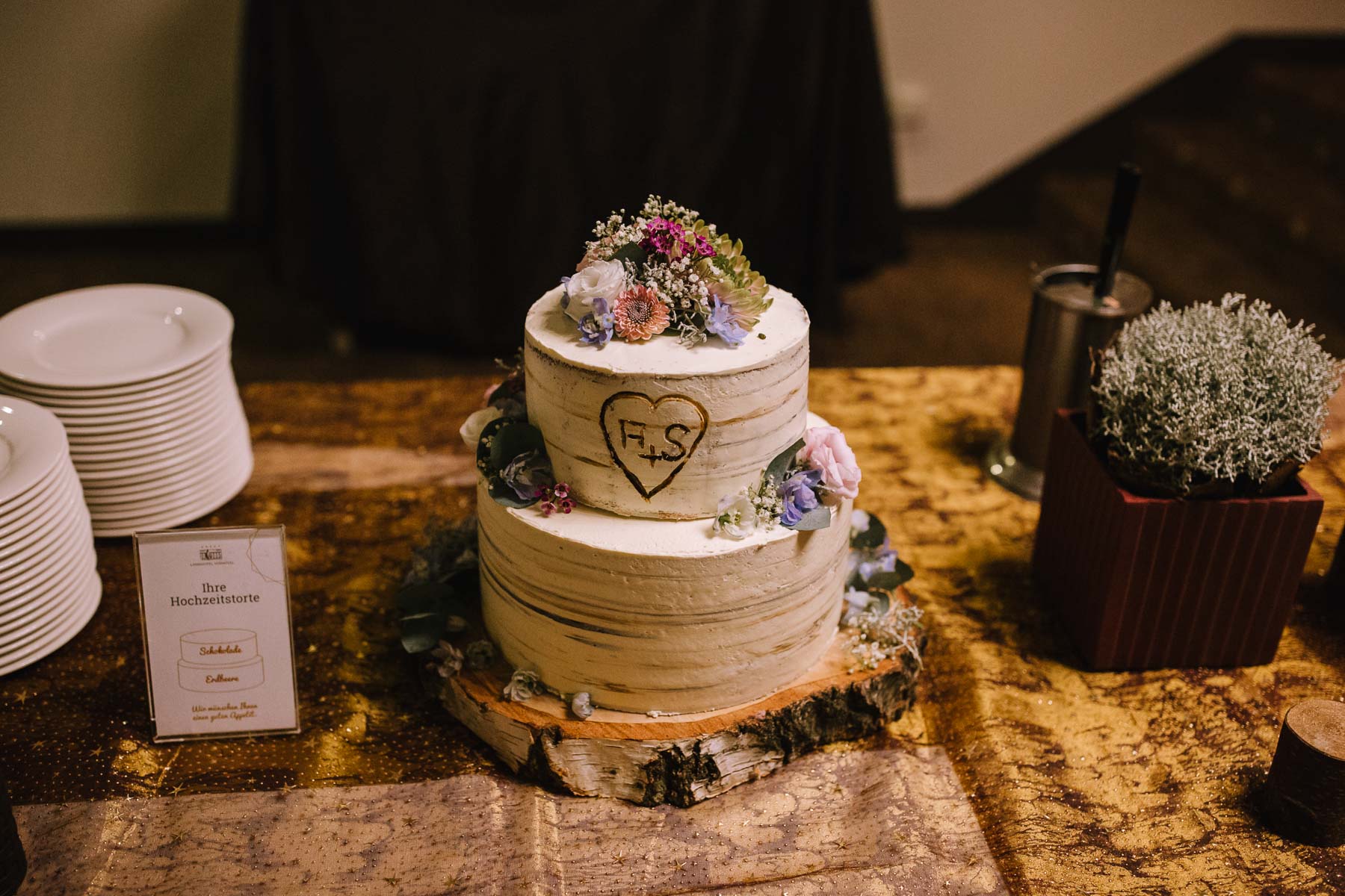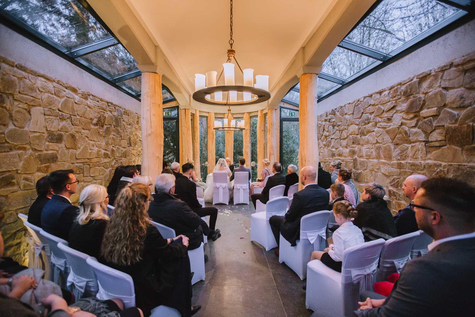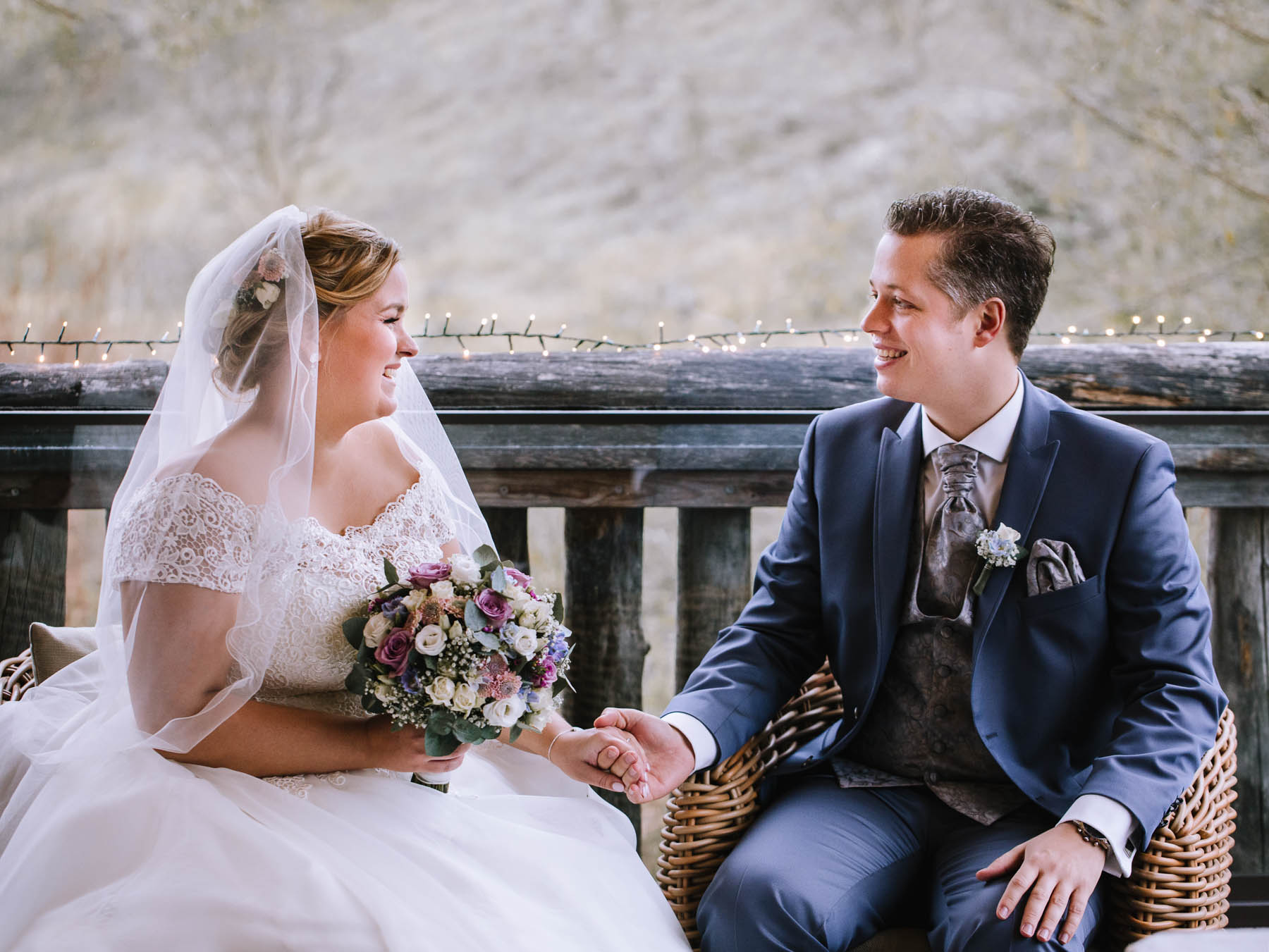 Währenddessen sahen wir schon durch das Fenster, dass Sascha sich bereits auf den Weg zur Ernst-August-Hütte gemacht hatte, wo der First Look stattfinden sollte. Leider herrschte draußen ein ungemütlicher Mix aus Nieselregen, Schneeregen und Nebel. Aus diesem Grund haben wir das Shooting nach drinnen verlegt. Und dann war es auch soweit: bereits auf dem Weg, den wir mit transparenten Regenschirmen beschritten, stieg die Spannung immer mehr. Angekommen in der Hütte war es dann soweit und eines kann ich euch sagen: es war ein First Look, wie er im Buche steht. Das Aufeinandertreffen war sooo emotional – einfach nur wunderschön. Und auch die Trauung im Confideum des Landhotels Voshövel war voller aufregender und emotionaler Momente. Nach der Trauung gingen wir dann in den Pavillon, wo die Feier stattfand. Nach dem köstlichen Essen mit Hochzeitstorte als Dessert, Feuershow, einem perfekt einstudierten Hochzeitstanz und einem Late-Night-Shooting, ging es für mich dann zurück ins Sauerland. Vielen Dank Anna und Sascha für die vielen tollen Momente!