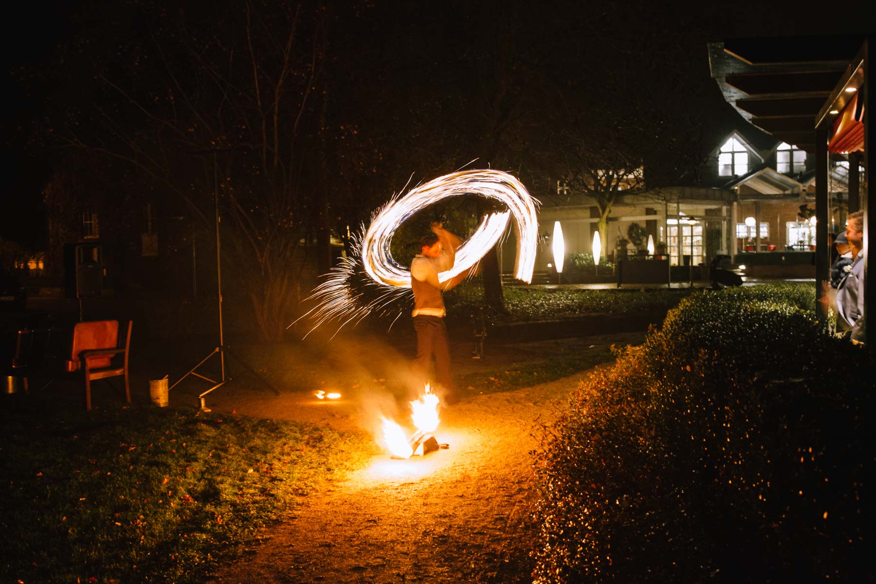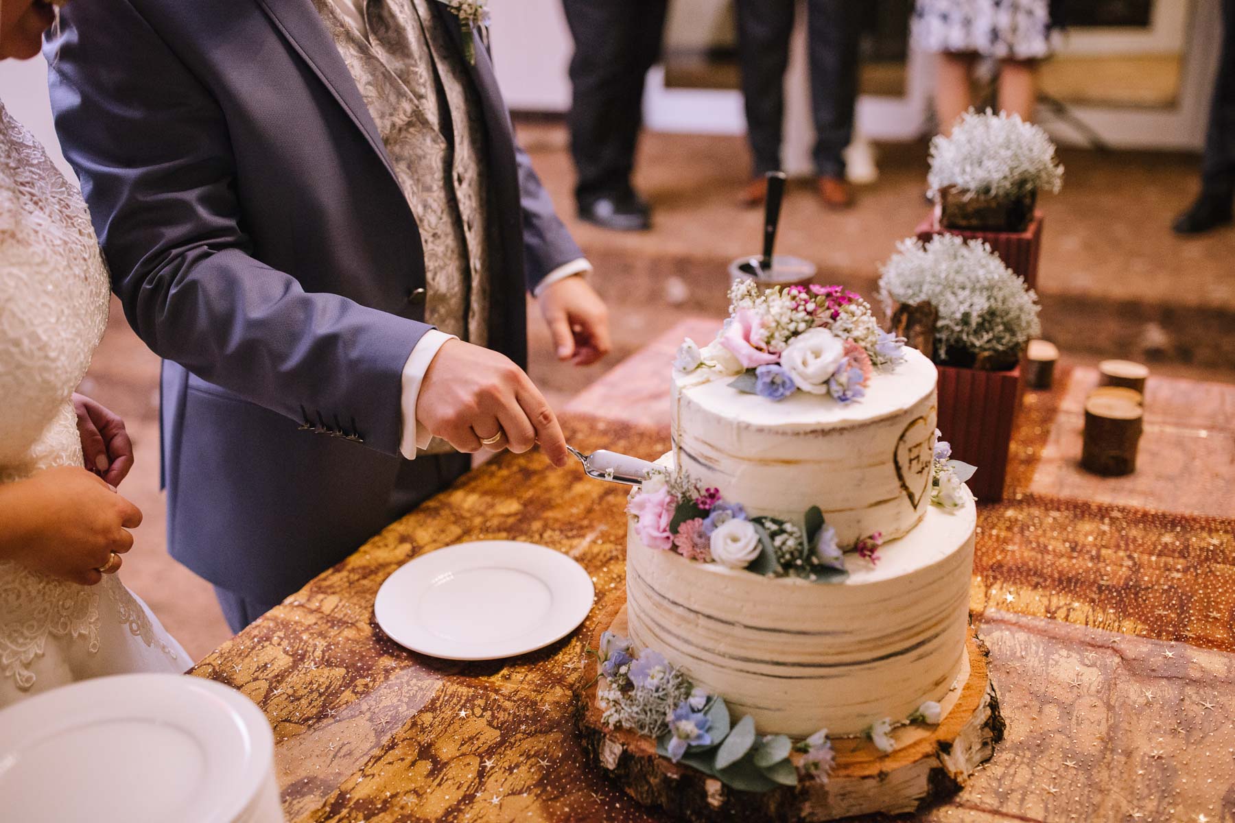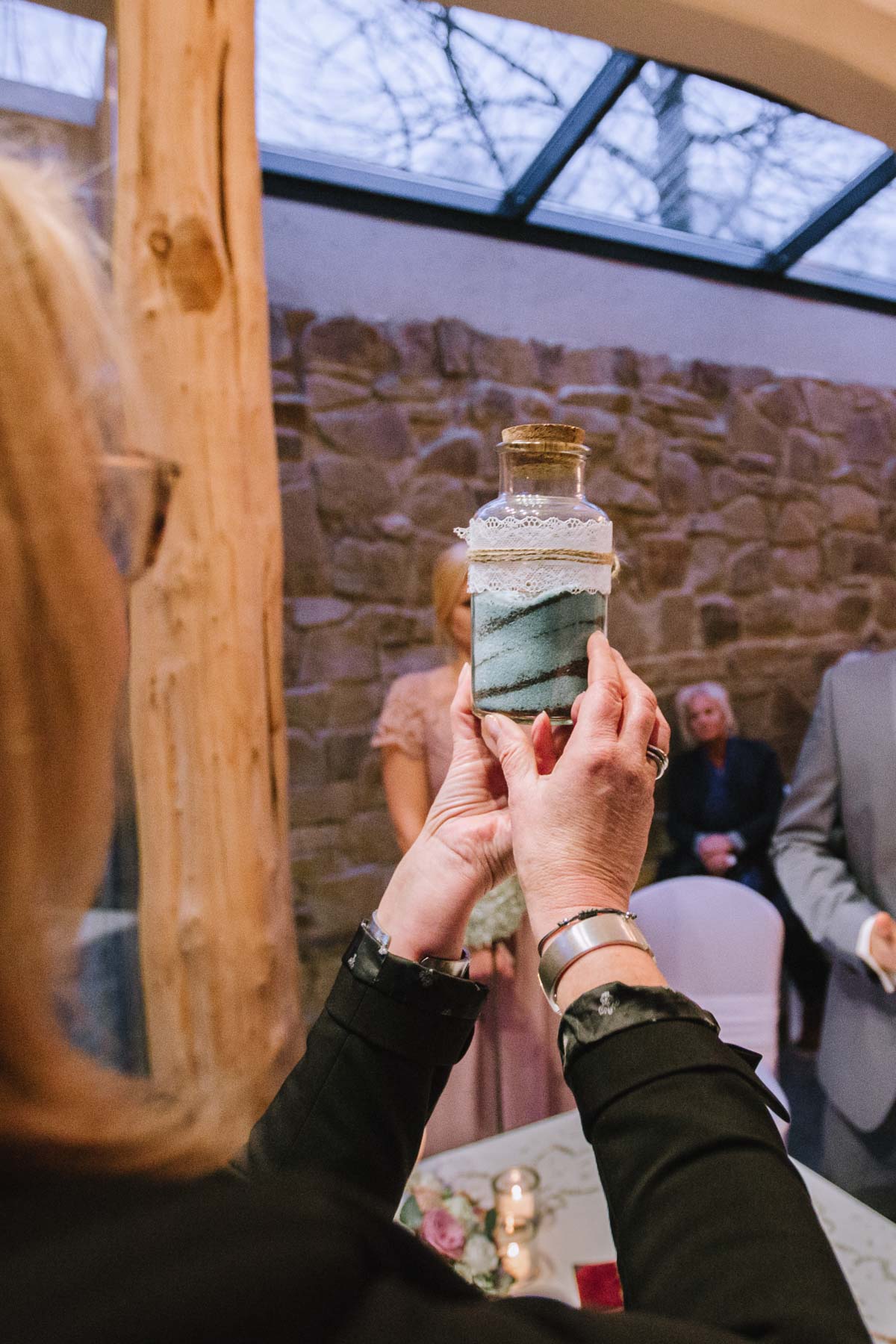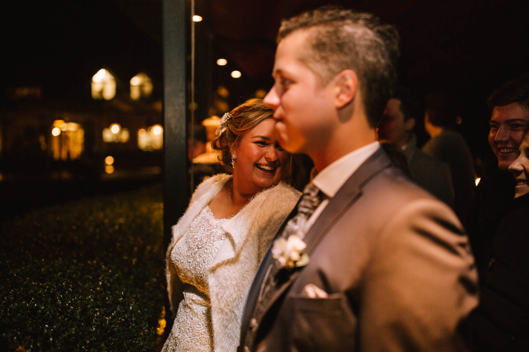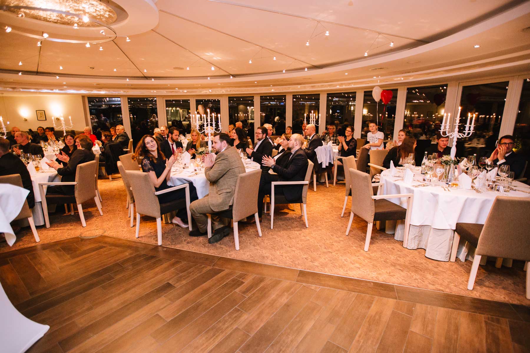Währenddessen sahen wir schon durch das Fenster, dass Sascha sich bereits auf den Weg zur Ernst-August-Hütte gemacht hatte, wo der First Look stattfinden sollte. Leider herrschte draußen ein ungemütlicher Mix aus Nieselregen, Schneeregen und Nebel. Aus diesem Grund haben wir das Shooting nach drinnen verlegt. Und dann war es auch soweit: bereits auf dem Weg, den wir mit transparenten Regenschirmen beschritten, stieg die Spannung immer mehr. Angekommen in der Hütte war es dann soweit und eines kann ich euch sagen: es war ein First Look, wie er im Buche steht. Das Aufeinandertreffen war sooo emotional – einfach nur wunderschön. Und auch die Trauung im Confideum des Landhotels Voshövel war voller aufregender und emotionaler Momente. Nach der Trauung gingen wir dann in den Pavillon, wo die Feier stattfand. Nach dem köstlichen Essen mit Hochzeitstorte als Dessert, Feuershow, einem perfekt einstudierten Hochzeitstanz und einem Late-Night-Shooting, ging es für mich dann zurück ins Sauerland. Vielen Dank Anna und Sascha für die vielen tollen Momente!
