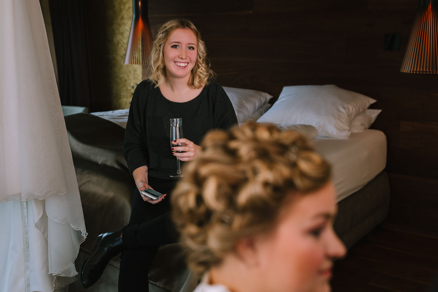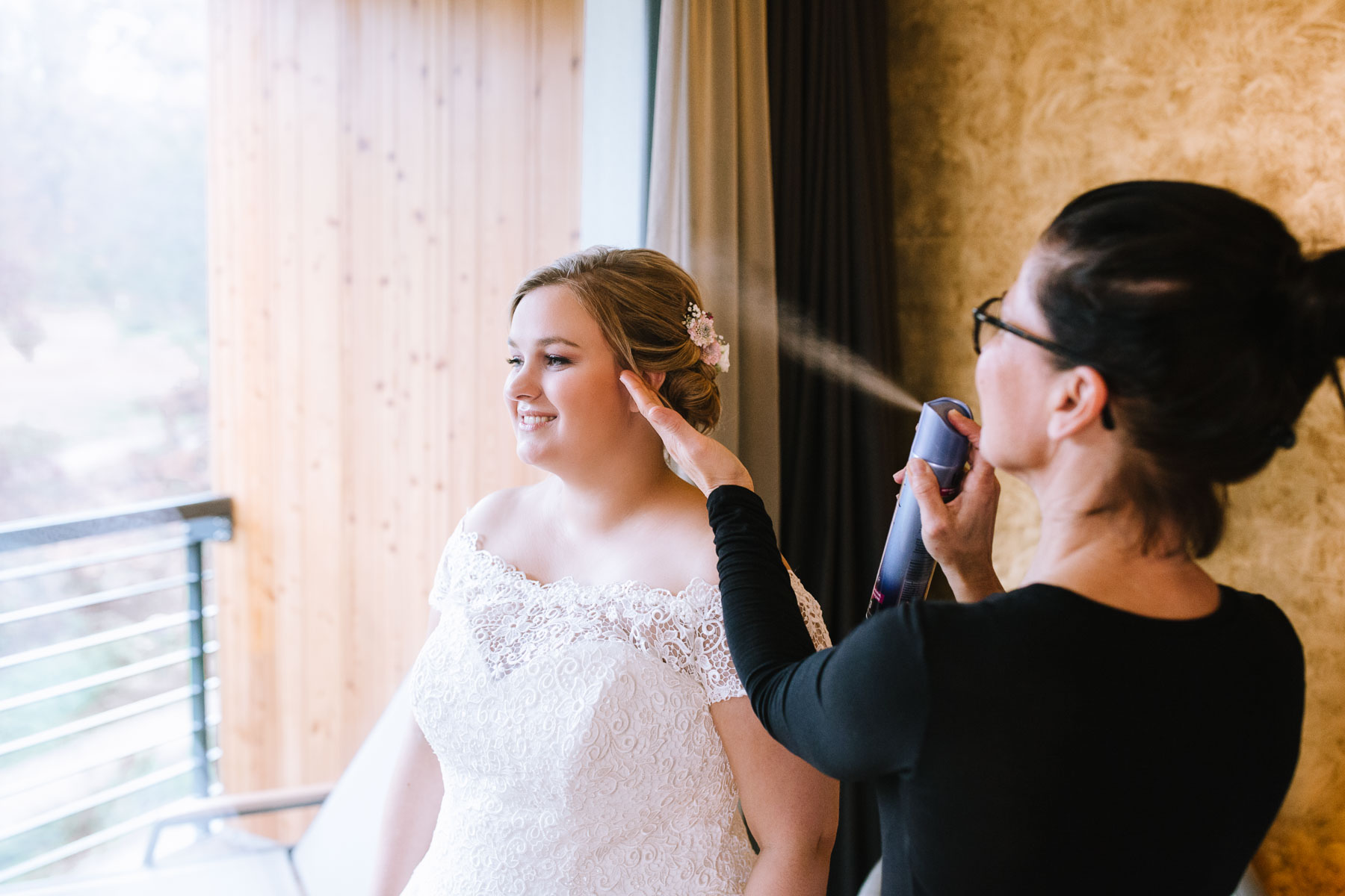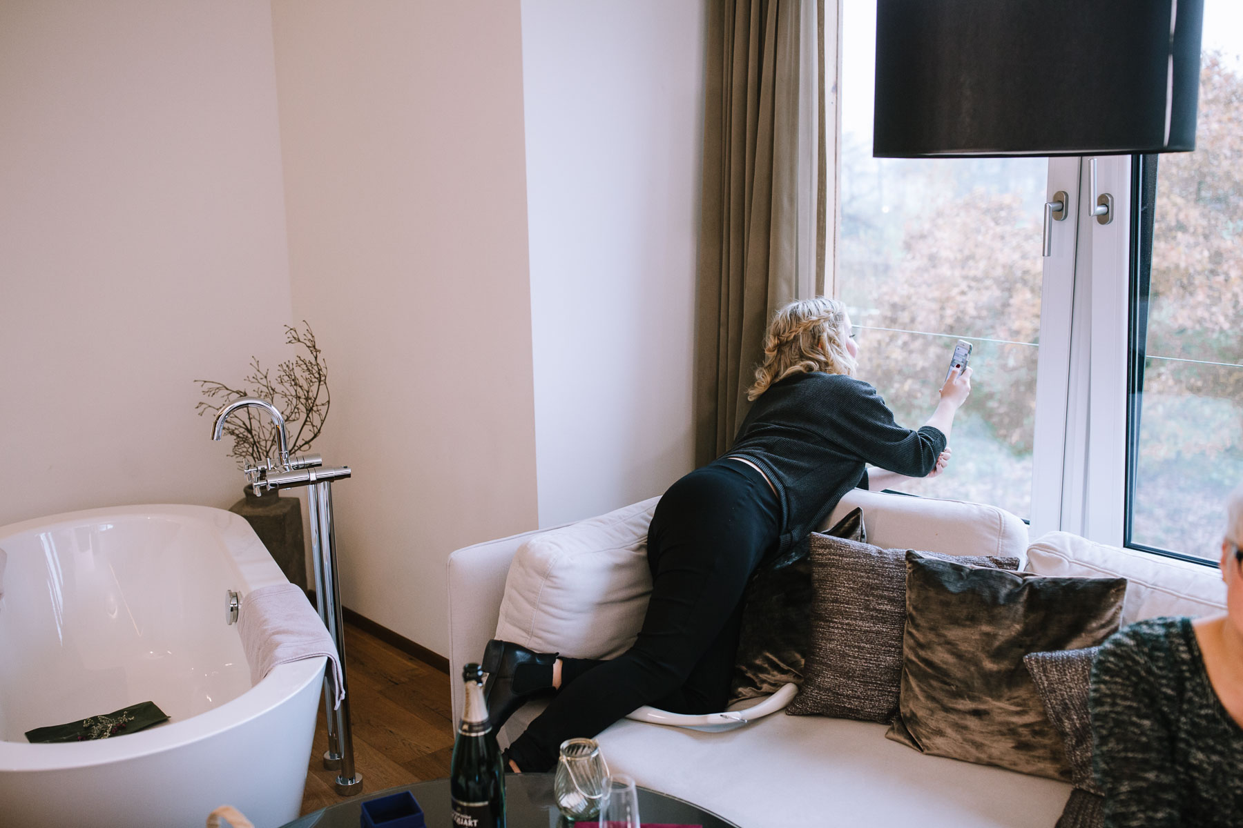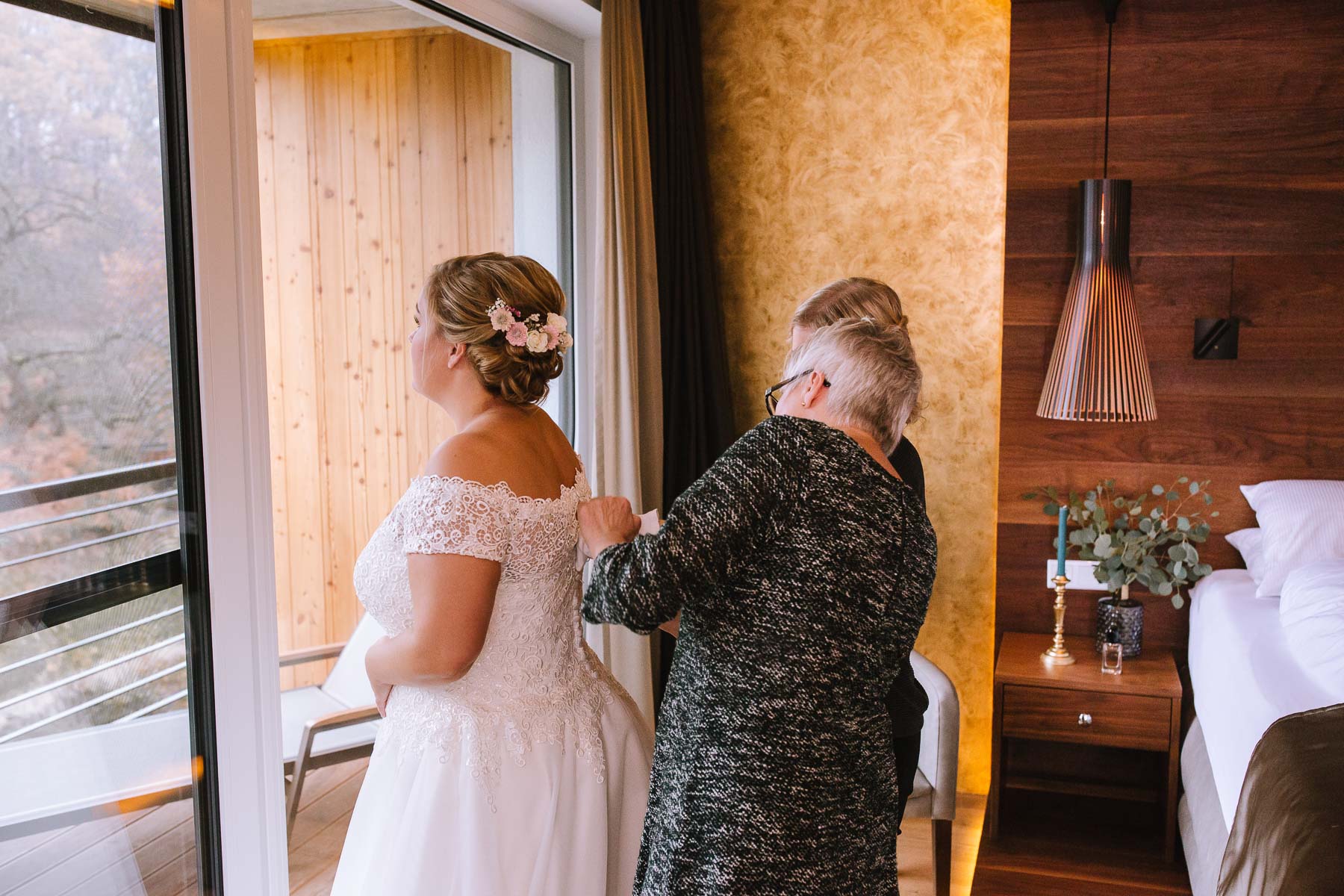 Im Herbst lernte ich Anna und Sascha kennen. Wir trafen uns im Café im Landhotel Voshövel zum Kuchenessen und von der ersten Minute an war klar, dass wir uns super verstehen würden. Zum ersten Mal habe ich Menschen kennengelernt, die noch öfter Lachen als ich selbst und das war mir natürlich sofort sehr sympathisch. Das Leben ist schießlich ernst genug, als dass man zu VIEL lachen könnte. Nachdem wir den Tagesablauf durchgeplant hatten, machen wir noch ein kleines Verlobungsshooting direkt am Landhotel Voshövel, dessen Gelände so weitläufig ist, dass es zahlreiche wunderschöne Ecken zum Fotografieren gibt. Auch das Shooting hat super viel Spaß gemacht und ließ die Vorfreude noch ein Stück anwachsen. Im Jahr darauf, im November, war es dann soweit. Früh morgens ging es los an den Niederrhein und dort angekommen, wurde ich direkt herzlich von Sascha und seiner Schwester im Hotelzimmer empfangen. Nach dem Getting Ready des Bräutigams ging ich ins Zimmer 229 – die Champagner-Suite. Dort warteten Anna und ihre Trauzeugin bereits auf mich. An diesem Tag lernte ich auch Larissa kennen, die ich später noch öfters im Landhotel Voshövel traf und die Anna ein wunderschönes Styling zauberte. Nachdem Haare und Make-Up fertig waren, folgte das Ankleiden.