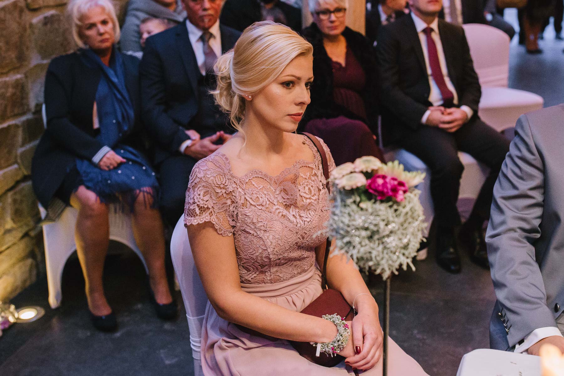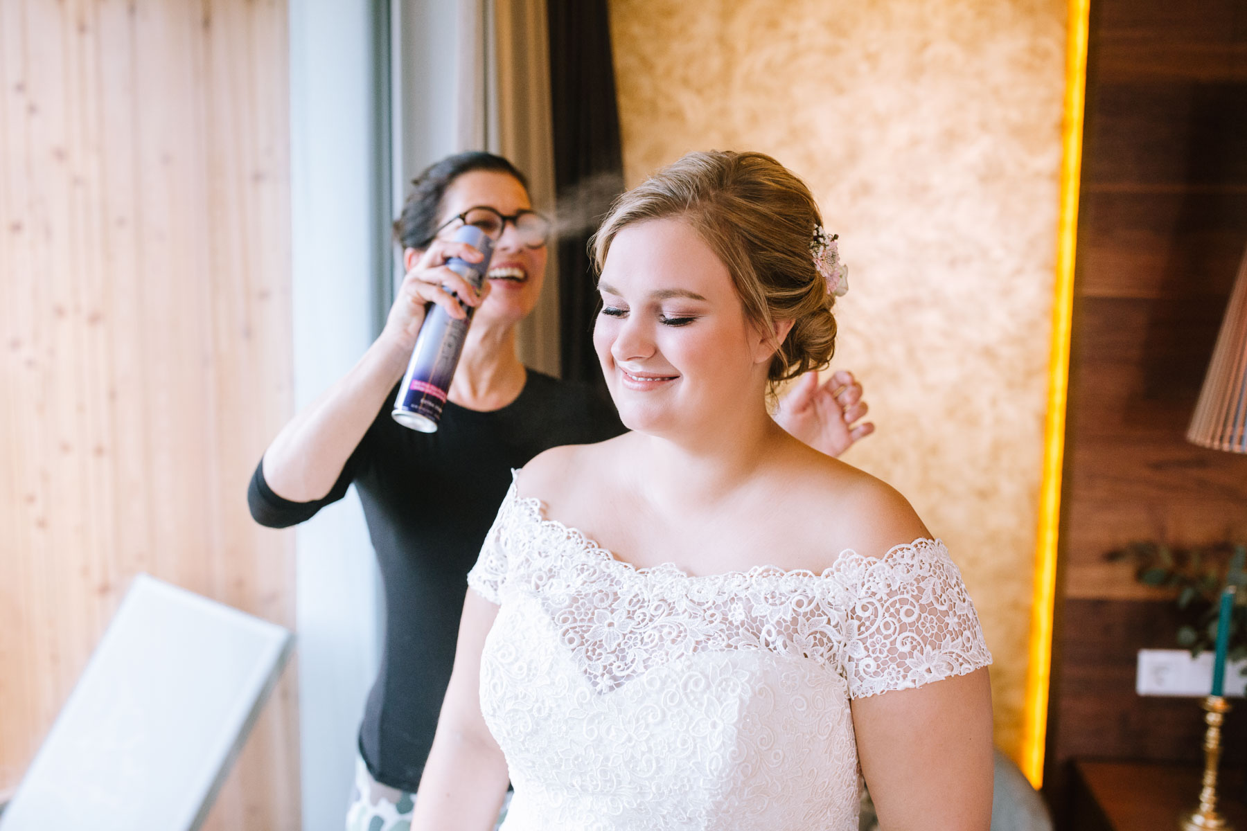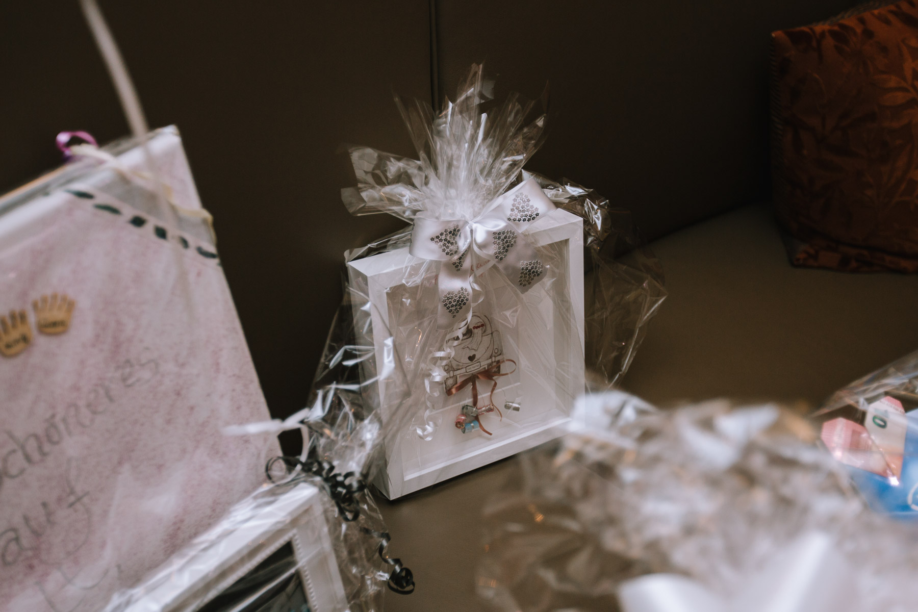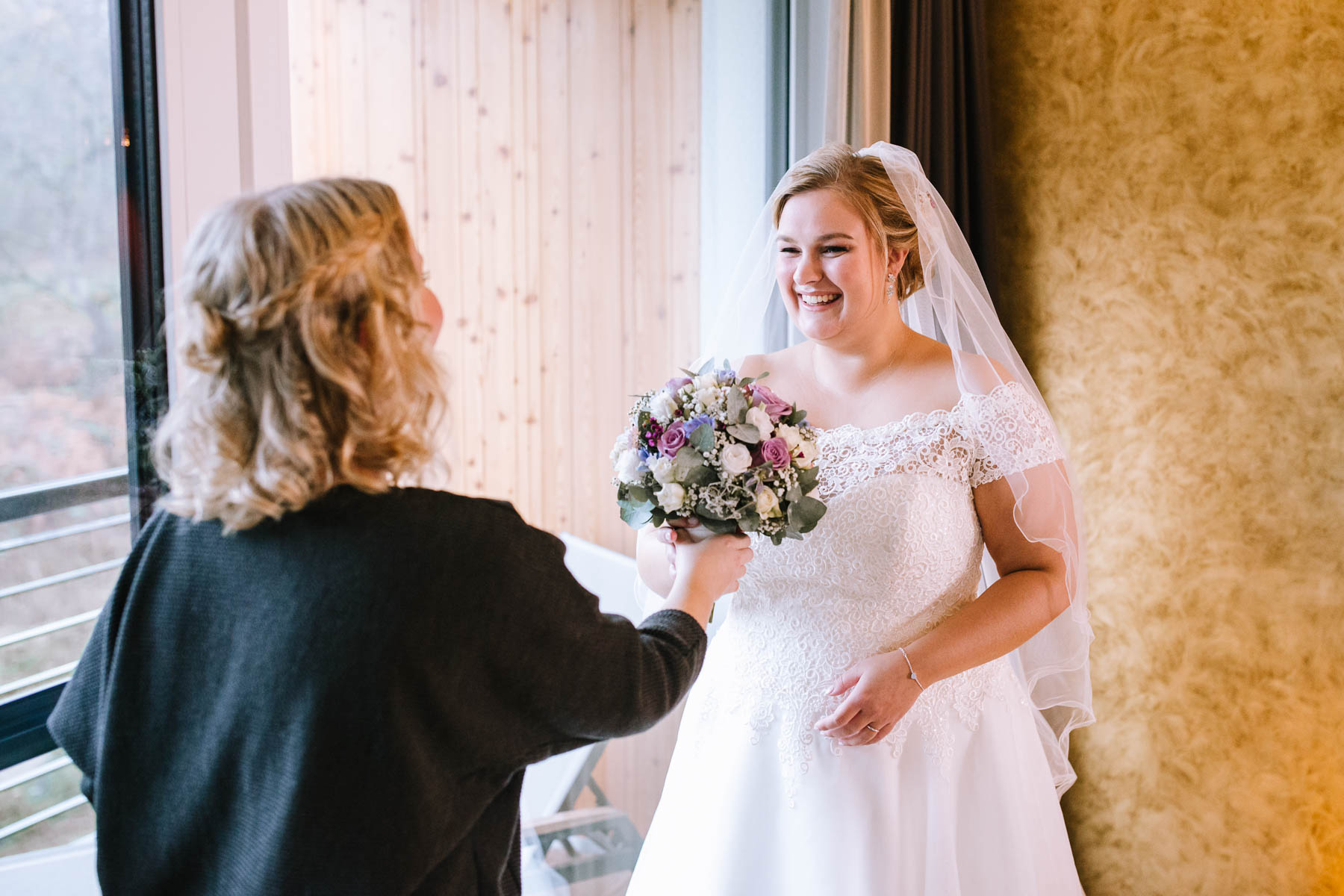 Im Herbst lernte ich Anna und Sascha kennen. Wir trafen uns im Café im Landhotel Voshövel zum Kuchenessen und von der ersten Minute an war klar, dass wir uns super verstehen würden. Zum ersten Mal habe ich Menschen kennengelernt, die noch öfter Lachen als ich selbst und das war mir natürlich sofort sehr sympathisch. Das Leben ist schießlich ernst genug, als dass man zu VIEL lachen könnte. Nachdem wir den Tagesablauf durchgeplant hatten, machen wir noch ein kleines Verlobungsshooting direkt am Landhotel Voshövel, dessen Gelände so weitläufig ist, dass es zahlreiche wunderschöne Ecken zum Fotografieren gibt. Auch das Shooting hat super viel Spaß gemacht und ließ die Vorfreude noch ein Stück anwachsen. Im Jahr darauf, im November, war es dann soweit. Früh morgens ging es los an den Niederrhein und dort angekommen, wurde ich direkt herzlich von Sascha und seiner Schwester im Hotelzimmer empfangen. Nach dem Getting Ready des Bräutigams ging ich ins Zimmer 229 – die Champagner-Suite. Dort warteten Anna und ihre Trauzeugin bereits auf mich. An diesem Tag lernte ich auch Larissa kennen, die ich später noch öfters im Landhotel Voshövel traf und die Anna ein wunderschönes Styling zauberte. Nachdem Haare und Make-Up fertig waren, folgte das Ankleiden.