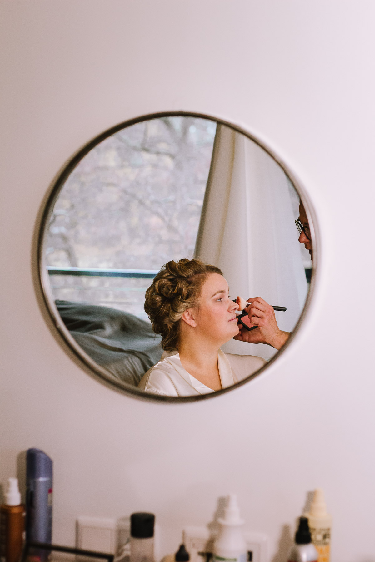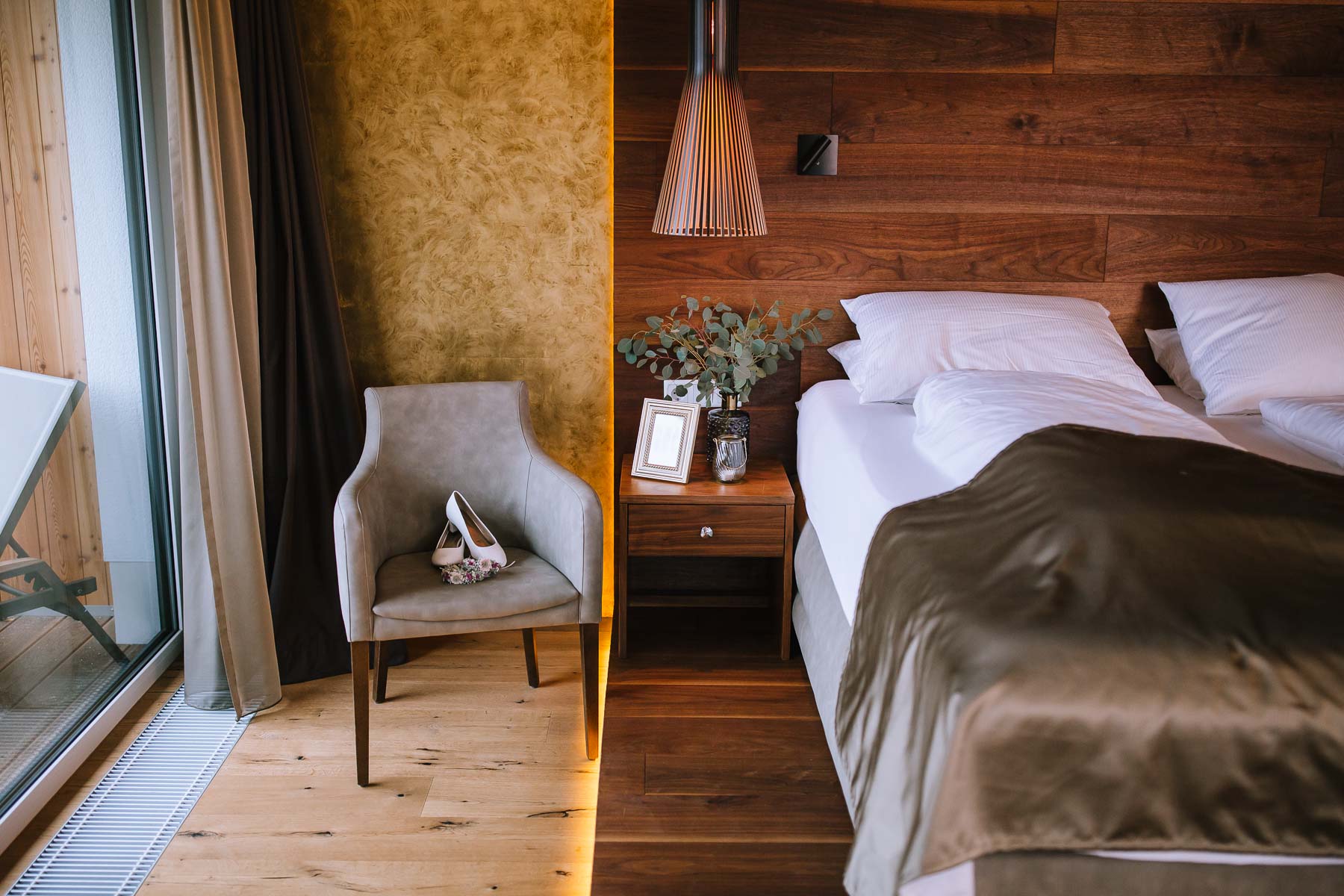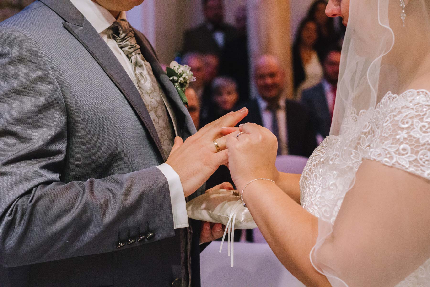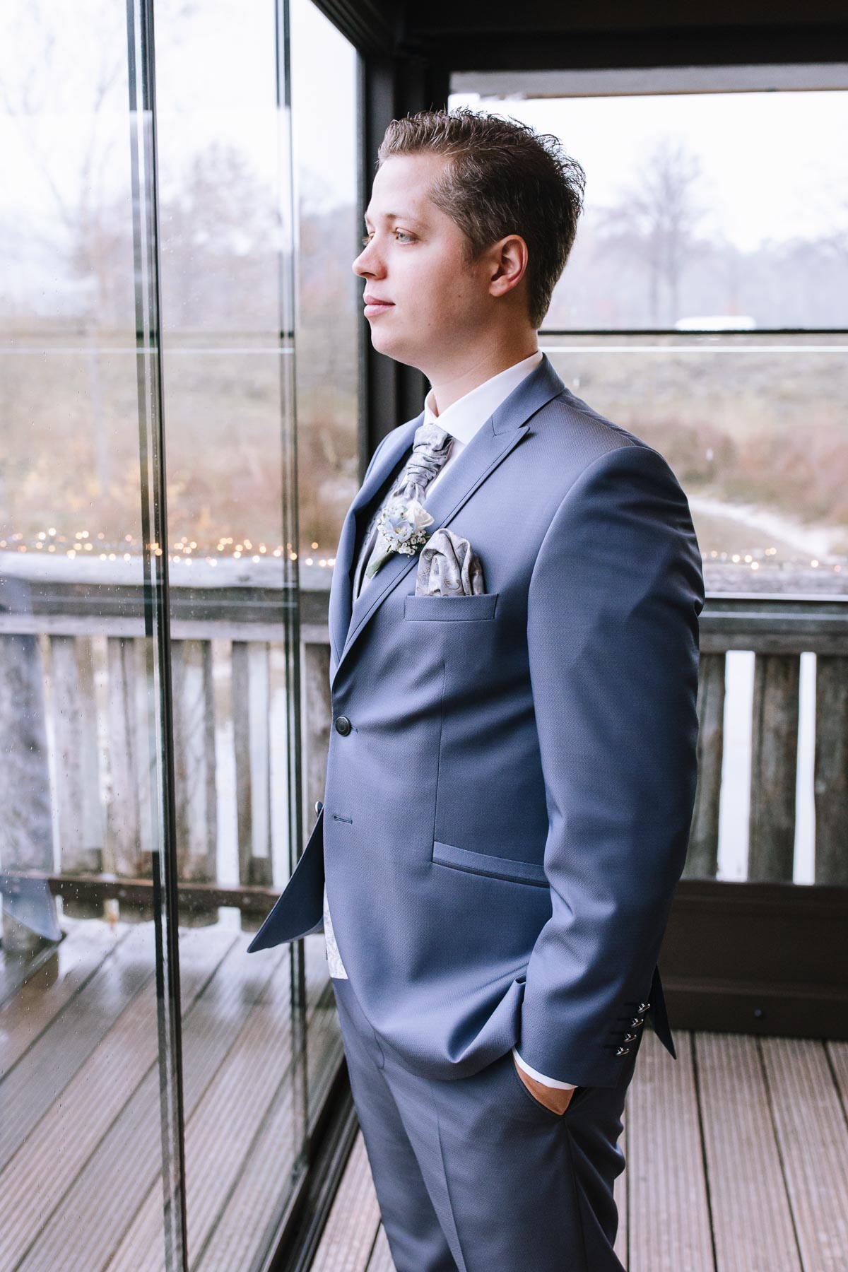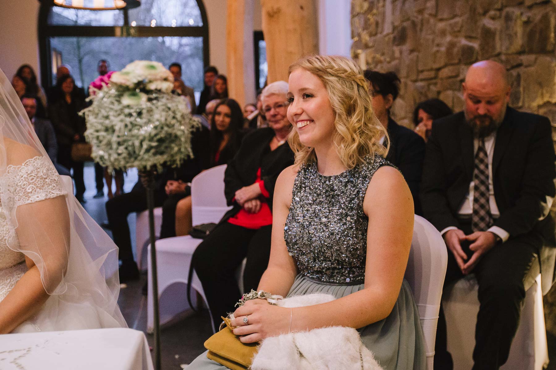 Im Herbst lernte ich Anna und Sascha kennen. Wir trafen uns im Café im Landhotel Voshövel zum Kuchenessen und von der ersten Minute an war klar, dass wir uns super verstehen würden. Zum ersten Mal habe ich Menschen kennengelernt, die noch öfter Lachen als ich selbst und das war mir natürlich sofort sehr sympathisch. Das Leben ist schießlich ernst genug, als dass man zu VIEL lachen könnte. Nachdem wir den Tagesablauf durchgeplant hatten, machen wir noch ein kleines Verlobungsshooting direkt am Landhotel Voshövel, dessen Gelände so weitläufig ist, dass es zahlreiche wunderschöne Ecken zum Fotografieren gibt. Auch das Shooting hat super viel Spaß gemacht und ließ die Vorfreude noch ein Stück anwachsen. Im Jahr darauf, im November, war es dann soweit. Früh morgens ging es los an den Niederrhein und dort angekommen, wurde ich direkt herzlich von Sascha und seiner Schwester im Hotelzimmer empfangen. Nach dem Getting Ready des Bräutigams ging ich ins Zimmer 229 – die Champagner-Suite. Dort warteten Anna und ihre Trauzeugin bereits auf mich. An diesem Tag lernte ich auch Larissa kennen, die ich später noch öfters im Landhotel Voshövel traf und die Anna ein wunderschönes Styling zauberte. Nachdem Haare und Make-Up fertig waren, folgte das Ankleiden.