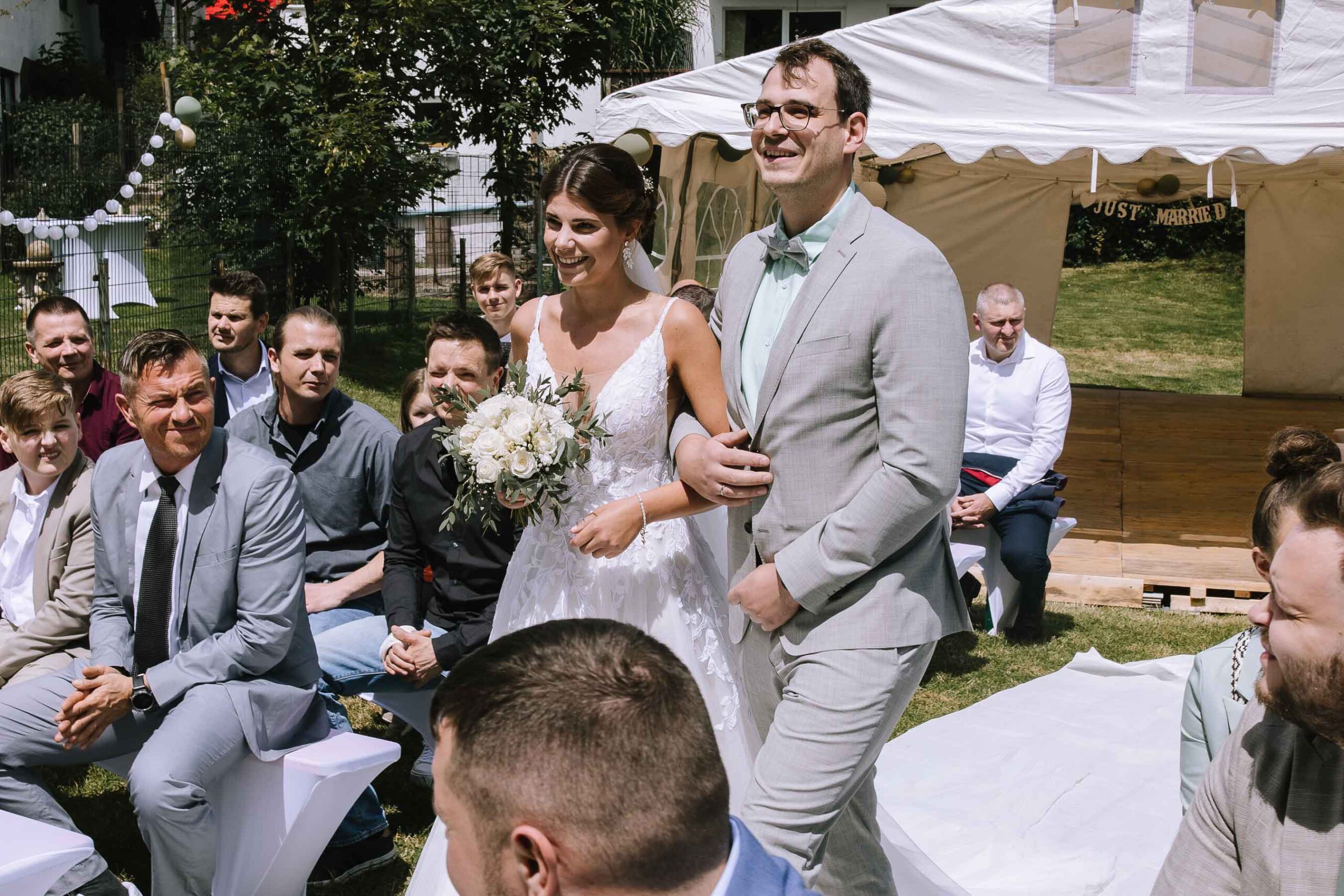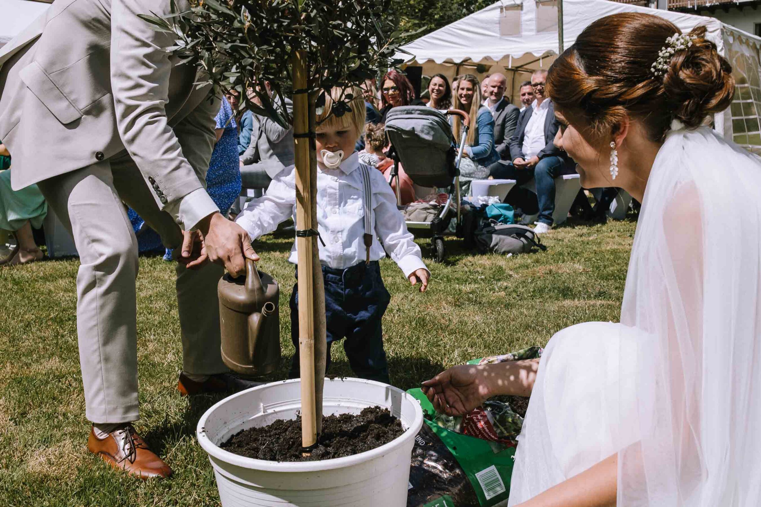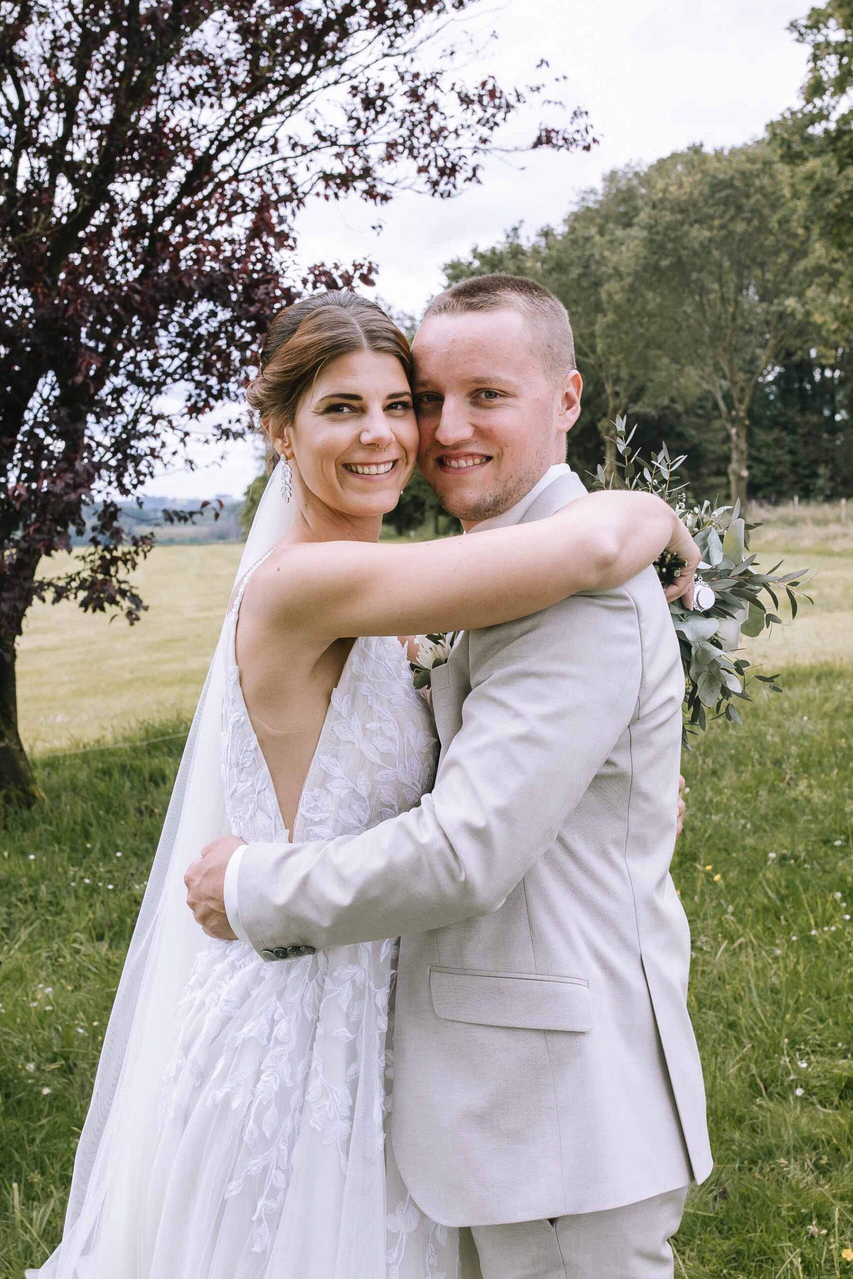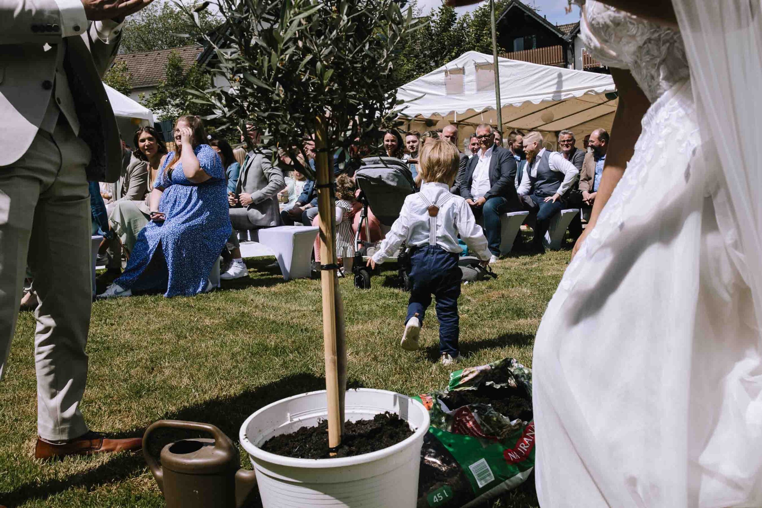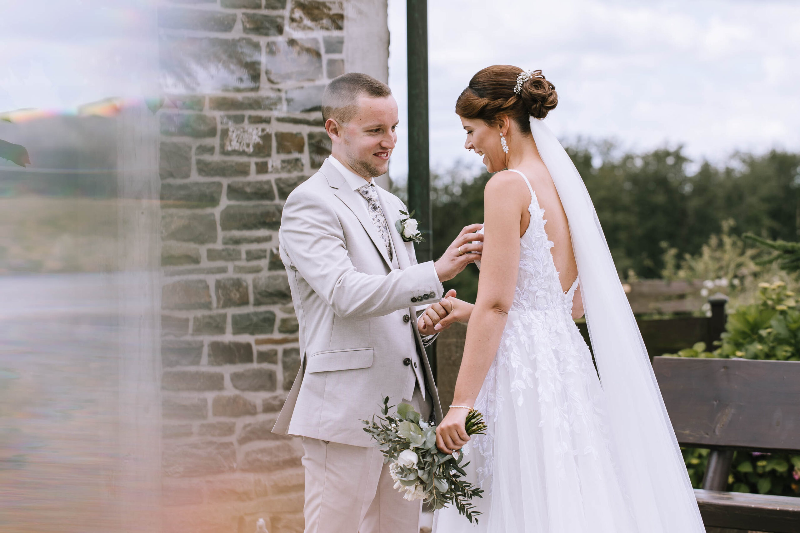 Kulisse festhalten. Wir machten das Shooting auf einem Wiesenhügel, auf dessen Spitze eine kleine Kapelle stand. Schon von weitem sahen wir das Auto mit Mary ankommen, und als sie ausstieg, war es ein unglaublich glücklicher und herzlicher Moment. Es war ein besonderer Augenblick, als Justin seine Braut zum ersten Mal in ihrem Hochzeitskleid sah – und der Moment war so voller Liebe und Emotionen, dass ich ihn mit meiner Kamera einfangen konnte. Die freie Trauung fand direkt am Ponystall statt und war genauso schön, wie wir es uns alle erhofft hatten. Sie war persönlich, fröhlich und voller Wärme. Als besonderes Ritual pflanzten Mary und Justin zusammen einen kleinen Olivenbaum – ein Symbol für ihre wachsende Liebe. Dieses schöne Ritual fügte der Zeremonie noch mehr Bedeutung und Tiefe hinzu. Nach der Trauung ging es zum Sektempfang in den Garten, wo die Gäste das frisch vermählte Paar mit Glückwünschen und Umarmungen empfingen. Es war eine lockere, fröhliche Atmosphäre, die sich auch in den Gruppenfotos widerspiegelte, die wir in der wunderschönen Gartenlandschaft machten. Die natürlichen Farben des Gartens und die entspannte Stimmung machten die Bilder lebendig und authentisch – genau das, was Mary und Justin sich gewünscht hatten. Es war mir eine Ehre, Mary und Justin an diesem besonderen Tag zu begleiten. Als Hochzeitsfotografin in Lindlar hatte ich das Glück, ihre Geschichte mit all ihren schönen Momenten festzuhalten. Vom First-Look über die Trauung bis hin zum Sektempfang – es war ein Tag voller Glück und Liebe, der für immer in meinen Bildern weiterlebt. Ich wünsche den beiden alles Gute für ihren gemeinsamen Weg!