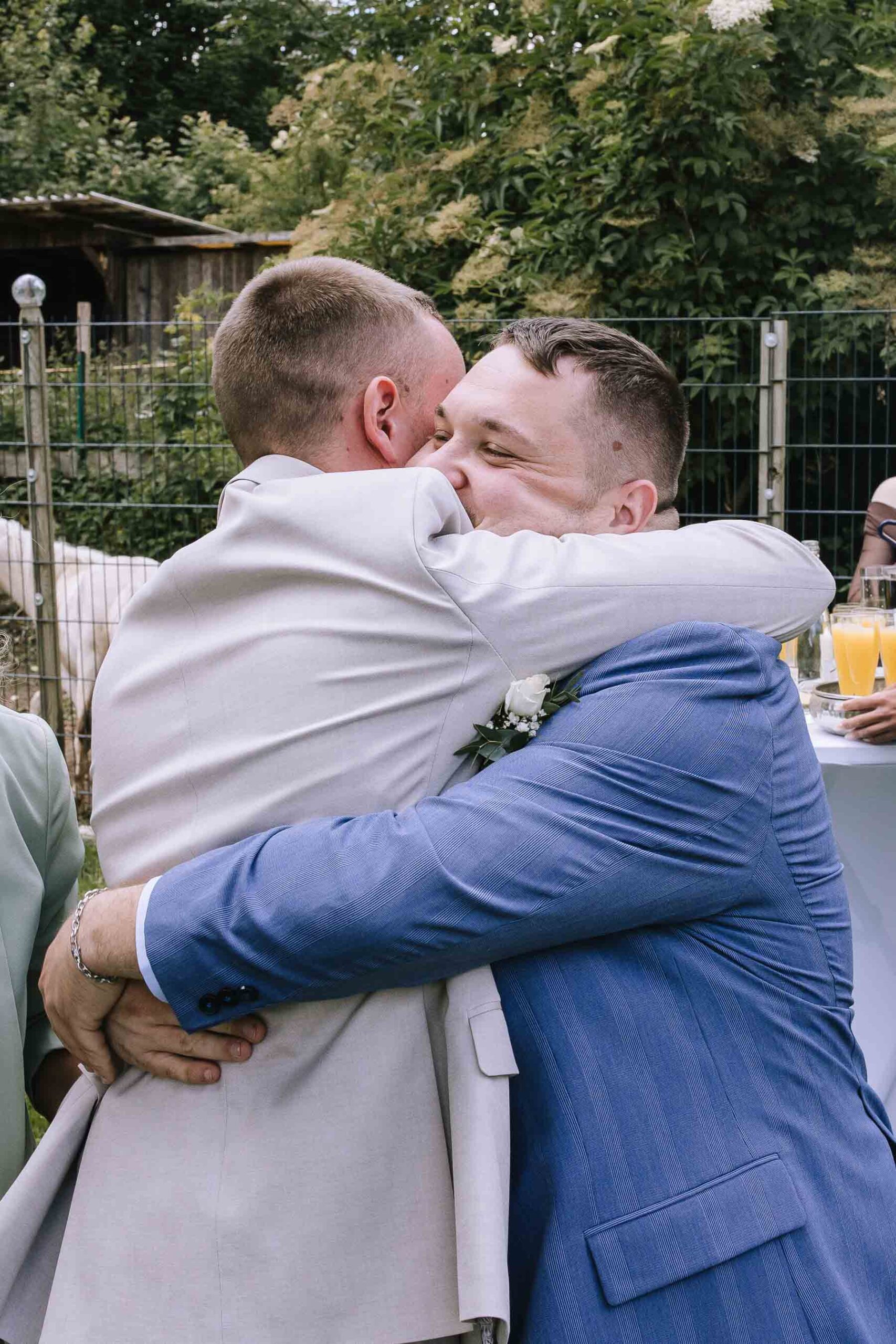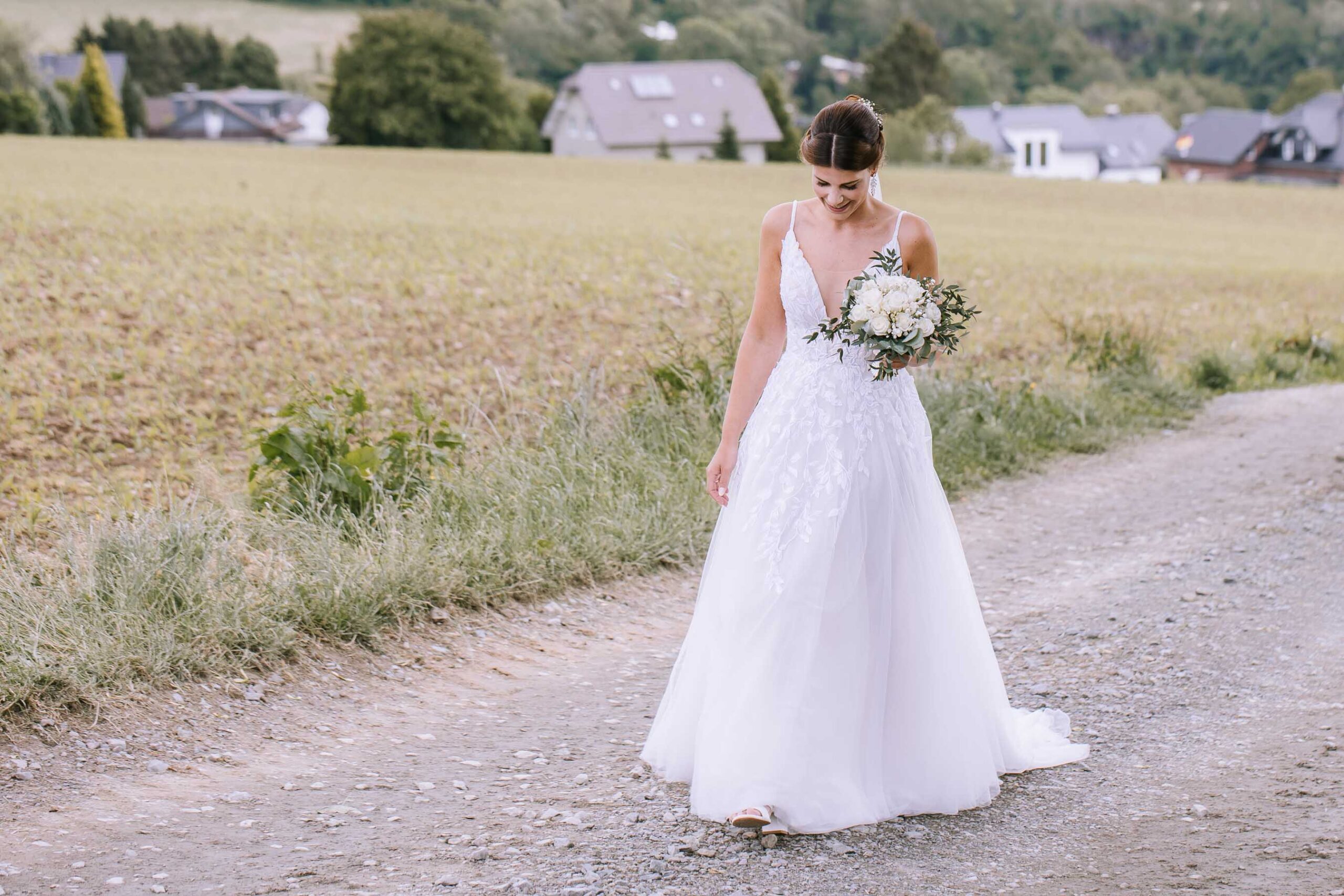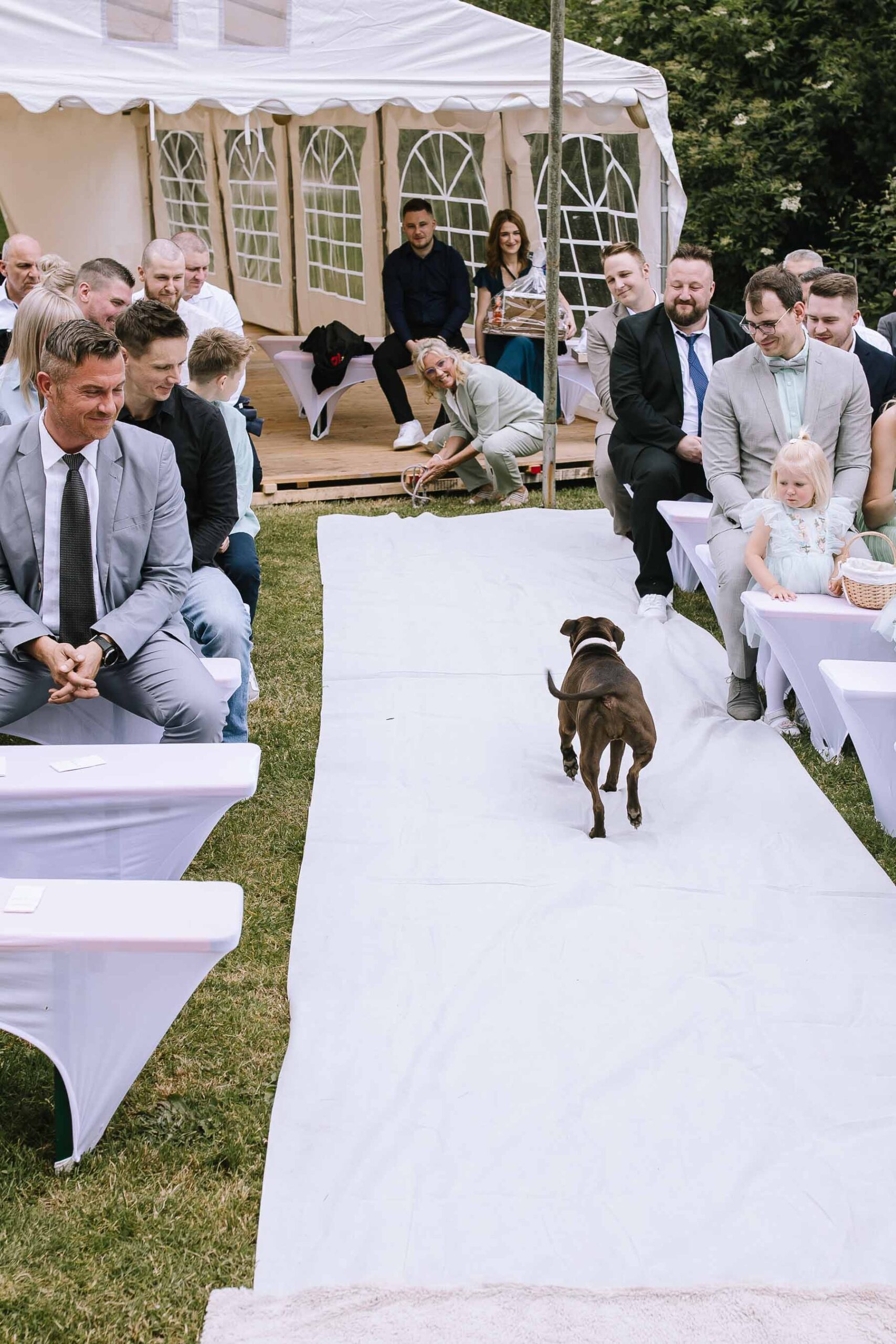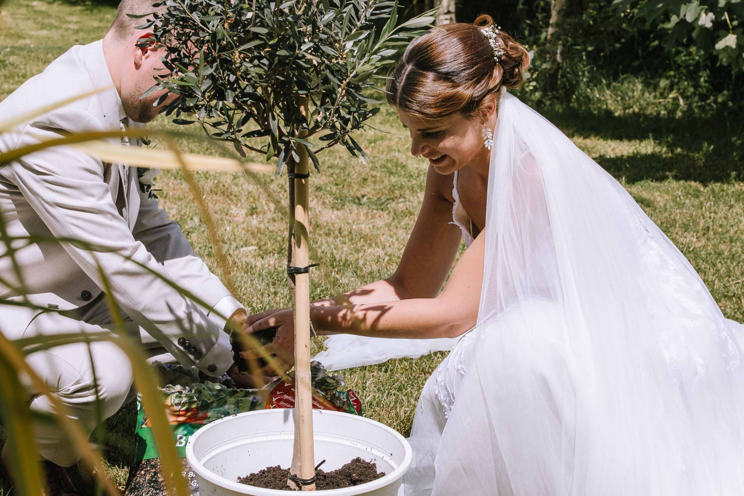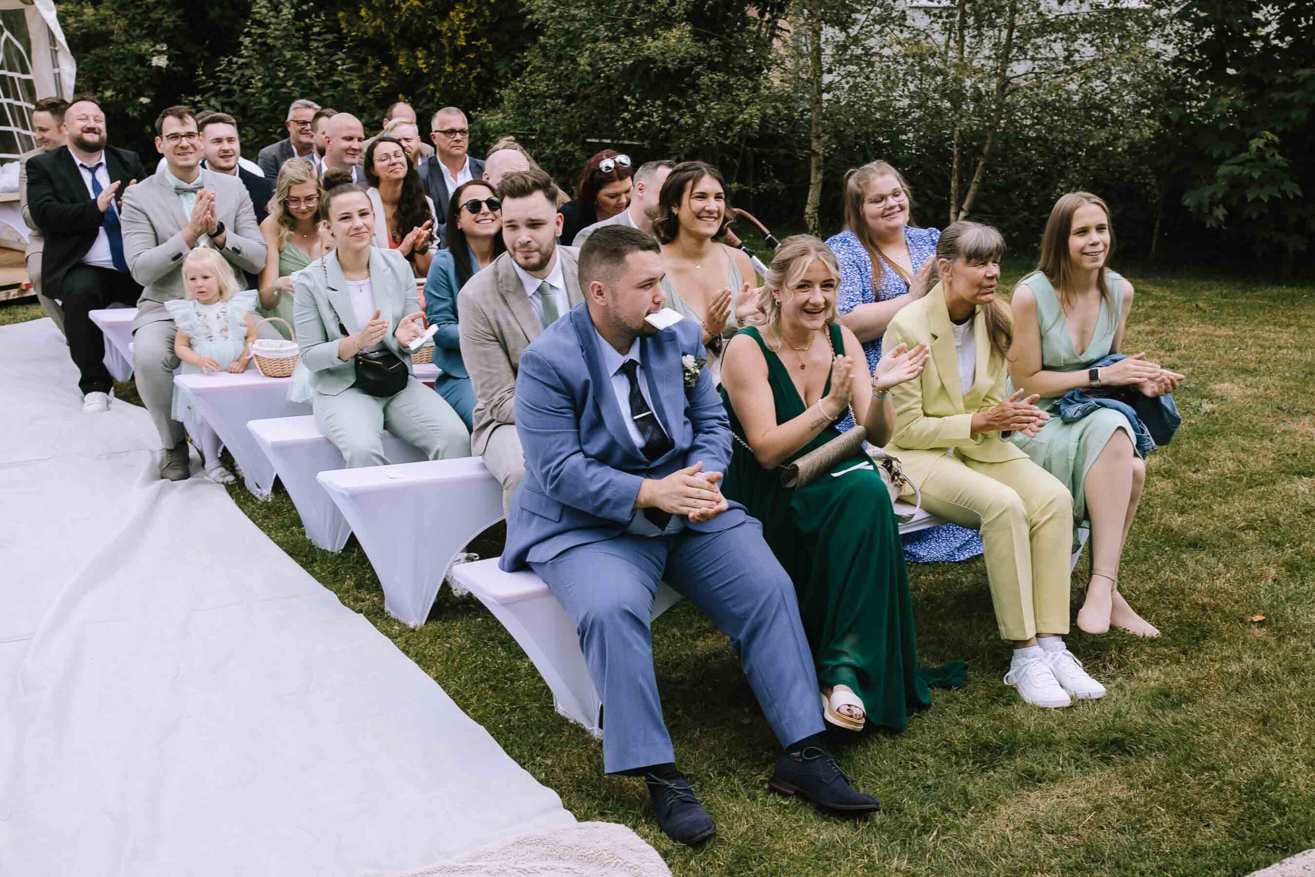 Kulisse festhalten. Wir machten das Shooting auf einem Wiesenhügel, auf dessen Spitze eine kleine Kapelle stand. Schon von weitem sahen wir das Auto mit Mary ankommen, und als sie ausstieg, war es ein unglaublich glücklicher und herzlicher Moment. Es war ein besonderer Augenblick, als Justin seine Braut zum ersten Mal in ihrem Hochzeitskleid sah – und der Moment war so voller Liebe und Emotionen, dass ich ihn mit meiner Kamera einfangen konnte. Die freie Trauung fand direkt am Ponystall statt und war genauso schön, wie wir es uns alle erhofft hatten. Sie war persönlich, fröhlich und voller Wärme. Als besonderes Ritual pflanzten Mary und Justin zusammen einen kleinen Olivenbaum – ein Symbol für ihre wachsende Liebe. Dieses schöne Ritual fügte der Zeremonie noch mehr Bedeutung und Tiefe hinzu. Nach der Trauung ging es zum Sektempfang in den Garten, wo die Gäste das frisch vermählte Paar mit Glückwünschen und Umarmungen empfingen. Es war eine lockere, fröhliche Atmosphäre, die sich auch in den Gruppenfotos widerspiegelte, die wir in der wunderschönen Gartenlandschaft machten. Die natürlichen Farben des Gartens und die entspannte Stimmung machten die Bilder lebendig und authentisch – genau das, was Mary und Justin sich gewünscht hatten. Es war mir eine Ehre, Mary und Justin an diesem besonderen Tag zu begleiten. Als Hochzeitsfotografin in Lindlar hatte ich das Glück, ihre Geschichte mit all ihren schönen Momenten festzuhalten. Vom First-Look über die Trauung bis hin zum Sektempfang – es war ein Tag voller Glück und Liebe, der für immer in meinen Bildern weiterlebt. Ich wünsche den beiden alles Gute für ihren gemeinsamen Weg!