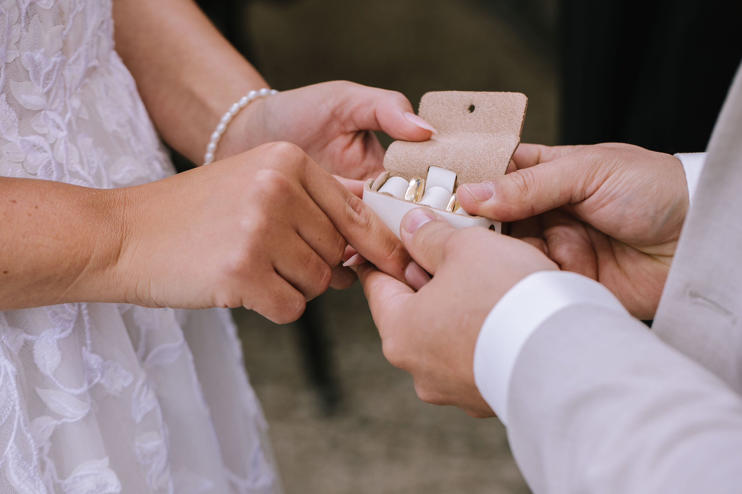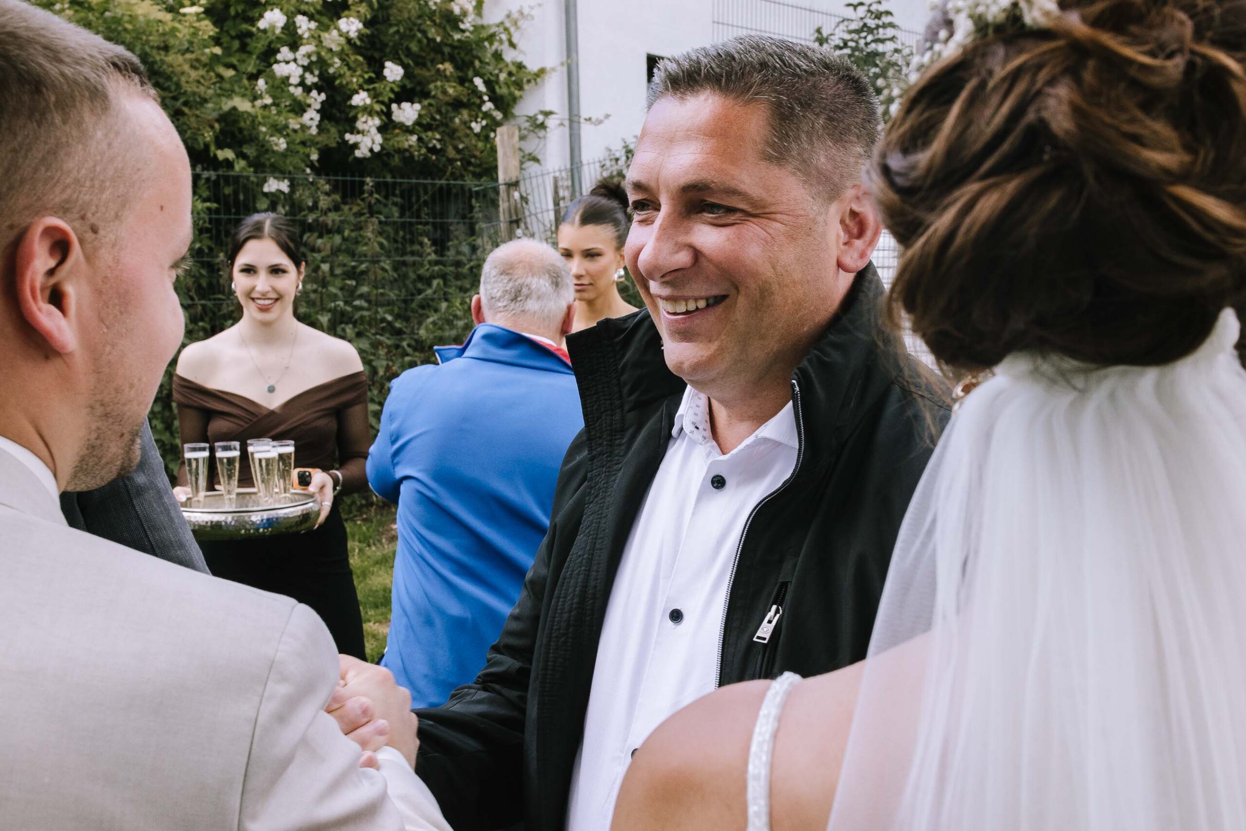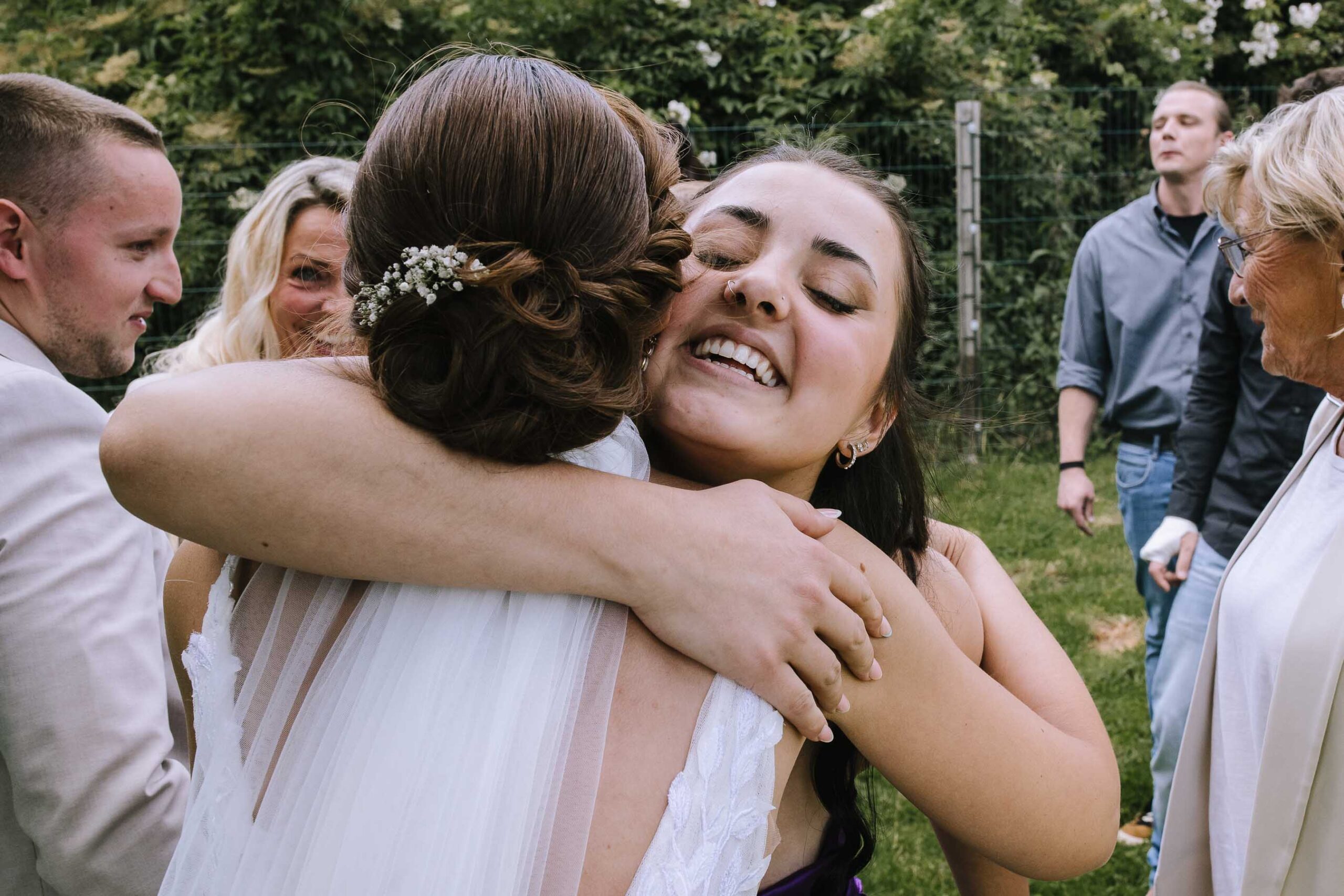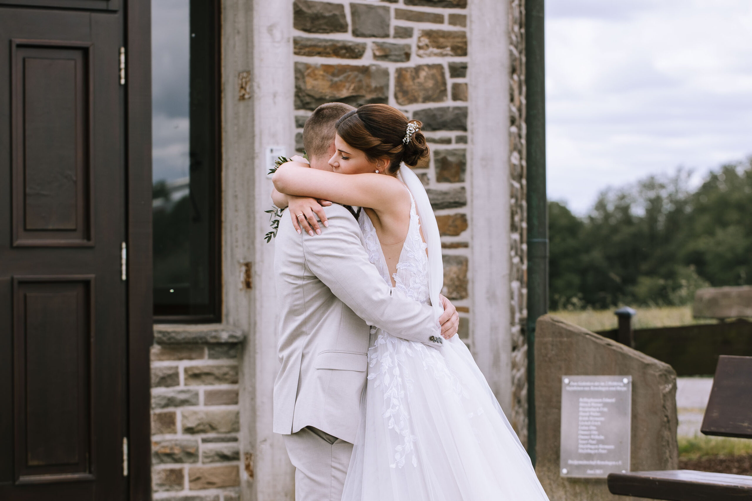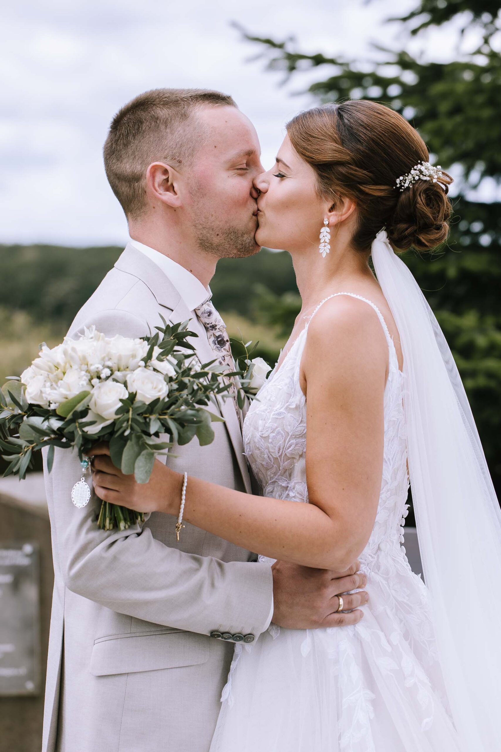 Kulisse festhalten. Wir machten das Shooting auf einem Wiesenhügel, auf dessen Spitze eine kleine Kapelle stand. Schon von weitem sahen wir das Auto mit Mary ankommen, und als sie ausstieg, war es ein unglaublich glücklicher und herzlicher Moment. Es war ein besonderer Augenblick, als Justin seine Braut zum ersten Mal in ihrem Hochzeitskleid sah – und der Moment war so voller Liebe und Emotionen, dass ich ihn mit meiner Kamera einfangen konnte. Die freie Trauung fand direkt am Ponystall statt und war genauso schön, wie wir es uns alle erhofft hatten. Sie war persönlich, fröhlich und voller Wärme. Als besonderes Ritual pflanzten Mary und Justin zusammen einen kleinen Olivenbaum – ein Symbol für ihre wachsende Liebe. Dieses schöne Ritual fügte der Zeremonie noch mehr Bedeutung und Tiefe hinzu. Nach der Trauung ging es zum Sektempfang in den Garten, wo die Gäste das frisch vermählte Paar mit Glückwünschen und Umarmungen empfingen. Es war eine lockere, fröhliche Atmosphäre, die sich auch in den Gruppenfotos widerspiegelte, die wir in der wunderschönen Gartenlandschaft machten. Die natürlichen Farben des Gartens und die entspannte Stimmung machten die Bilder lebendig und authentisch – genau das, was Mary und Justin sich gewünscht hatten. Es war mir eine Ehre, Mary und Justin an diesem besonderen Tag zu begleiten. Als Hochzeitsfotografin in Lindlar hatte ich das Glück, ihre Geschichte mit all ihren schönen Momenten festzuhalten. Vom First-Look über die Trauung bis hin zum Sektempfang – es war ein Tag voller Glück und Liebe, der für immer in meinen Bildern weiterlebt. Ich wünsche den beiden alles Gute für ihren gemeinsamen Weg!