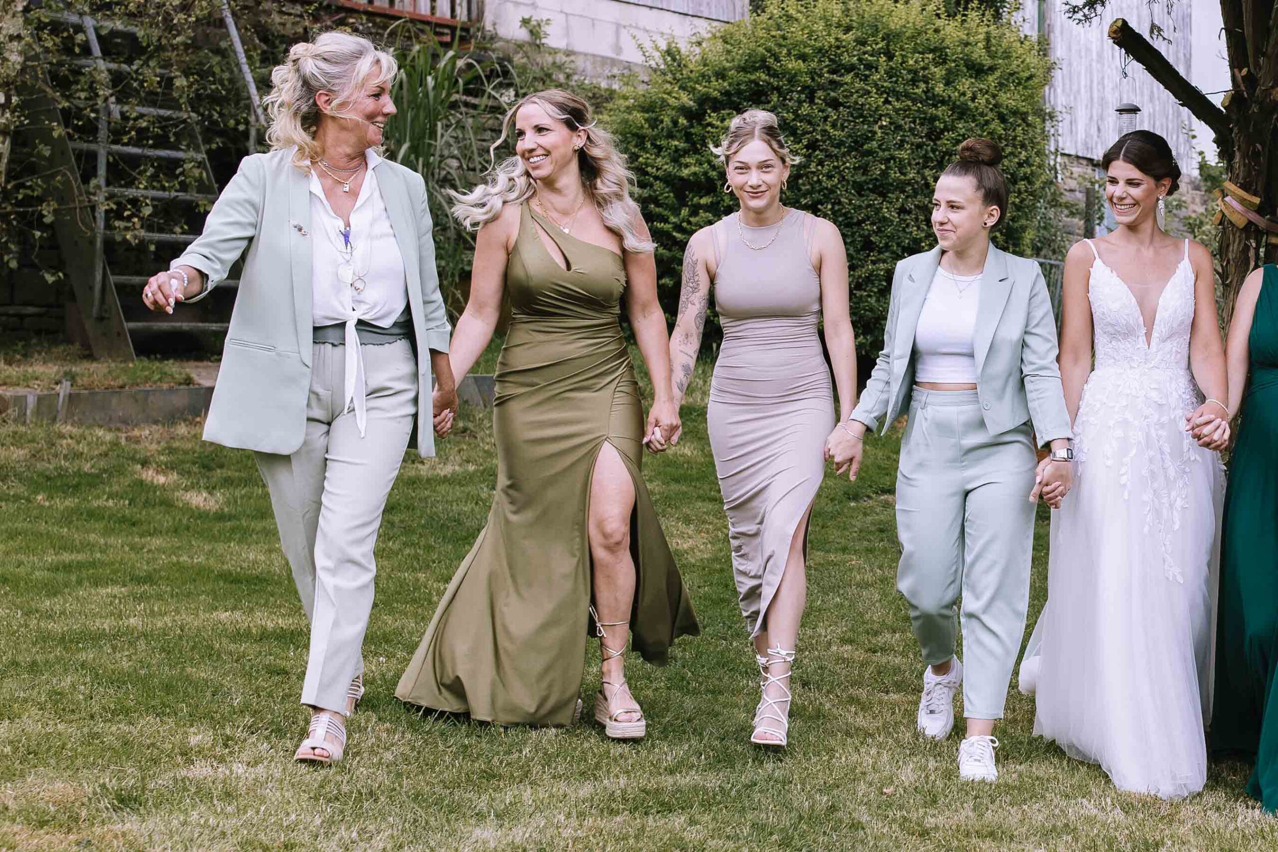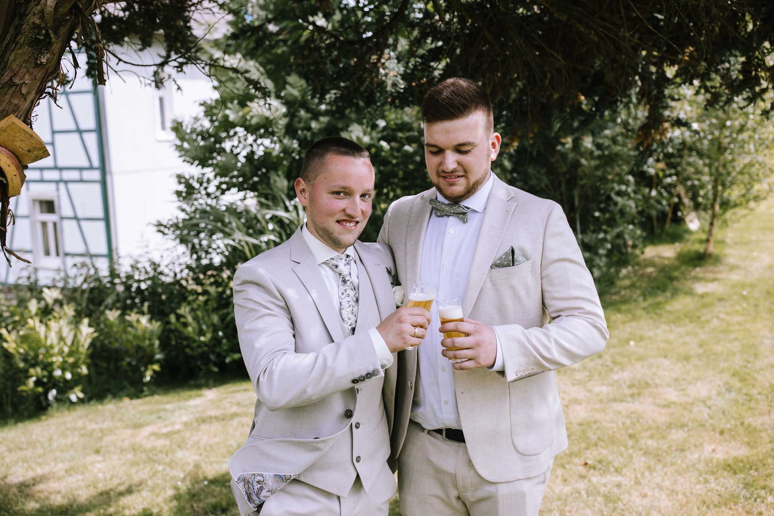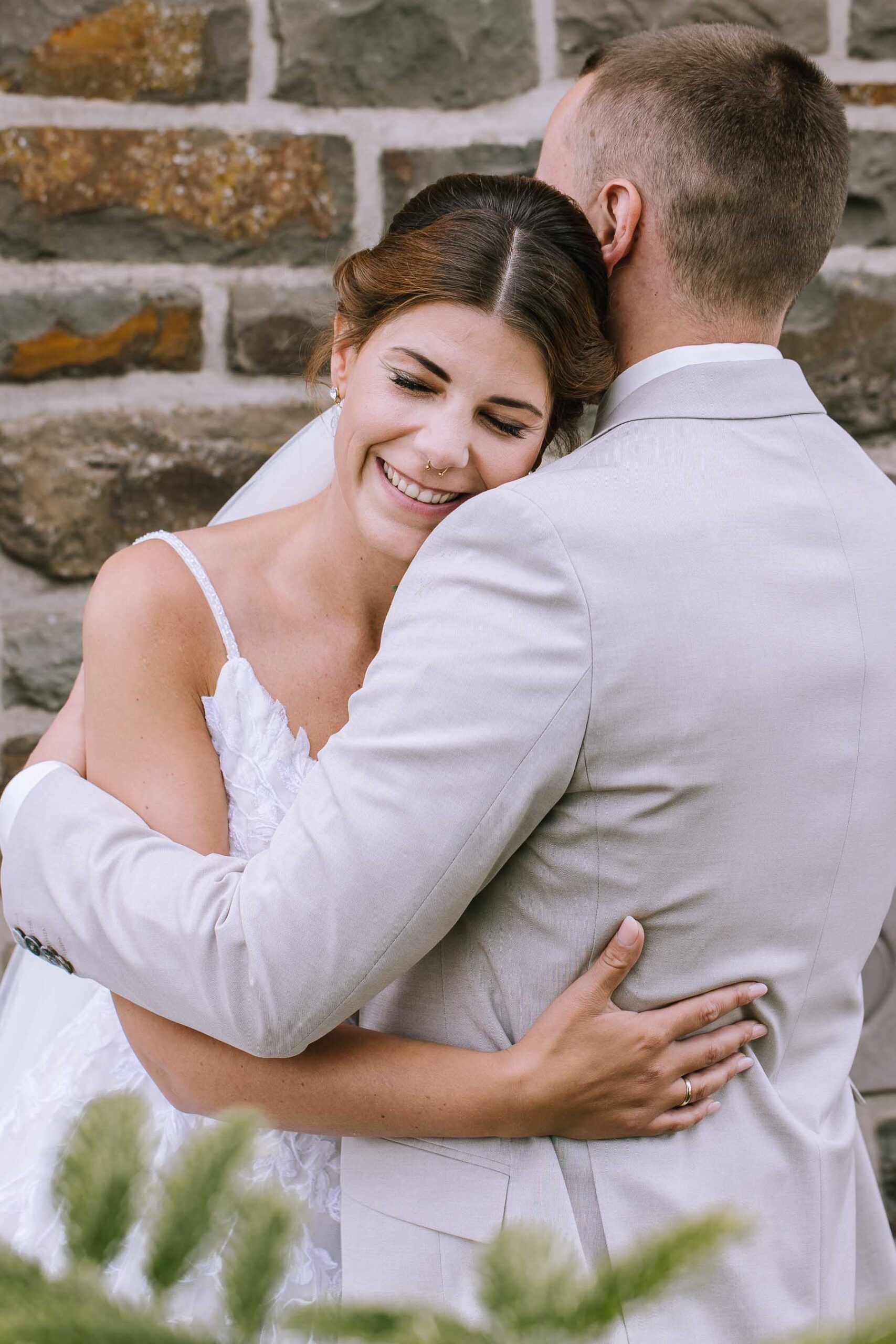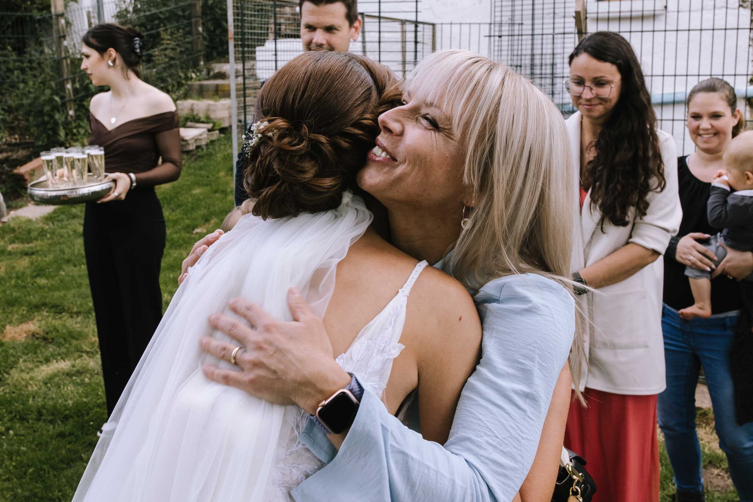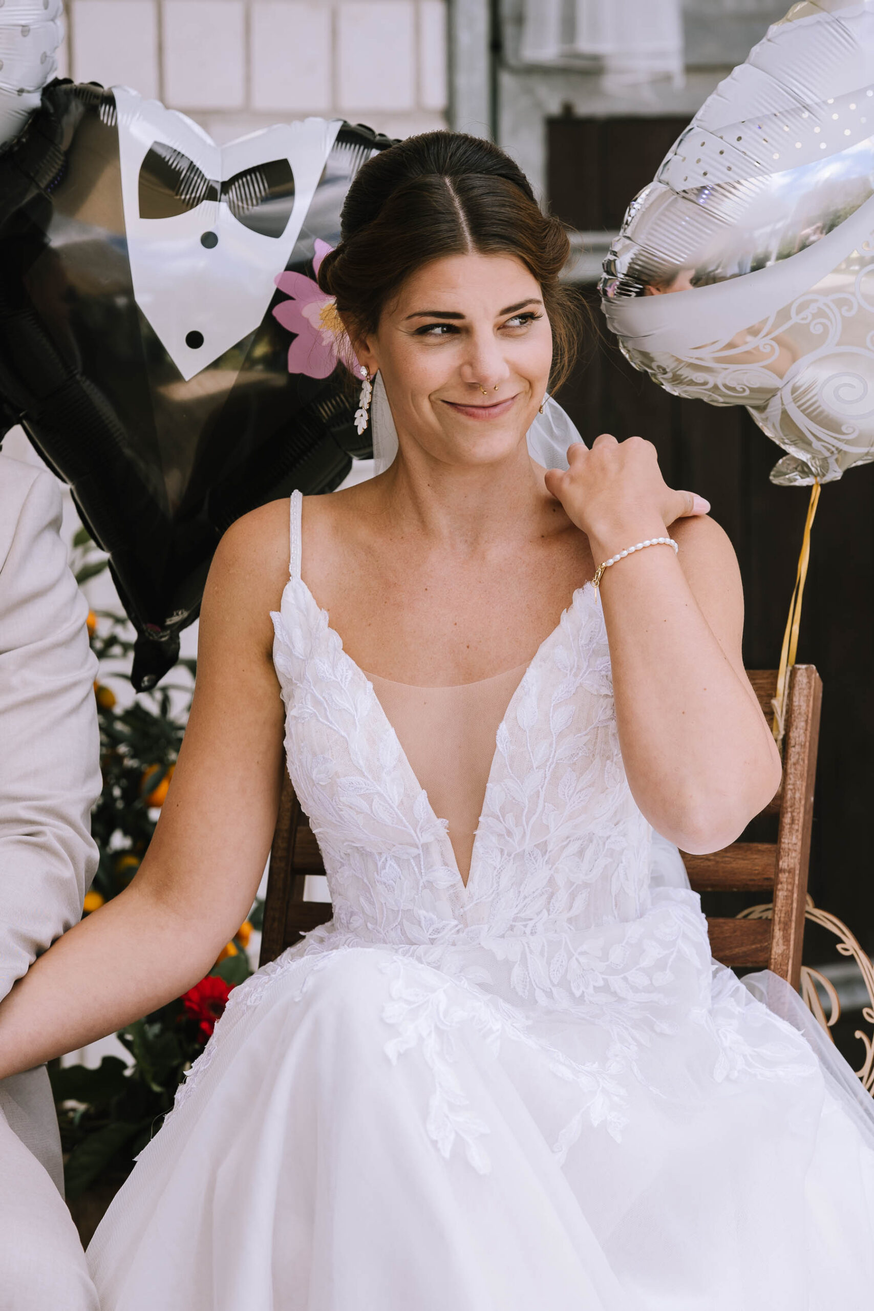 Kulisse festhalten. Wir machten das Shooting auf einem Wiesenhügel, auf dessen Spitze eine kleine Kapelle stand. Schon von weitem sahen wir das Auto mit Mary ankommen, und als sie ausstieg, war es ein unglaublich glücklicher und herzlicher Moment. Es war ein besonderer Augenblick, als Justin seine Braut zum ersten Mal in ihrem Hochzeitskleid sah – und der Moment war so voller Liebe und Emotionen, dass ich ihn mit meiner Kamera einfangen konnte. Die freie Trauung fand direkt am Ponystall statt und war genauso schön, wie wir es uns alle erhofft hatten. Sie war persönlich, fröhlich und voller Wärme. Als besonderes Ritual pflanzten Mary und Justin zusammen einen kleinen Olivenbaum – ein Symbol für ihre wachsende Liebe. Dieses schöne Ritual fügte der Zeremonie noch mehr Bedeutung und Tiefe hinzu. Nach der Trauung ging es zum Sektempfang in den Garten, wo die Gäste das frisch vermählte Paar mit Glückwünschen und Umarmungen empfingen. Es war eine lockere, fröhliche Atmosphäre, die sich auch in den Gruppenfotos widerspiegelte, die wir in der wunderschönen Gartenlandschaft machten. Die natürlichen Farben des Gartens und die entspannte Stimmung machten die Bilder lebendig und authentisch – genau das, was Mary und Justin sich gewünscht hatten. Es war mir eine Ehre, Mary und Justin an diesem besonderen Tag zu begleiten. Als Hochzeitsfotografin in Lindlar hatte ich das Glück, ihre Geschichte mit all ihren schönen Momenten festzuhalten. Vom First-Look über die Trauung bis hin zum Sektempfang – es war ein Tag voller Glück und Liebe, der für immer in meinen Bildern weiterlebt. Ich wünsche den beiden alles Gute für ihren gemeinsamen Weg!