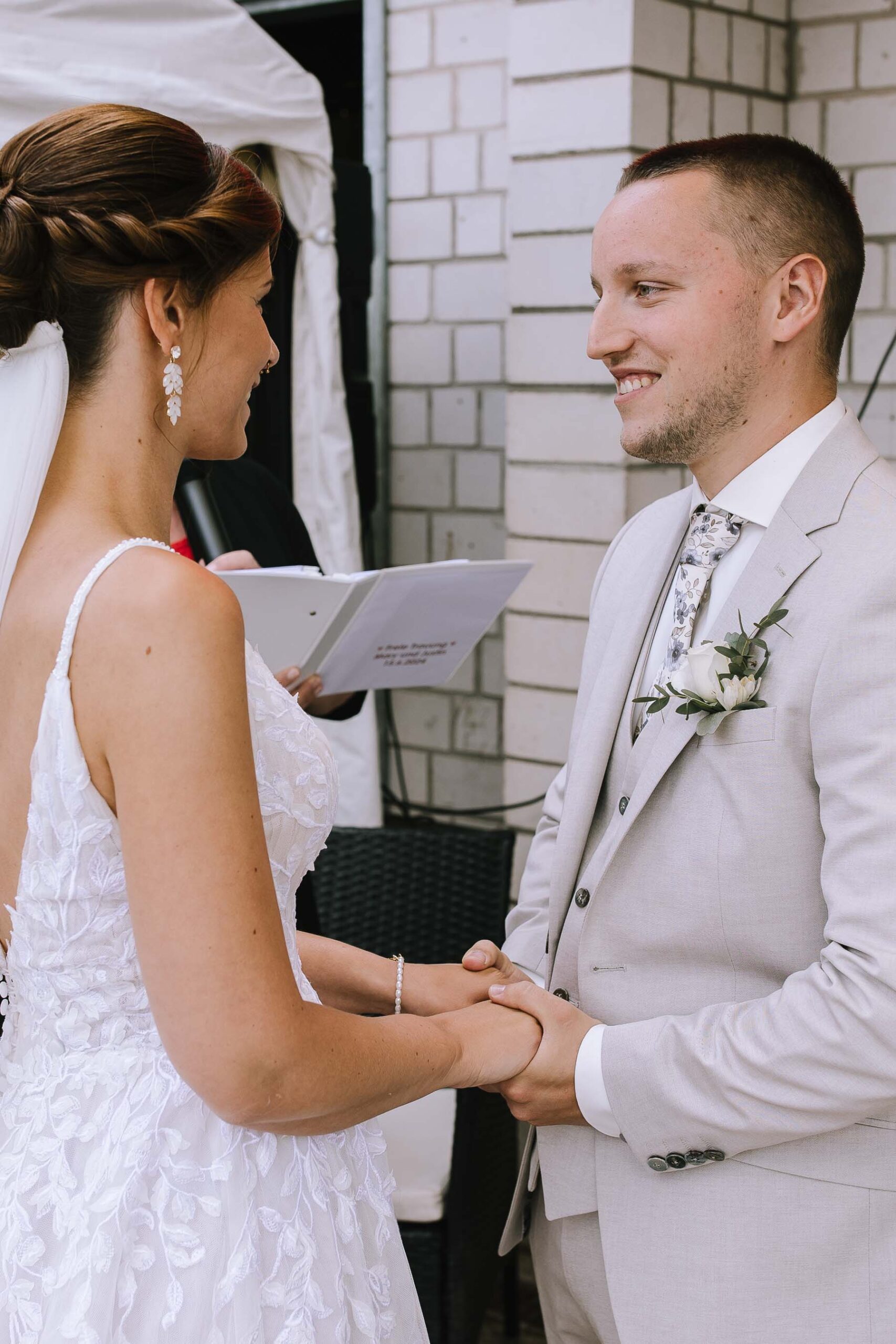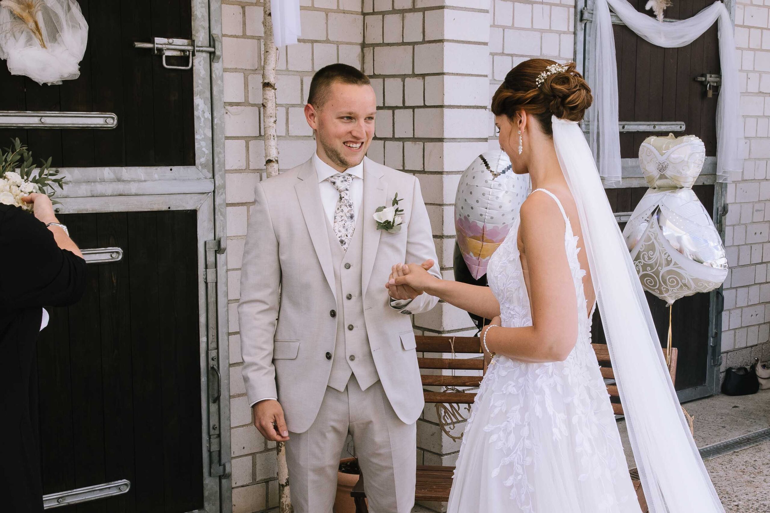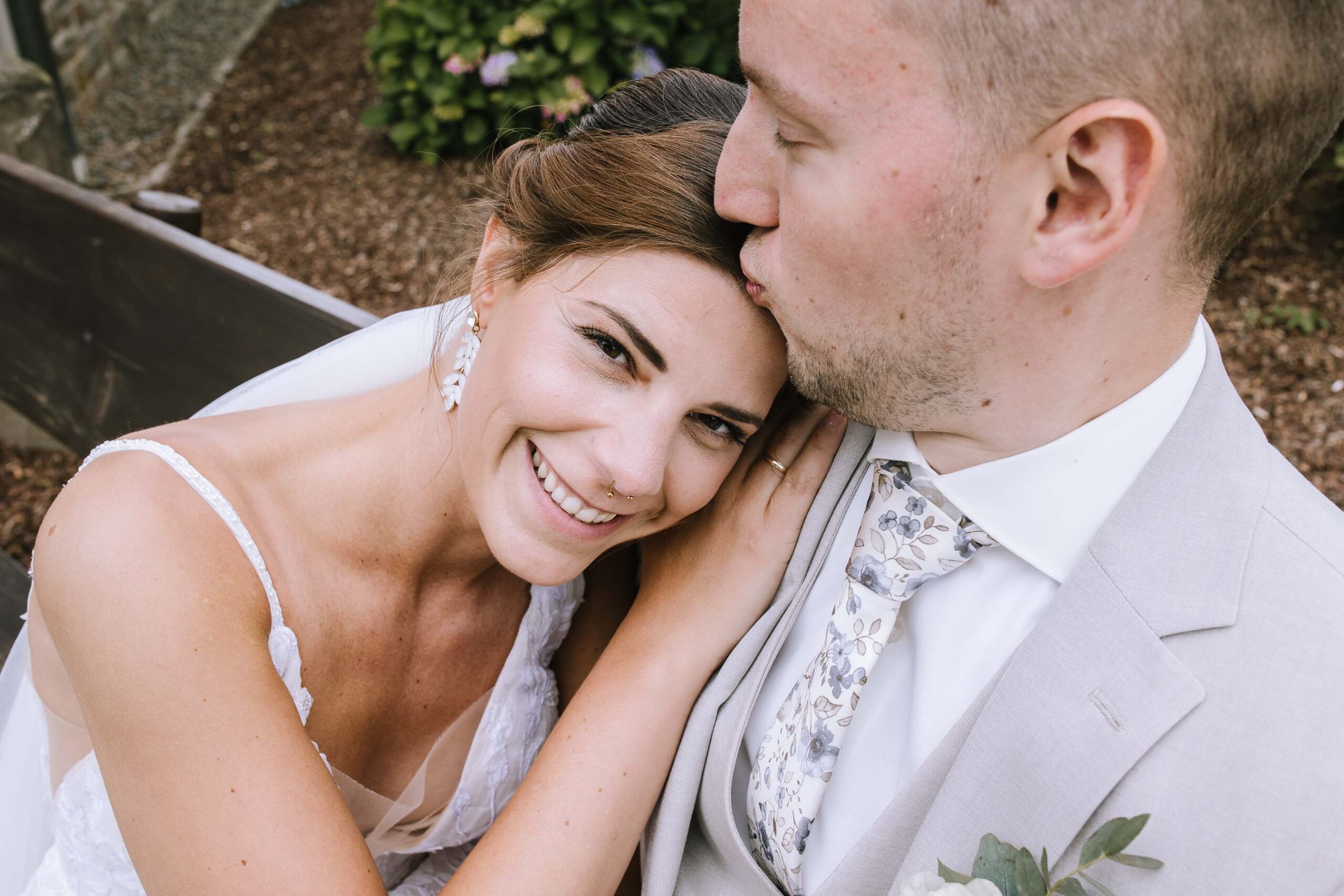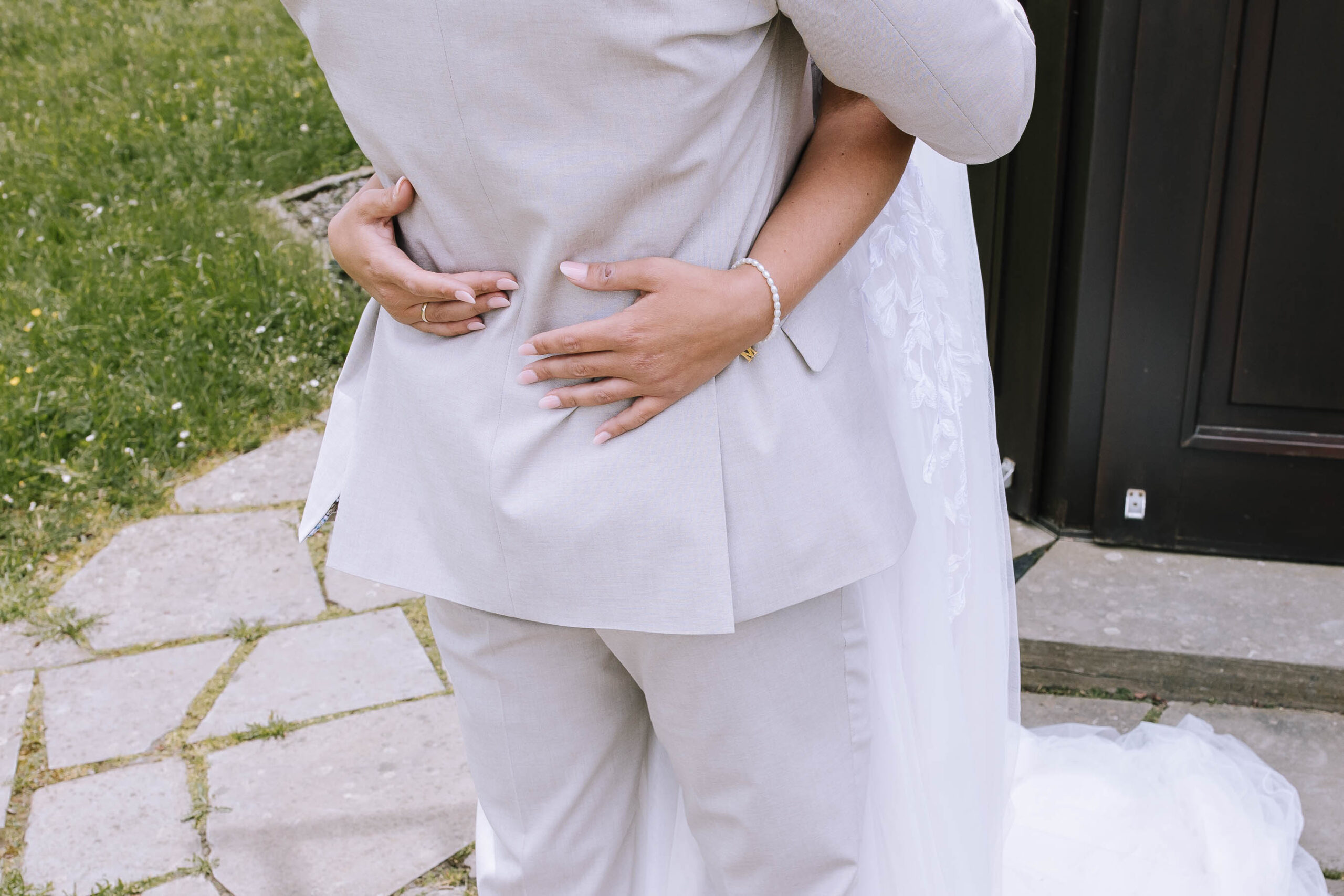 Vor der Hochzeit trafen wir uns ein weiteres Mal, um alles im Detail zu besprechen. Schon beim ersten Gespräch war klar: Die Chemie stimmte und wir waren uns sofort sympathisch. Mary und Justin erzählten mir, dass sie ihre freie Trauung am Ponystall von Justins Eltern feiern wollten – eine tolle Idee, die zu ihnen und ihrer lockeren, natürlichen Art perfekt passte. Der Ponystall war von einem wunderschönen Garten umgeben, und das Wetter spielte glücklicherweise mit, sodass es ein wahrer Traumtag wurde. Für das First-Look-Shooting hatten die beiden einen besonderen Wunsch: Sie wollten den Moment der ersten Begegnung in einer idyllischen, natürlichen