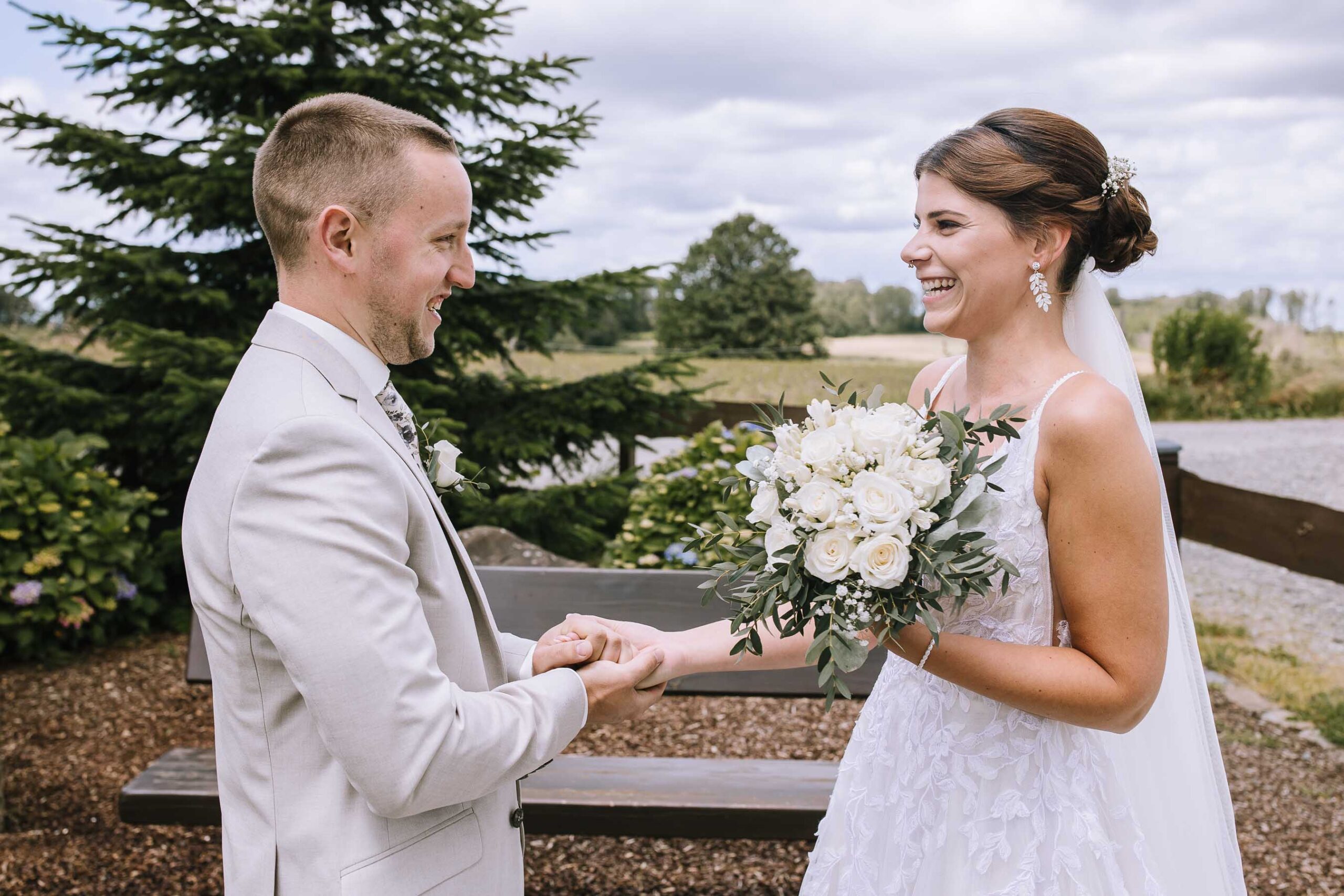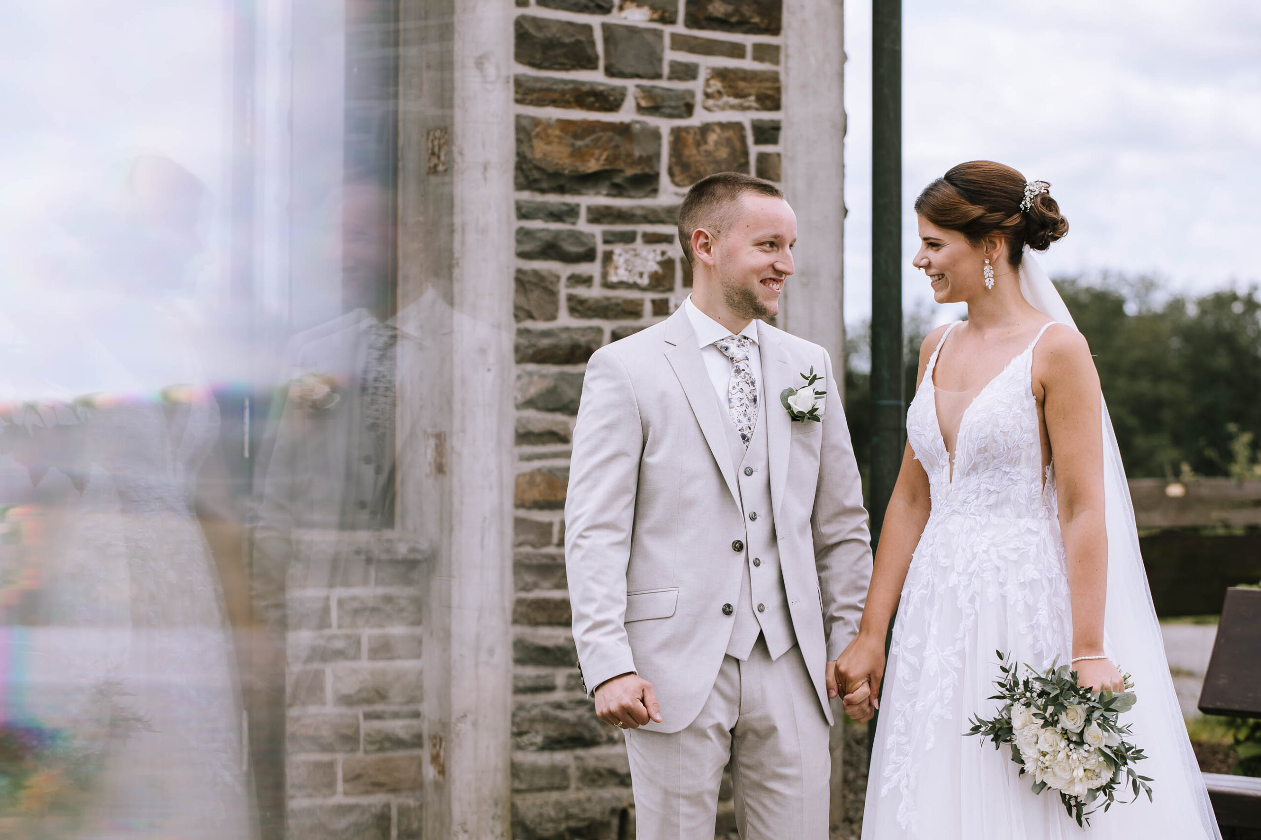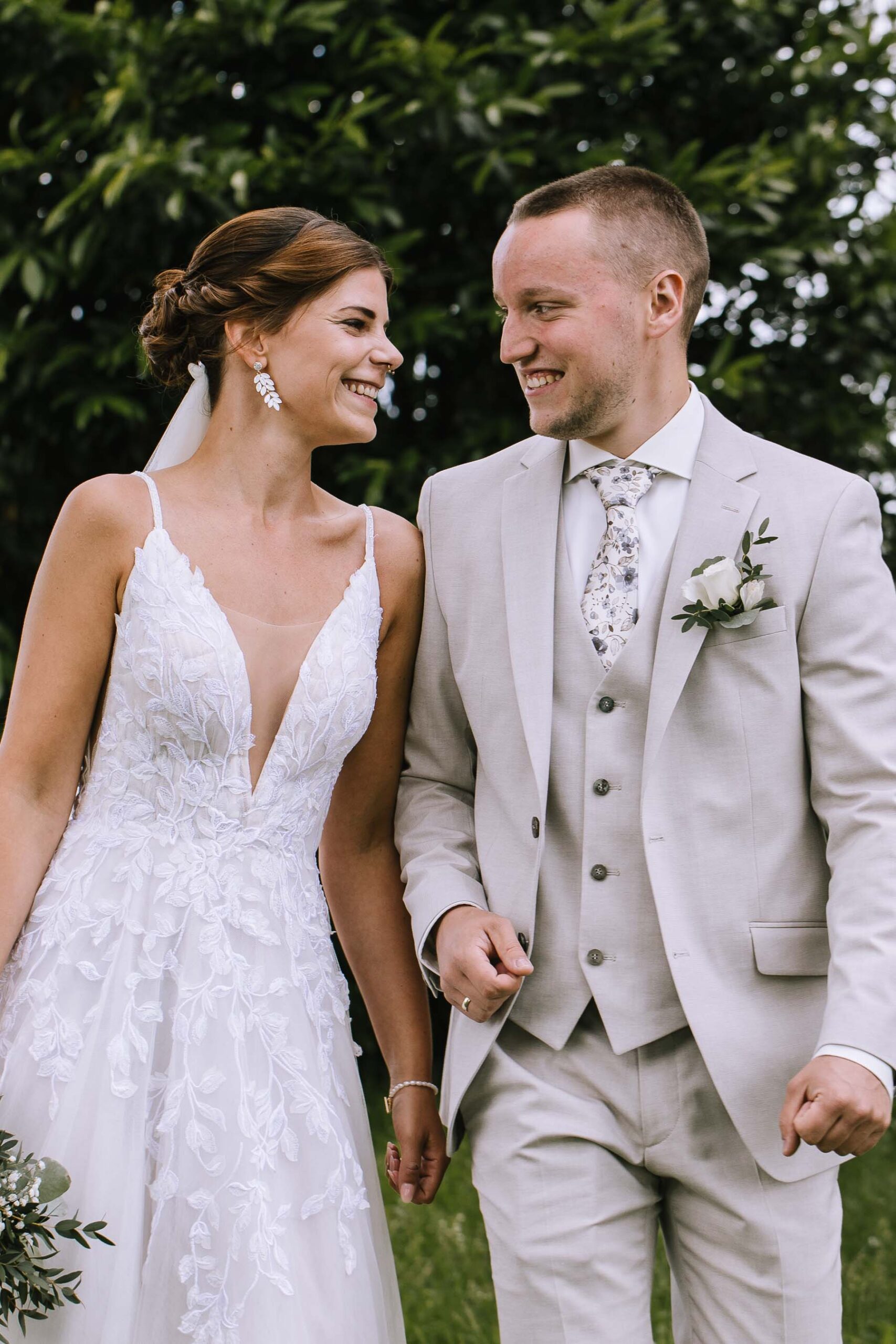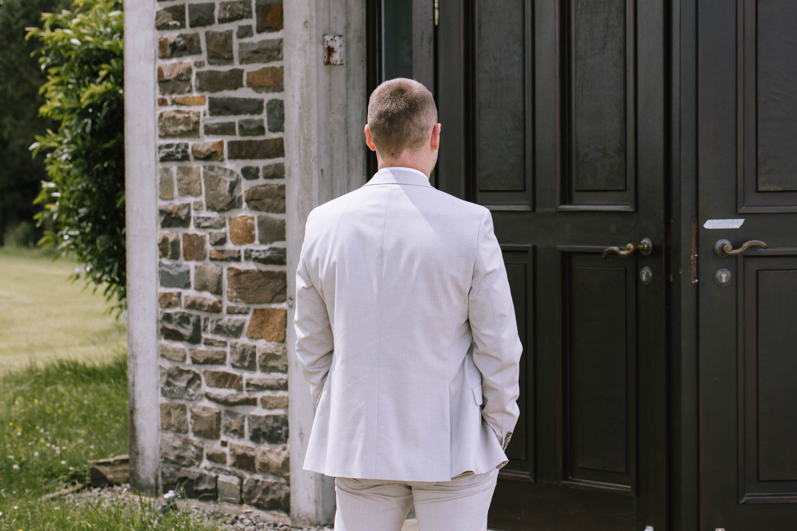 Vor der Hochzeit trafen wir uns ein weiteres Mal, um alles im Detail zu besprechen. Schon beim ersten Gespräch war klar: Die Chemie stimmte und wir waren uns sofort sympathisch. Mary und Justin erzählten mir, dass sie ihre freie Trauung am Ponystall von Justins Eltern feiern wollten – eine tolle Idee, die zu ihnen und ihrer lockeren, natürlichen Art perfekt passte. Der Ponystall war von einem wunderschönen Garten umgeben, und das Wetter spielte glücklicherweise mit, sodass es ein wahrer Traumtag wurde. Für das First-Look-Shooting hatten die beiden einen besonderen Wunsch: Sie wollten den Moment der ersten Begegnung in einer idyllischen, natürlichen