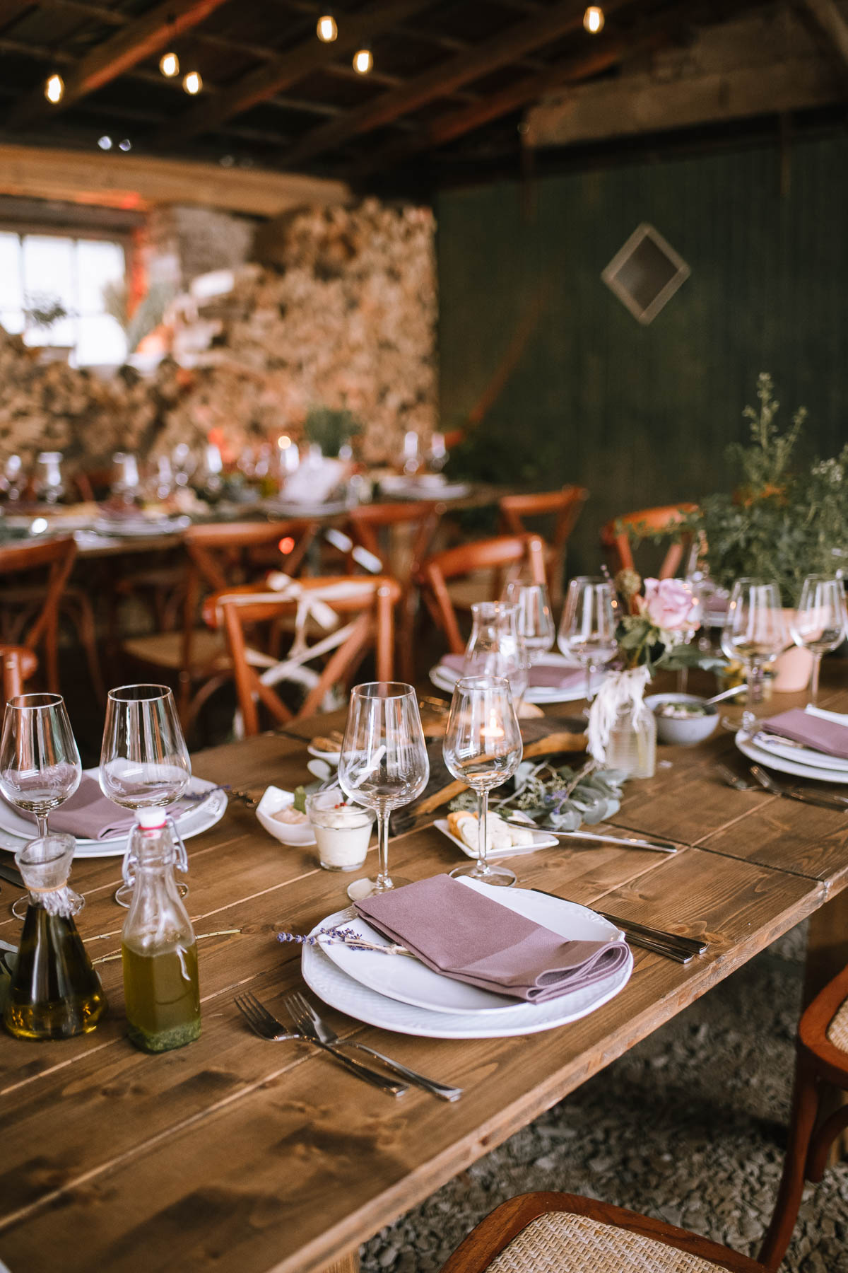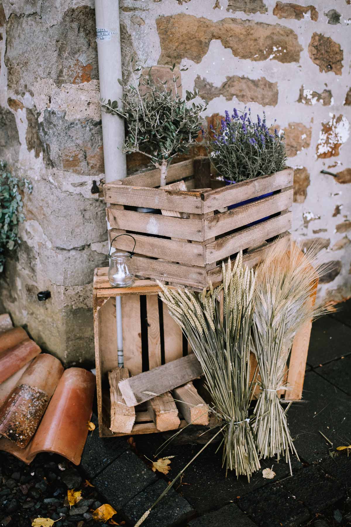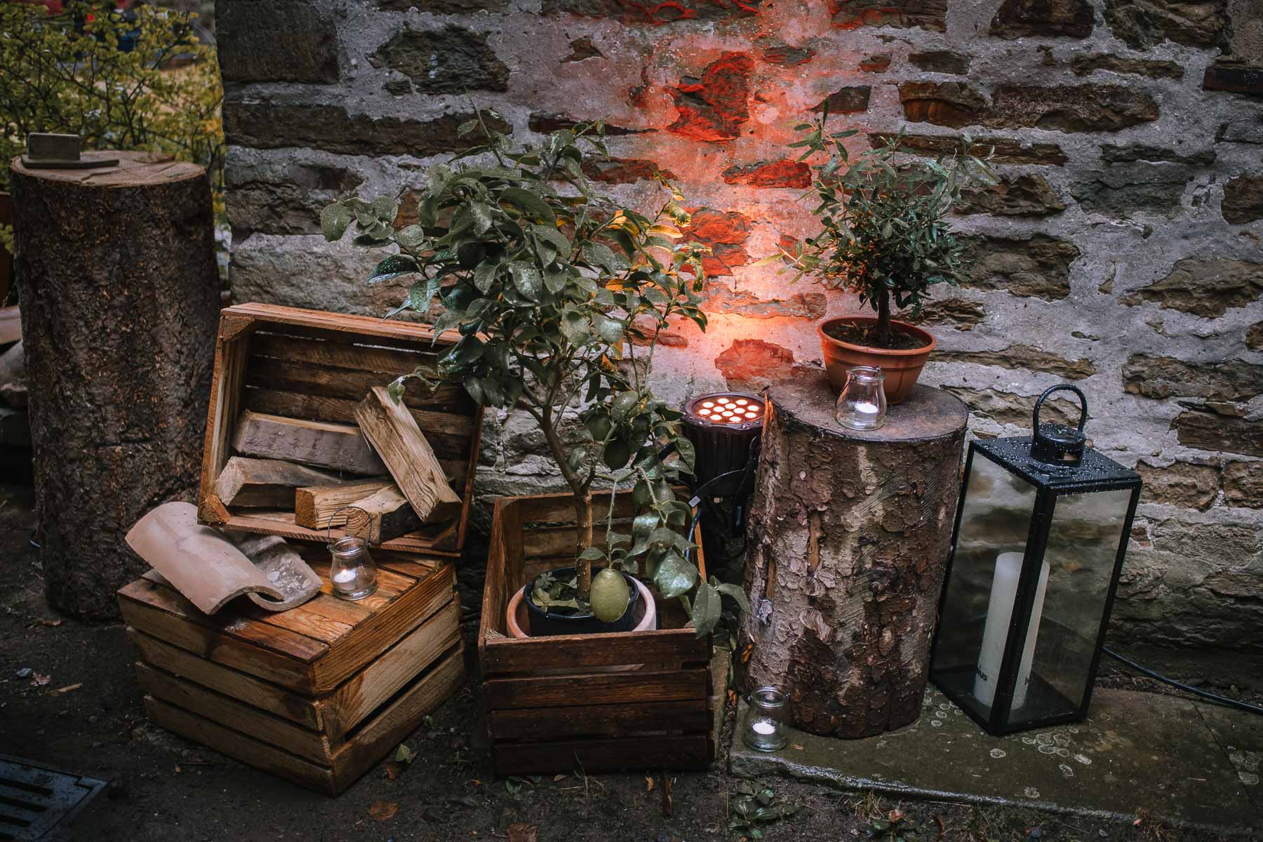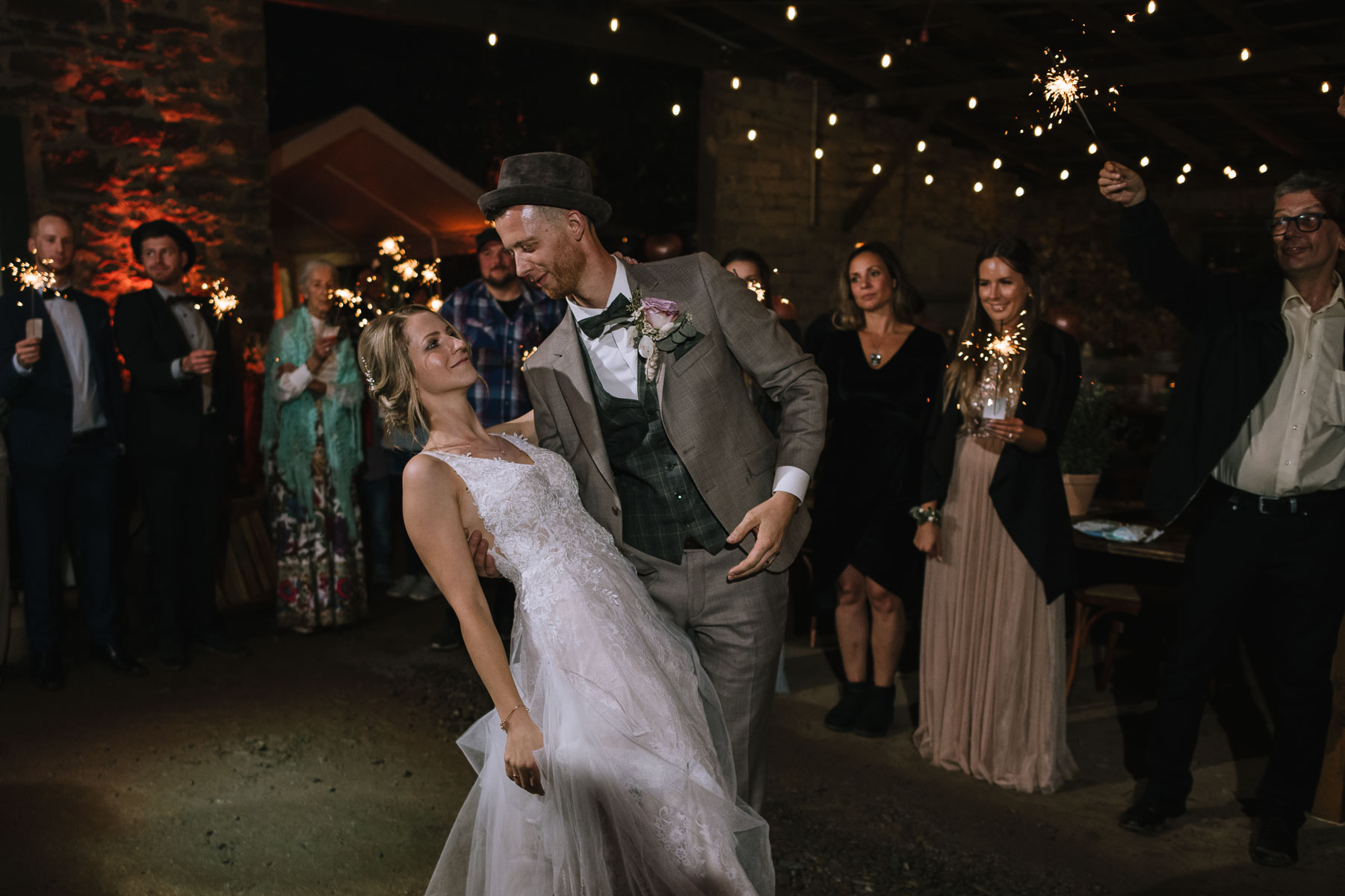 Irgendwann im Sommer traf ich mich mit Julia und Gion hier in Meinerzhagen im italienischen Eiscafé. Denn: die Beiden sind richtige Travelfans und Italien hatte es ihnen besonders angetan: die schöne hügelige Landschaft, gutes Essen, italienische Gastfreundlichkeit. Schon zu Beginn merkten wir, dass das ein langes, intensives Gespräch werden würde. So intensiv, dass wir in ein anderes Eiscafé wechseln mussten, da das erste schon bald schließen würde. Die Beiden erzählten mir von ihrer Traumhochzeit, die zunächst in einer anderen Location in Kierspe stattfinden sollte. Lange Tischreihen, Lichterketten, Livemusik, Olivenzweige und Zitronenbäume – so hatten die beiden ihren großen Tag im Frühjahr des nächsten Jahres vor Augen. Doch dann kam die Pandemie und die Hochzeit musste verschoben werden. Doch nicht nur das machte den Beiden einen Strich durch die Planung. Denn zwei Wochen vor dem Ausweichtermin offenbarte die Location plötzlich, dass sie die Hochzeit nicht so wie besprochen durchführen können würde. Doch auch diese Hiobs-Botschaft ließ Julia und Gion nicht aufgeben. Kurzerhand schnappten sie sich ihre besten Freunde und Verwandten und drehten den Bauernhof eines Bekannten drei mal auf links und räumten auf, was das Zeug hielt. Und tatsächlich schafften sie es, aus einer alten Scheune eine wunderschöne Hochzeitslocation zu schaffen. Natürlich mit Olivenzweigen, Zitronenbäumchen, langen Tischen, Lichterketten und Livemusik.