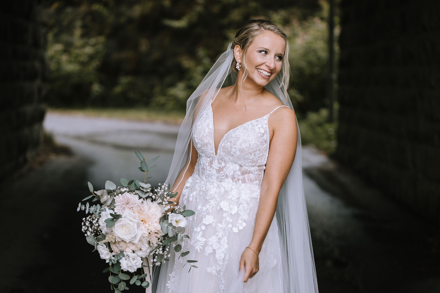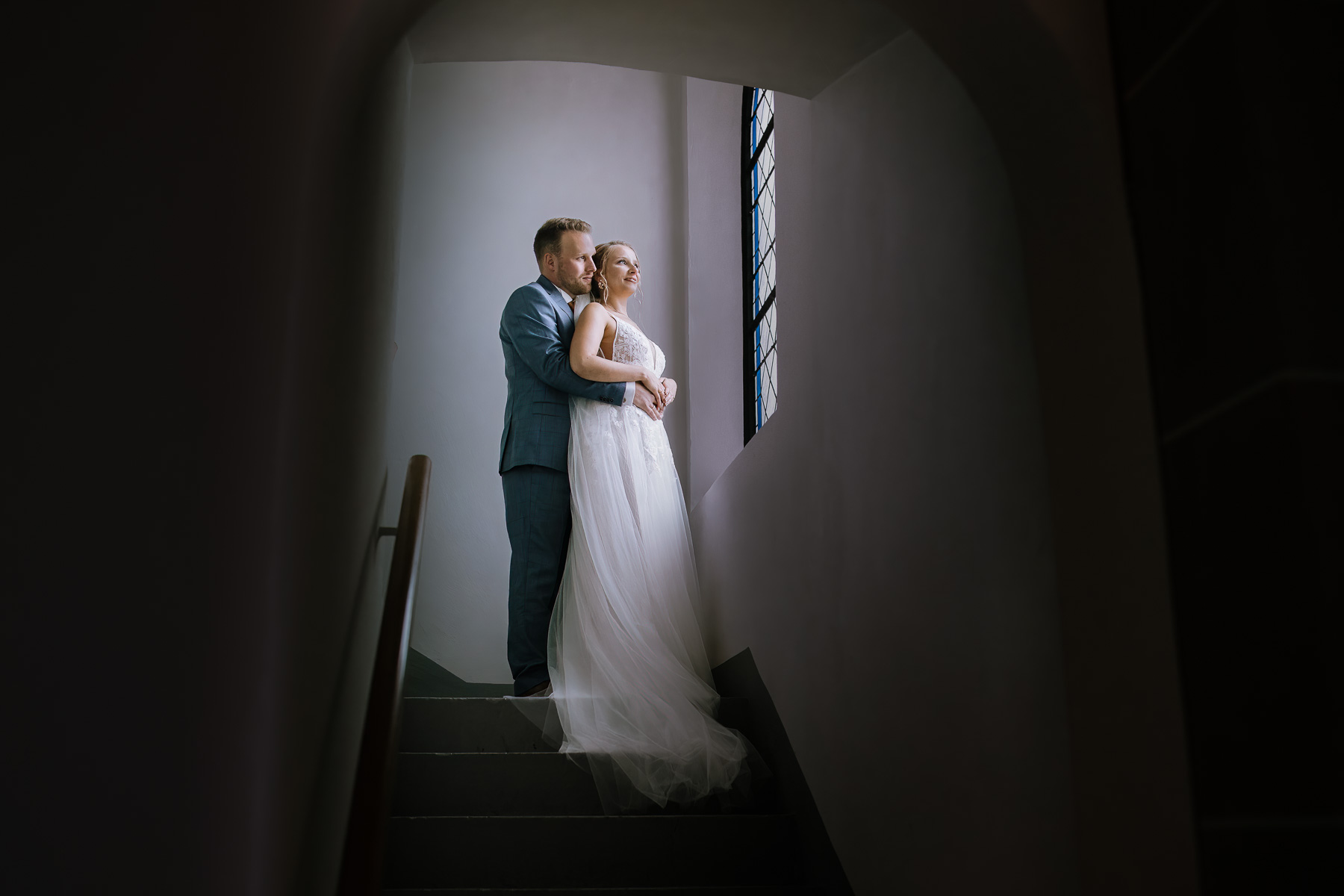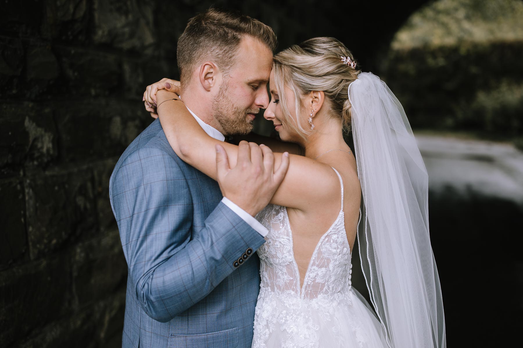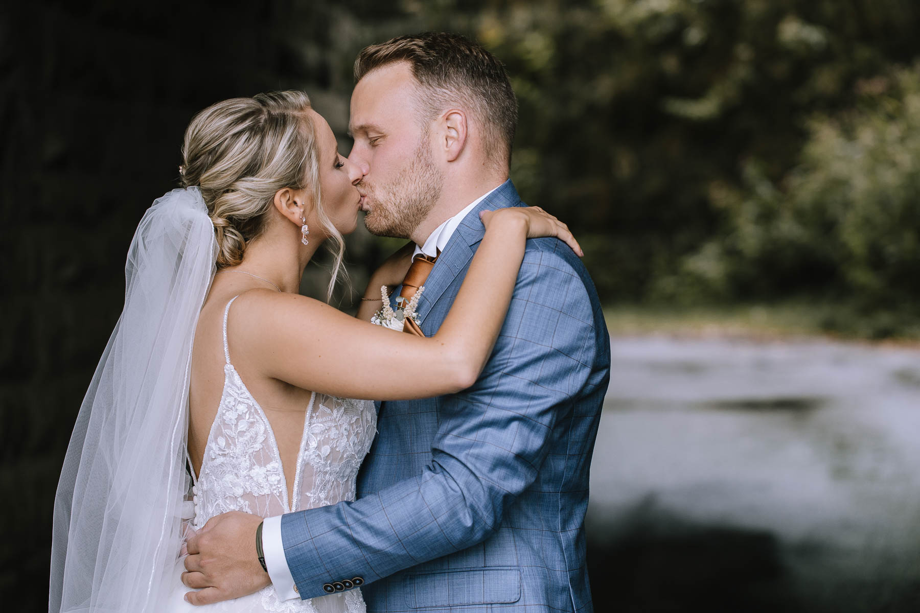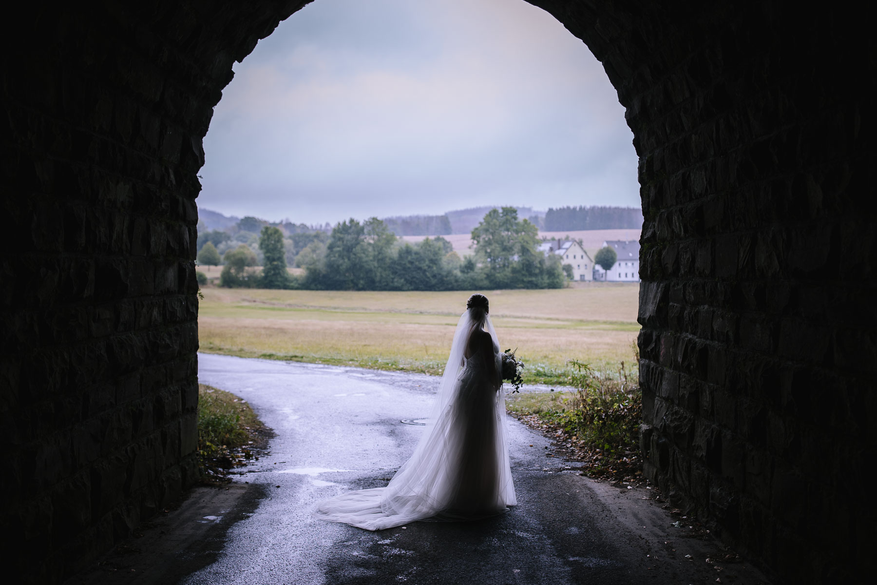 Julia und Mirko lernte ich Anfang des Jahres bei einem persönlichen Vorgespräch bei ihnen zu Hause kennen. Nachdem ich mit einem leckeren Kaffee begrüßt wurde, ahnte ich schon, dass das ein netter Abend werden würde. Und genau so war es auch. Wir verstanden uns auf Anhieb sehr gut und gingen gemeinsam den Tagesablauf durch. Die beiden planten, ihre Hochzeit im Hotel Sportalm in Lüdenscheid zu feiern, zu dem auch eines meiner Lieblings-restaurants hier im Sauerland gehört. Doch wir teilten noch eine Gemeinsamkeit, denn Julia und Mirko wollten sich kirchlich in der Jesus-Christus-Kirche in Meinerzhagen trauen lassen und jetzt dürft ihr mal raten, wer fast direkt daneben wohnt, dort geheiratet und seine Kinder taufen lassen hat? Richtig geraten. 🙂 Am Tag der Hochzeit regnete es wie aus Eimern, doch auf das Getting Ready, das in der Hochzeitssuite des Hotels Sportalm und in einem schönen gemütlichen Hotelzimmer mit Hüttenfeeling stattfand, hatte das keinen Einfluss. Für das First-Look-Shooting hatten wir uns im Vorfeld für einen Tunnel entschieden, der uns vor dem Regen schützte. Mirko stand am Ende dieses Tunnels, als Julia von hinten erschien und ihn überraschte. Und diese Überraschung ist auch mehr als gelungen. Nach einer kleinen Pause zu Zweit machten wir dann noch ein kleines