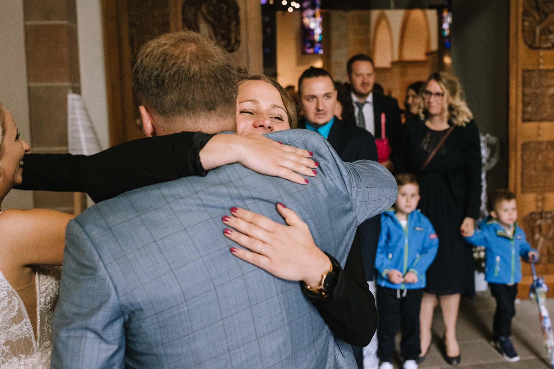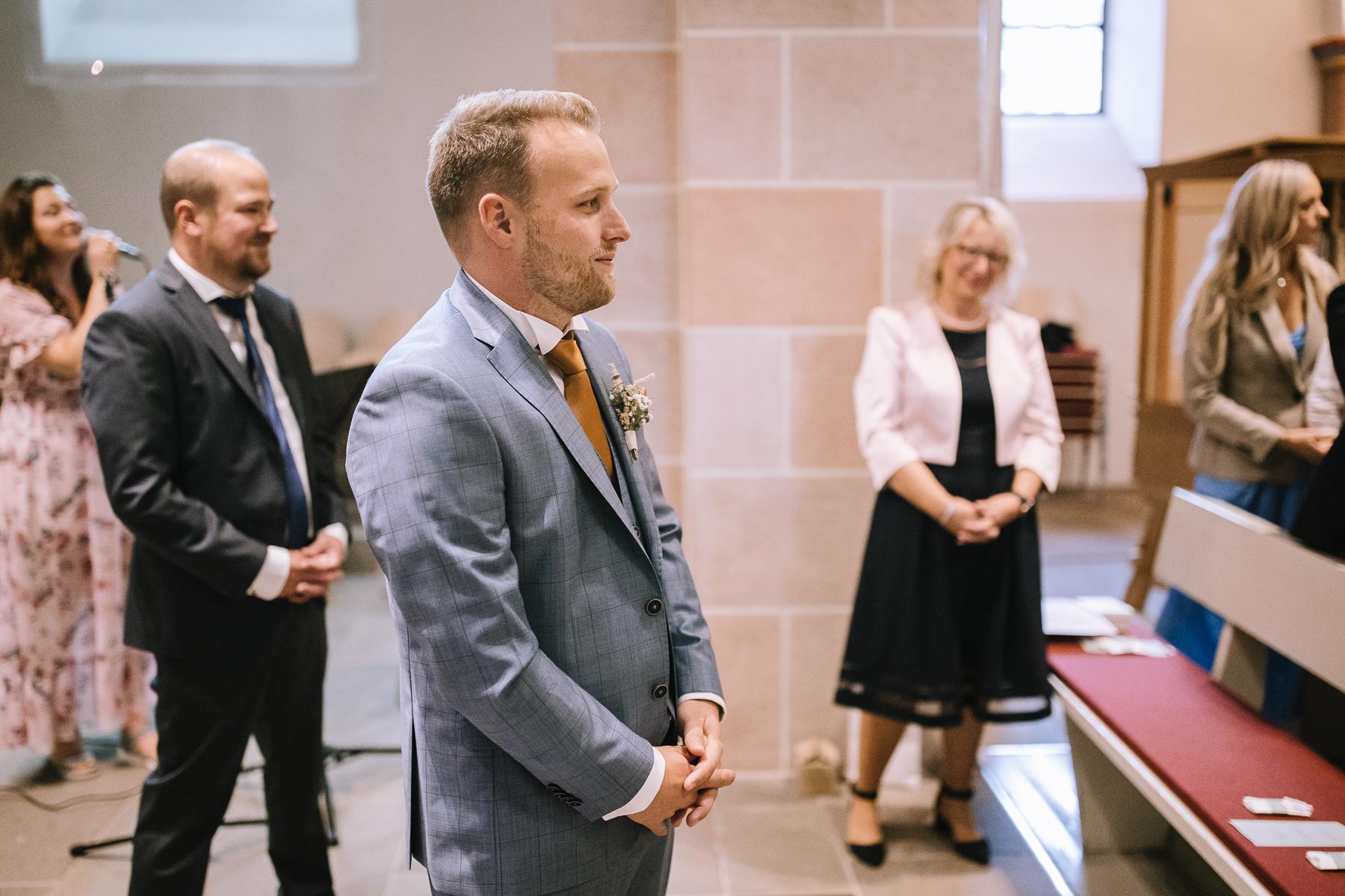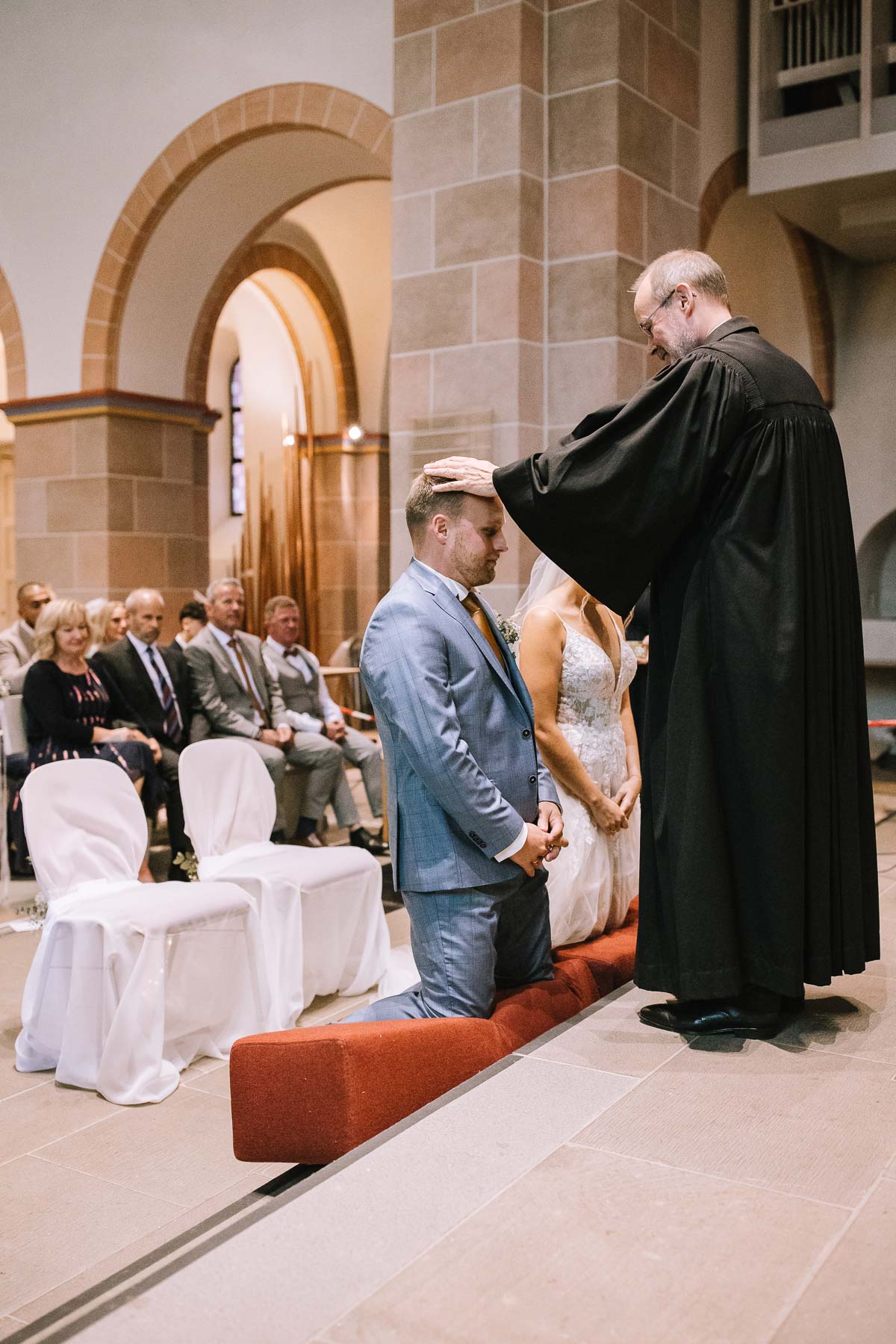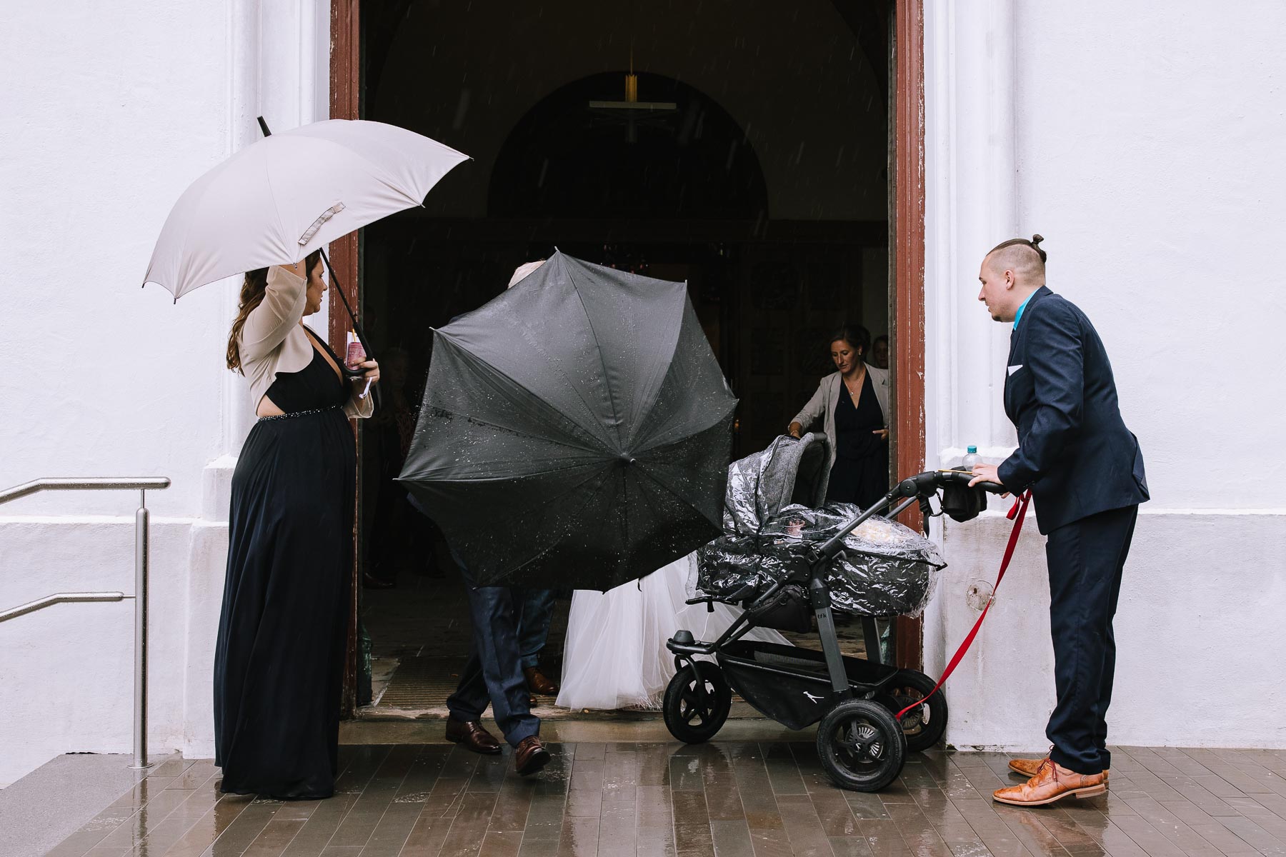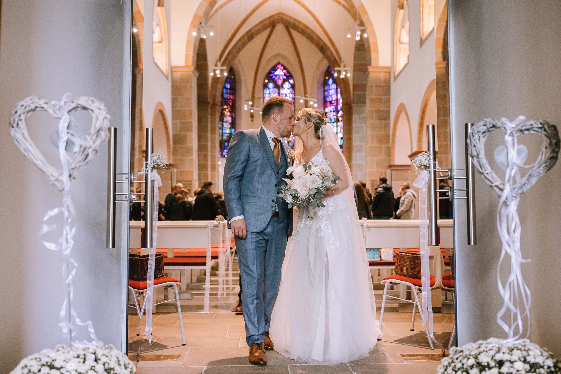 Brautpaarshooting, da der Blick in den Himmel wettertechnisch nichts gutes verhieß. Die Trauung war wunderschön und die Sängerin sorgte das eine oder andere Mal für Gänsehaut. Nach der Trauung gingen wir erstmal gemeinsam ins Gemeindehaus, wo unser Brautpaar von den Gästen mit Weddingwands und Blumenkindern in Empfang genommen wurden. Nach einem Gläschchen Sekt und einem kleinen Snack gingen wir wieder zurück in die Kirche, wo wir die Gruppenfotos machen wollten. Sofort erklärte ich mich bereit, mich freiwillig mit meinem Schirm in den strömenden Regen zu stellen, weil ich mir im Kopf ausgemalt hatte, das Eingangsportal stilistisch als Rahmen für die Gruppenbilder zu verwenden und zum anderen wollte ich gerne auch den Regel als Stilmittel mit in die Bilder einbauen. Wie das geklappt hat und was dabei herausgekommen ist, seht ihr in der Galerie. Bevor Julia & Mirko dann zurück zu ihren Gästen gingen und mein Part erledigt war, entführte ich die beiden nochmals und machte einige Bilder in der Kirche. Ein Einfall, der sich definitiv gelohnt hat. So, und jetzt seid ihr an der Reihe: viel Spaß beim Anschauen!