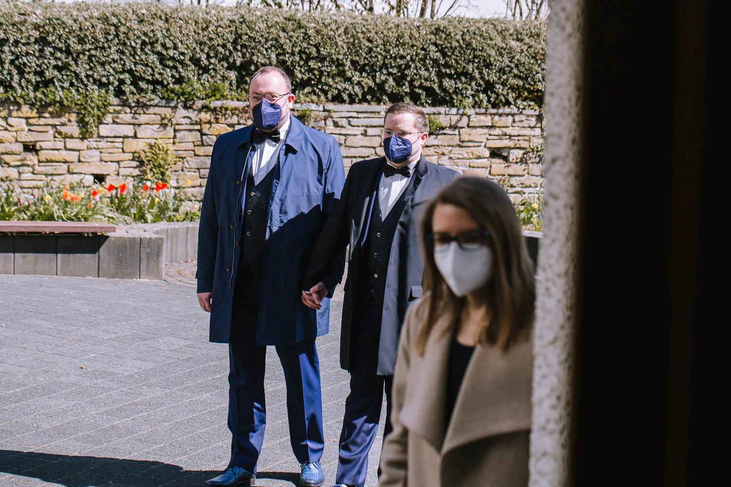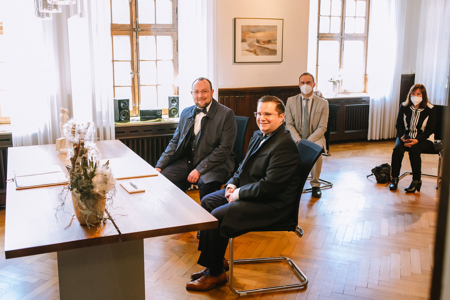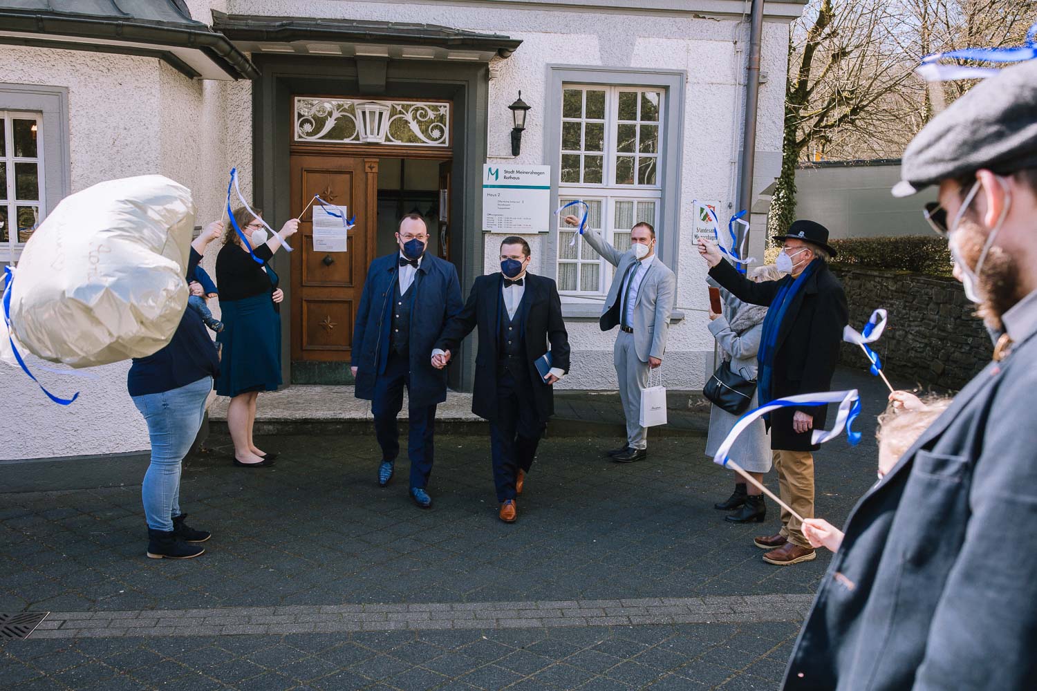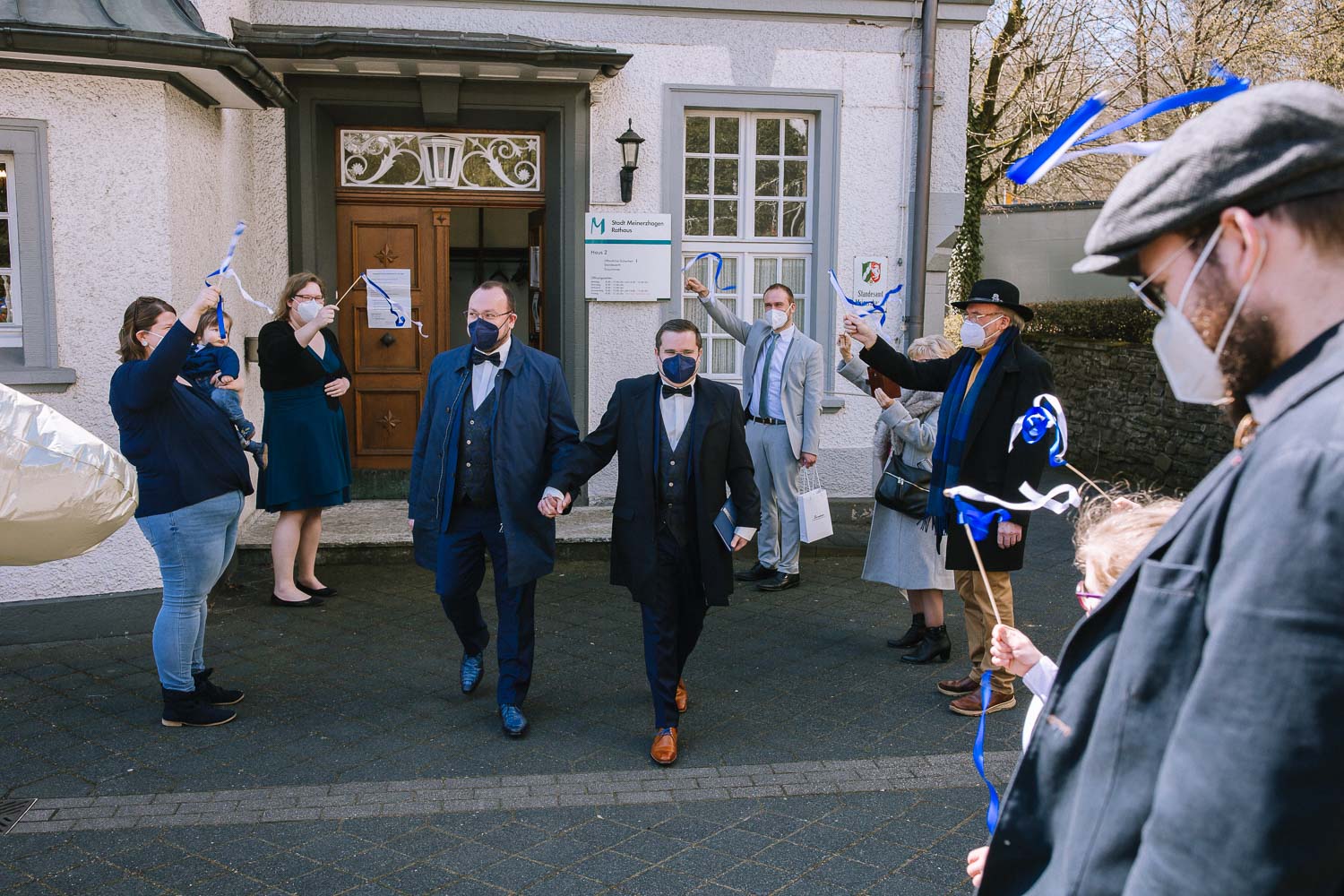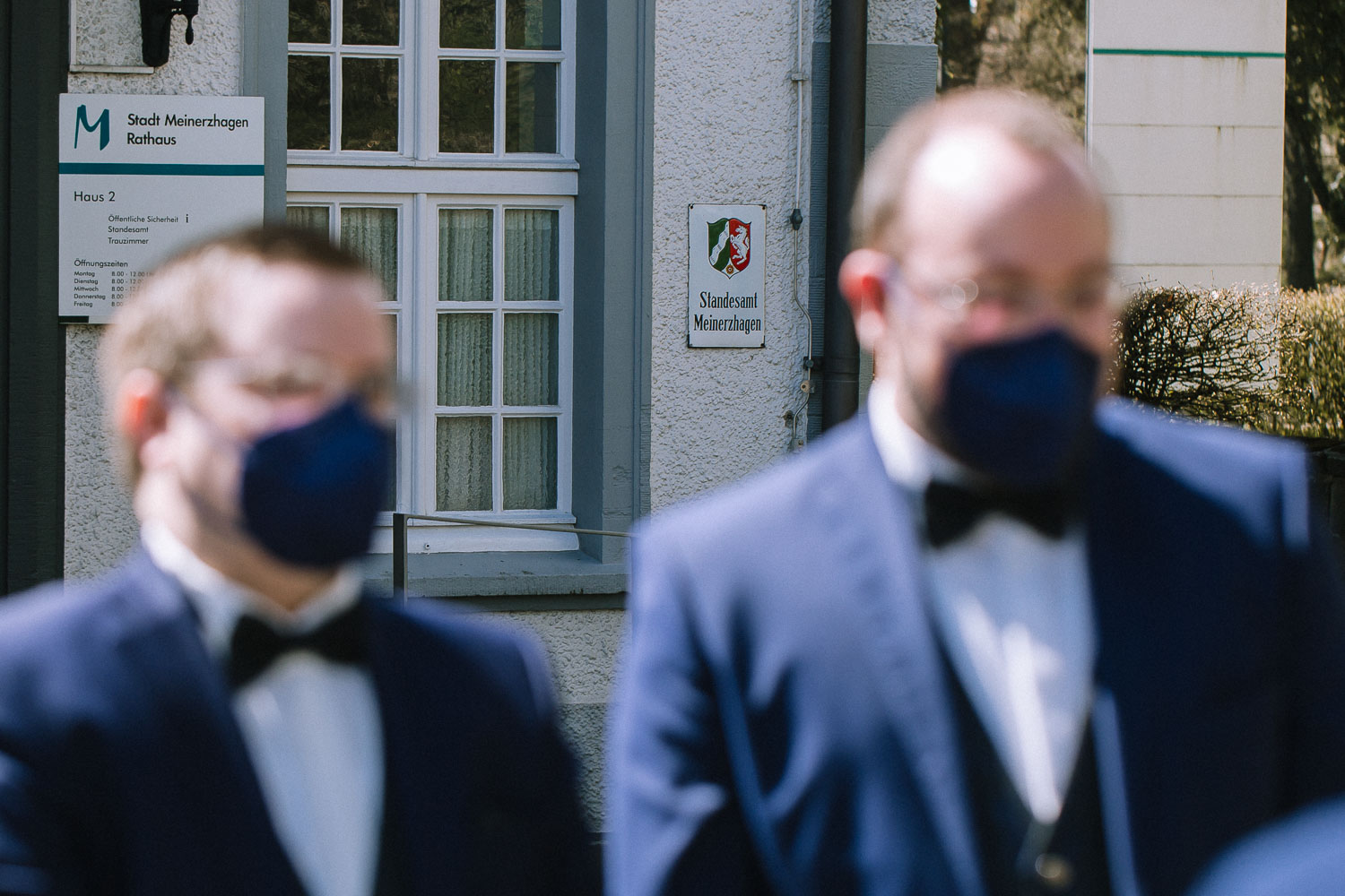 Florian und Sebastian waren tatsächlich mein erstes gleichgeschlechtliches Paar, das ich am Tag ihrer Trauung begleiten durfte. Schon während des Vorgesprächs in einem Café mit lecker Kaffee und Kuchen habe ich gemerkt, was für zwei großartige Menschen da vor mir saßen. Umso mehr freute ich mich, als die Nachricht kam, dass ich die Beiden am Tag ihrer Trauung im Standesamt Meinerzhagen mit anschließendem Bräutigamshooting an der Villa im Park Meinerzhagen und Feier im Hotel Sportalm Gipfelglück begleiten darf. Doch dann machte uns eine gewisse Pandemie mit „C“ einen Strich durch die Rechnung, sodass beinahe alles auf der Kippe stand. Doch auch für dieses Problem fanden wir schnell eine Lösung. Bezieheungsweise waren es eigentlich Florian und Sebastian, die eine Lösung fanden. Denn die ließen sich nicht unterkriegen und zogen die standesamtliche Trauung einfach durch. Zwar durften nur wenige Personen mit ins Trauzimmer und auch ich durfte nur ganz kurz die Kamera durch die Tür halten, um eine Handvoll Bilder zu machen, aber trotzdem waren alle Lieblingsmenschen von Florian und Sebastian dabei und empfingen die Beiden herzlich mit selbstgemachten Weddingwands draußen vor dem Standesamt Meinerzhagen. Nach der Gratulation und dem Sektempfang machten wir uns auf den Weg in den