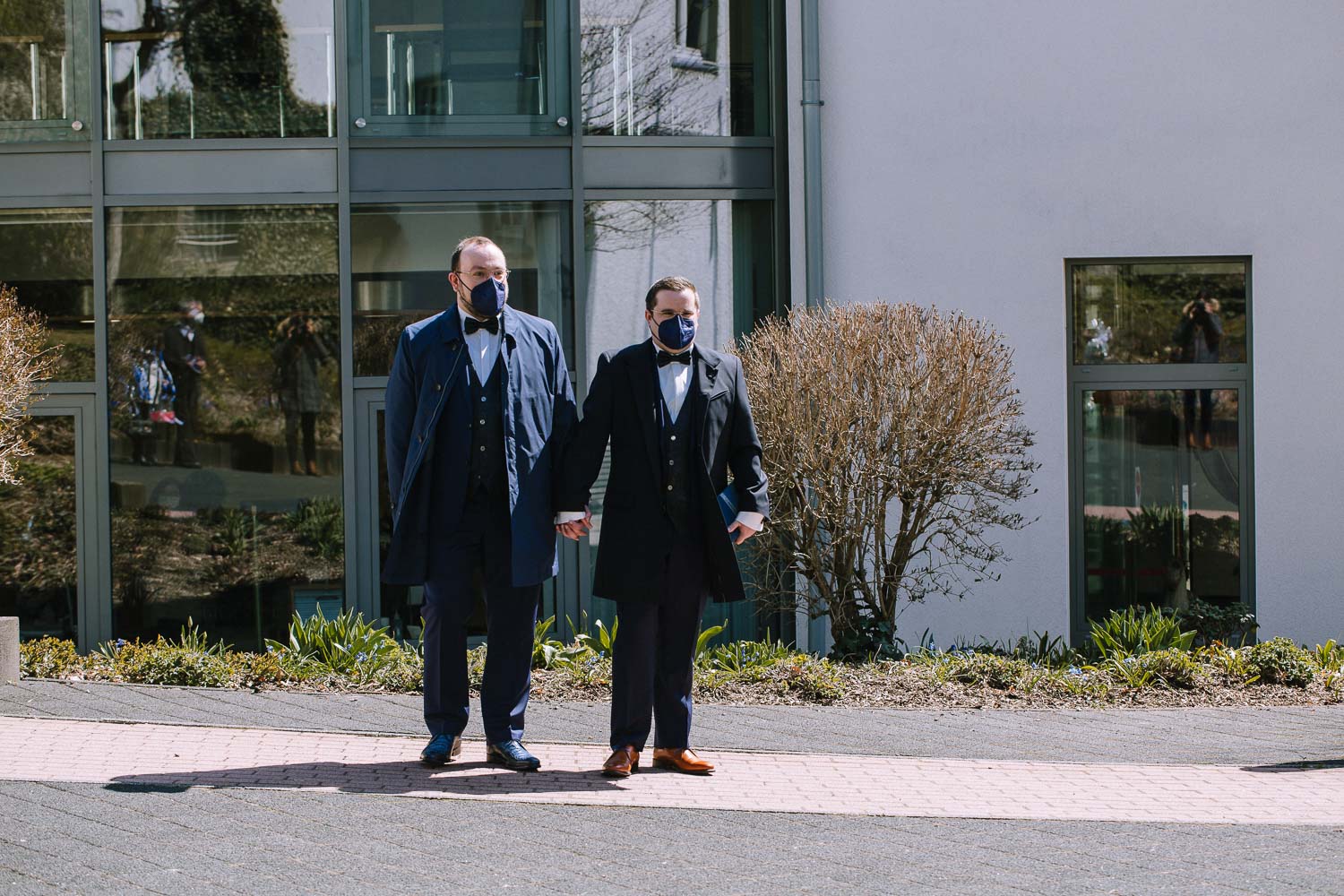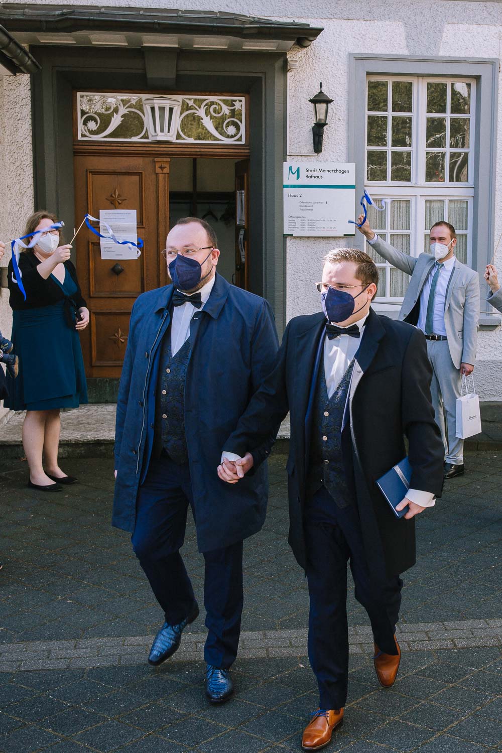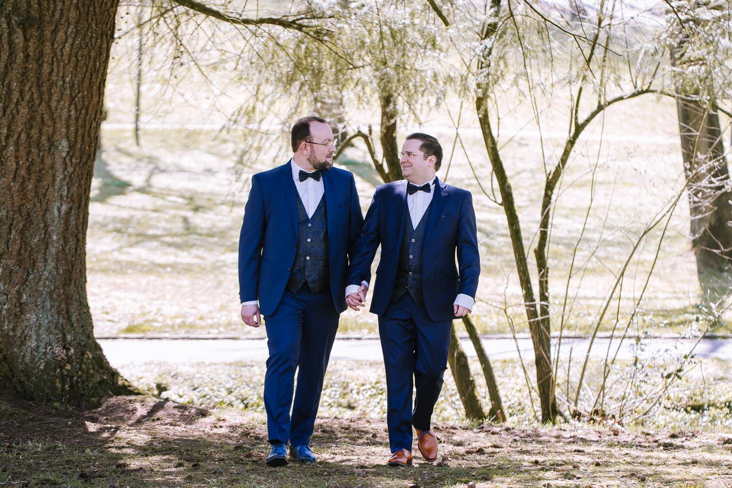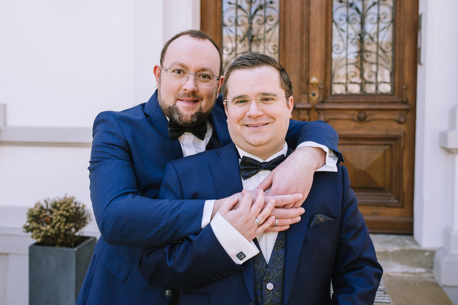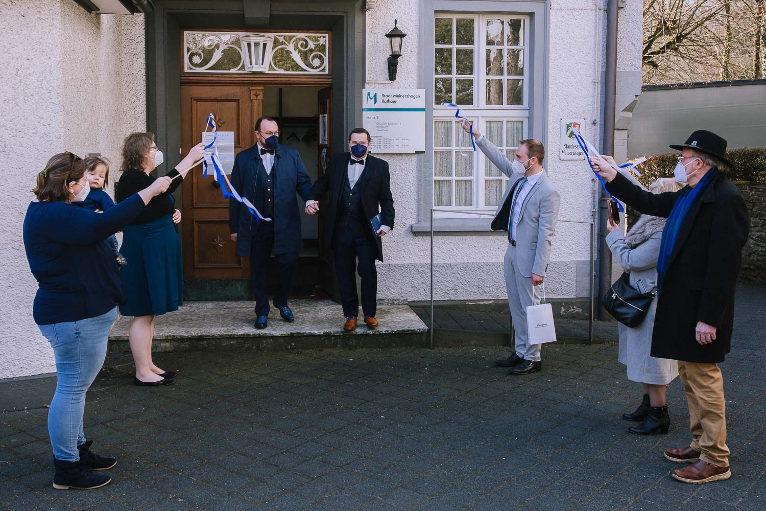 Florian und Sebastian waren tatsächlich mein erstes gleichgeschlechtliches Paar, das ich am Tag ihrer Trauung begleiten durfte. Schon während des Vorgesprächs in einem Café mit lecker Kaffee und Kuchen habe ich gemerkt, was für zwei großartige Menschen da vor mir saßen. Umso mehr freute ich mich, als die Nachricht kam, dass ich die Beiden am Tag ihrer Trauung im Standesamt Meinerzhagen mit anschließendem Bräutigamshooting an der Villa im Park Meinerzhagen und Feier im Hotel Sportalm Gipfelglück begleiten darf. Doch dann machte uns eine gewisse Pandemie mit „C“ einen Strich durch die Rechnung, sodass beinahe alles auf der Kippe stand. Doch auch für dieses Problem fanden wir schnell eine Lösung. Bezieheungsweise waren es eigentlich Florian und Sebastian, die eine Lösung fanden. Denn die ließen sich nicht unterkriegen und zogen die standesamtliche Trauung einfach durch. Zwar durften nur wenige Personen mit ins Trauzimmer und auch ich durfte nur ganz kurz die Kamera durch die Tür halten, um eine Handvoll Bilder zu machen, aber trotzdem waren alle Lieblingsmenschen von Florian und Sebastian dabei und empfingen die Beiden herzlich mit selbstgemachten Weddingwands draußen vor dem Standesamt Meinerzhagen. Nach der Gratulation und dem Sektempfang machten wir uns auf den Weg in den