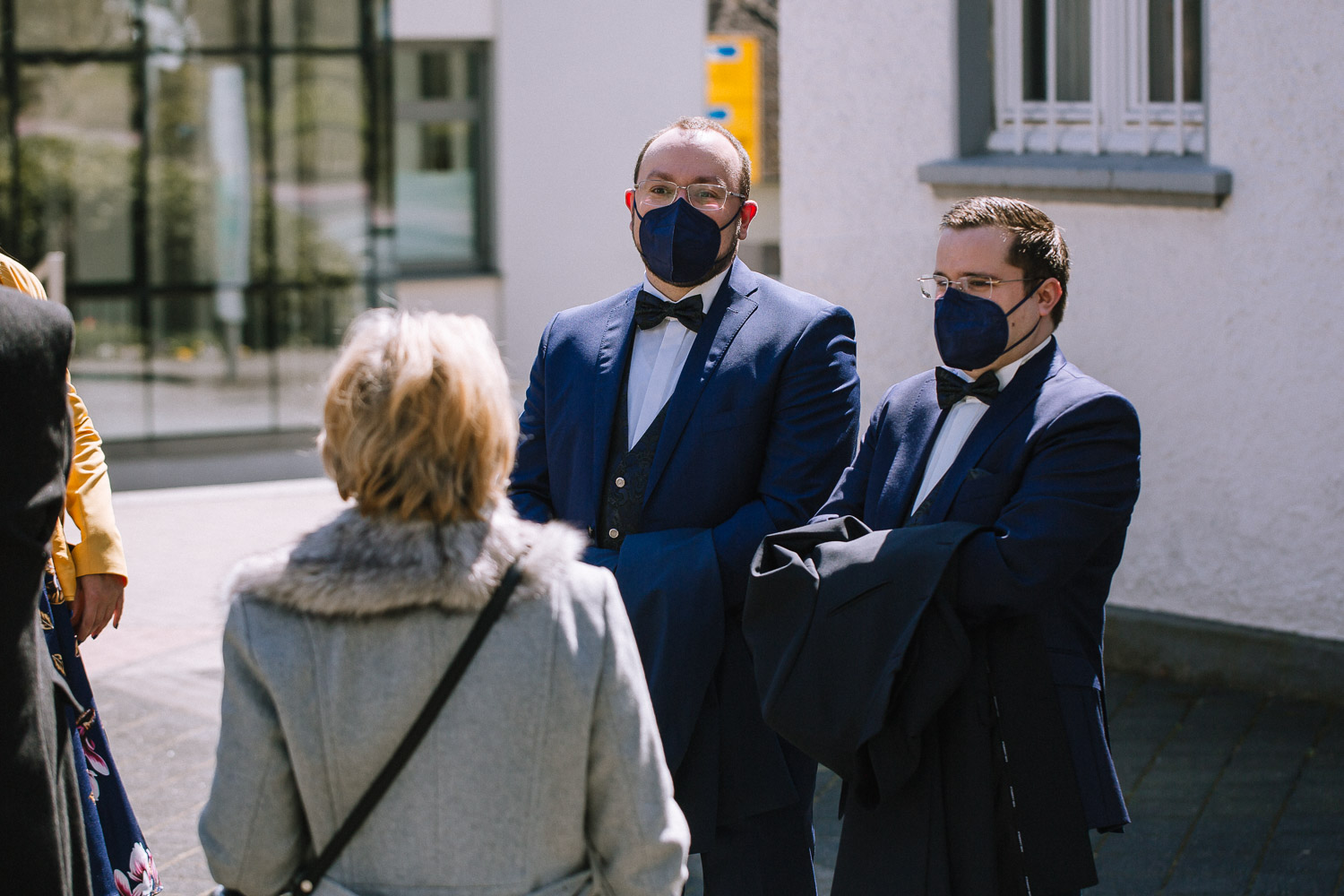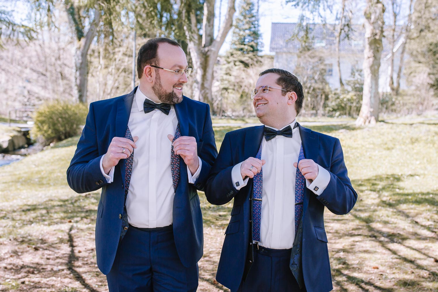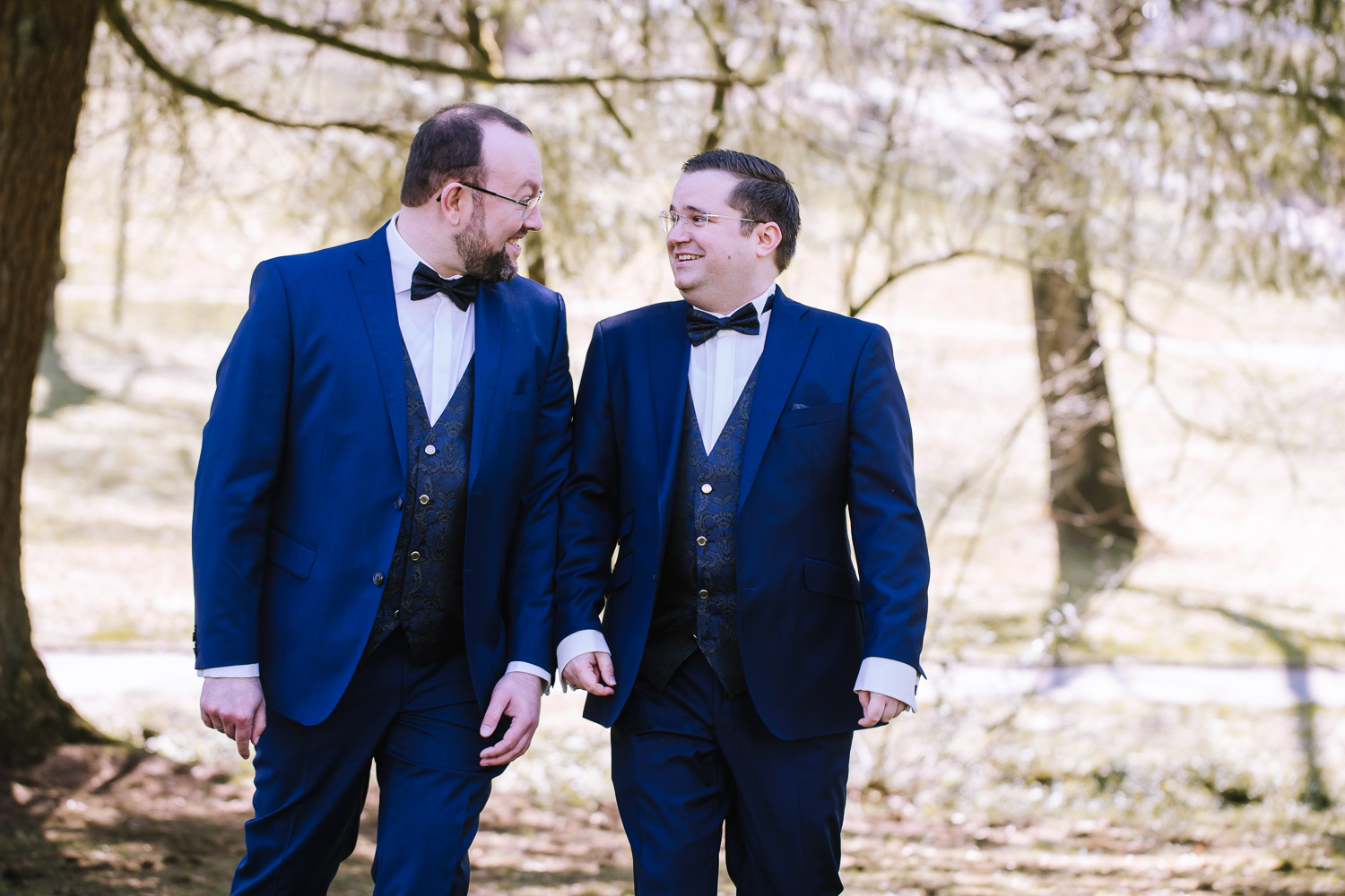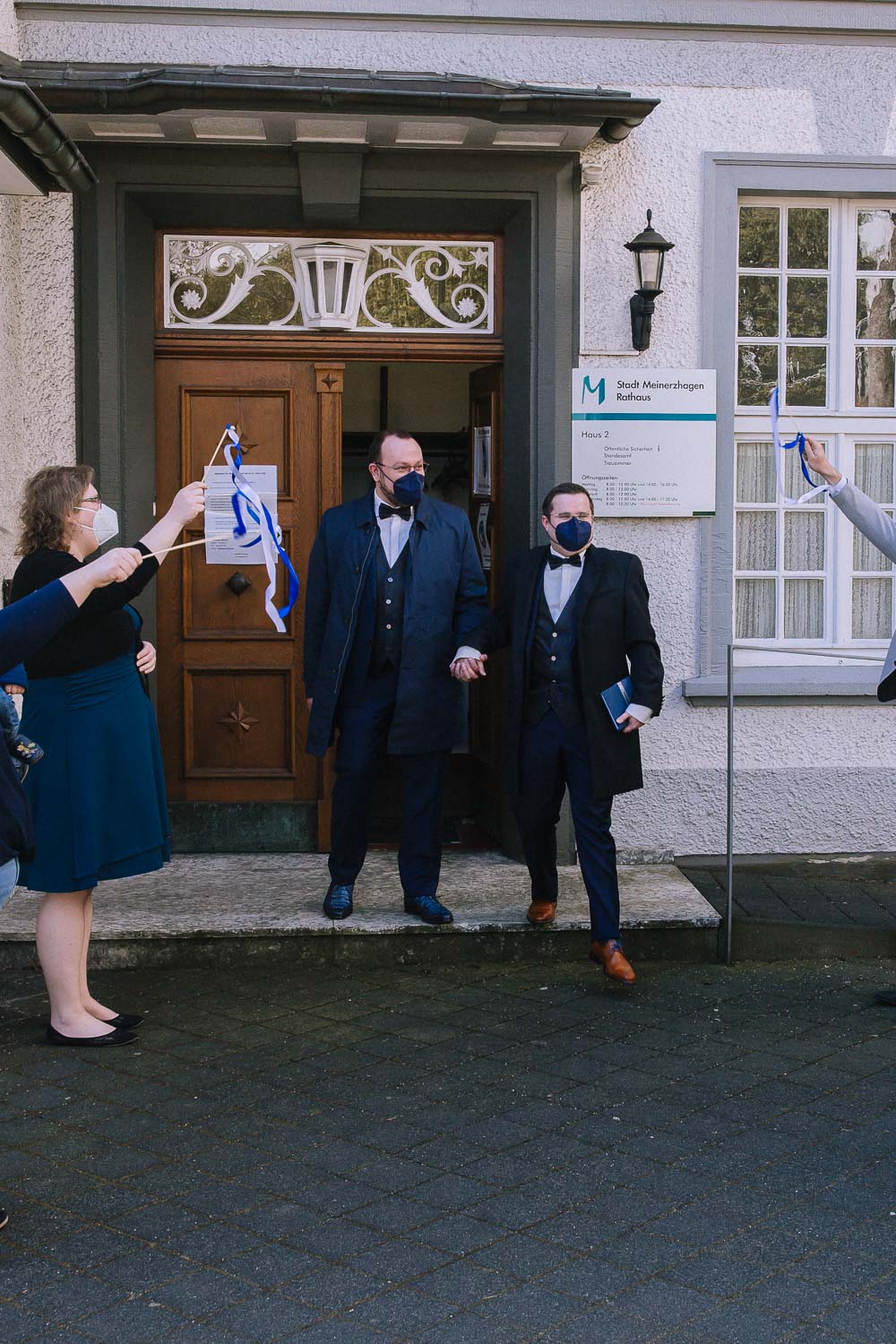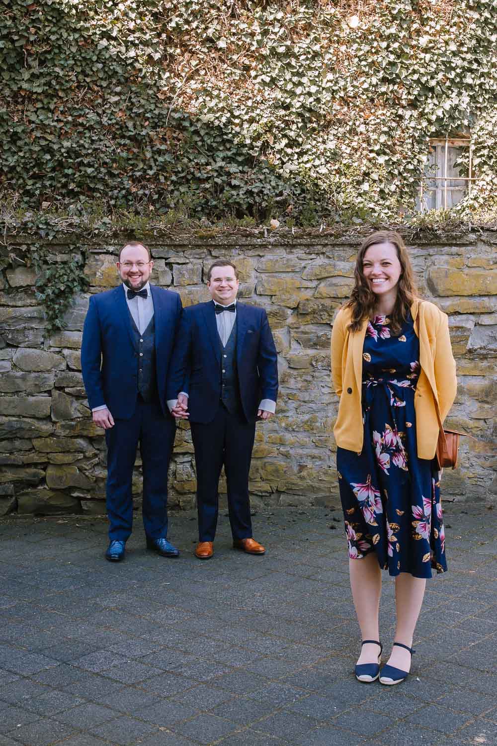 Florian und Sebastian waren tatsächlich mein erstes gleichgeschlechtliches Paar, das ich am Tag ihrer Trauung begleiten durfte. Schon während des Vorgesprächs in einem Café mit lecker Kaffee und Kuchen habe ich gemerkt, was für zwei großartige Menschen da vor mir saßen. Umso mehr freute ich mich, als die Nachricht kam, dass ich die Beiden am Tag ihrer Trauung im Standesamt Meinerzhagen mit anschließendem Bräutigamshooting an der Villa im Park Meinerzhagen und Feier im Hotel Sportalm Gipfelglück begleiten darf. Doch dann machte uns eine gewisse Pandemie mit „C“ einen Strich durch die Rechnung, sodass beinahe alles auf der Kippe stand. Doch auch für dieses Problem fanden wir schnell eine Lösung. Bezieheungsweise waren es eigentlich Florian und Sebastian, die eine Lösung fanden. Denn die ließen sich nicht unterkriegen und zogen die standesamtliche Trauung einfach durch. Zwar durften nur wenige Personen mit ins Trauzimmer und auch ich durfte nur ganz kurz die Kamera durch die Tür halten, um eine Handvoll Bilder zu machen, aber trotzdem waren alle Lieblingsmenschen von Florian und Sebastian dabei und empfingen die Beiden herzlich mit selbstgemachten Weddingwands draußen vor dem Standesamt Meinerzhagen. Nach der Gratulation und dem Sektempfang machten wir uns auf den Weg in den
