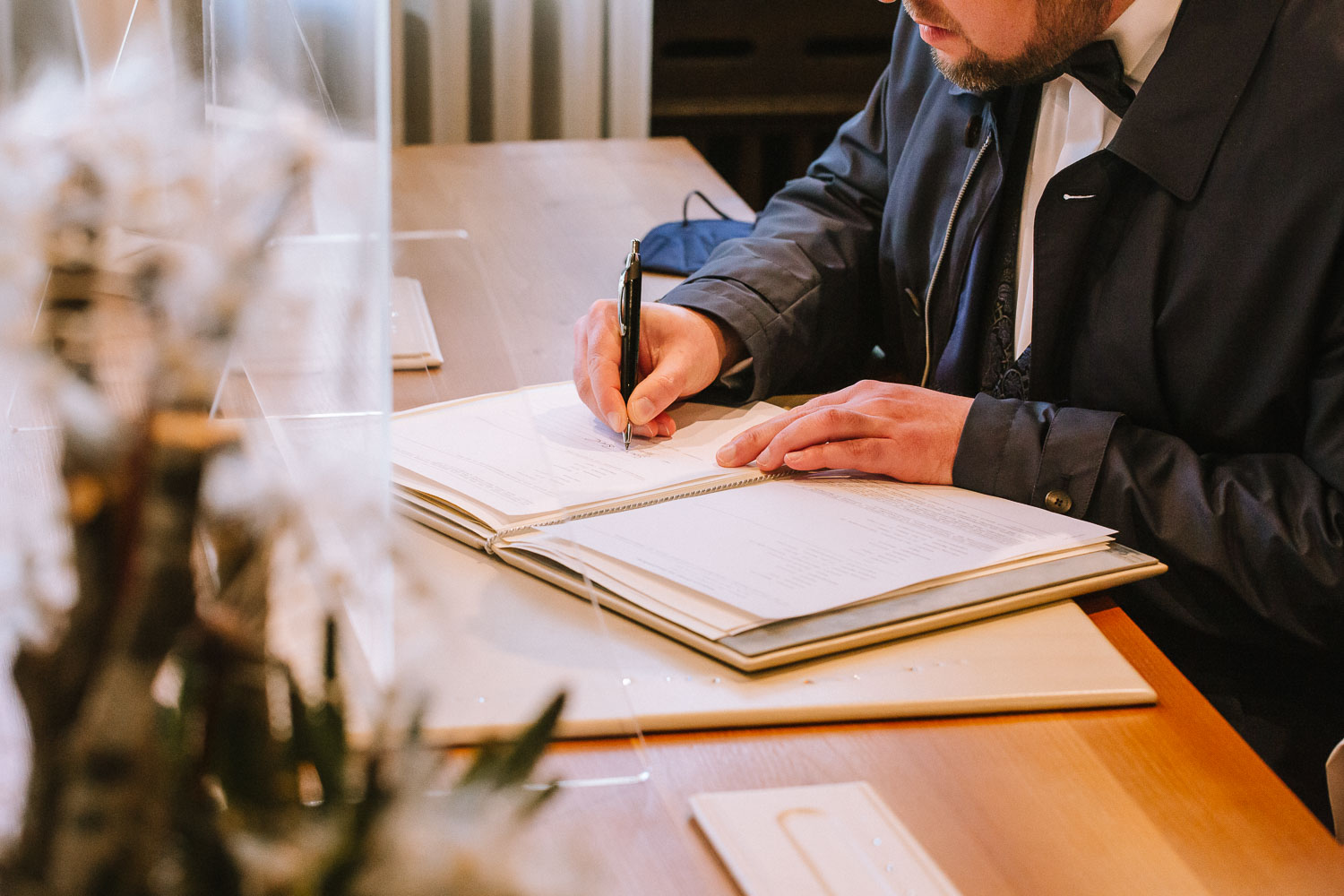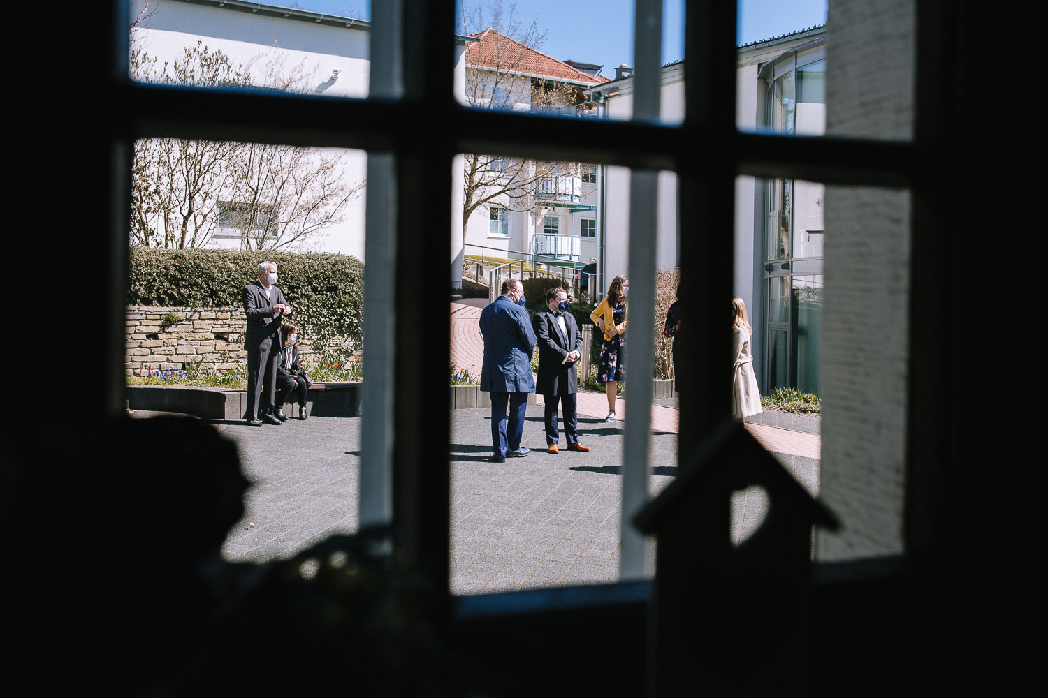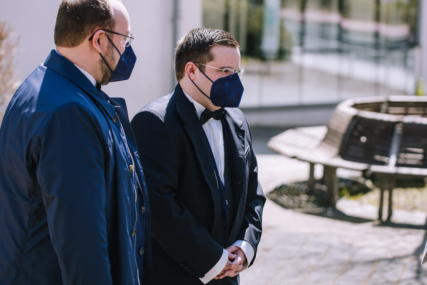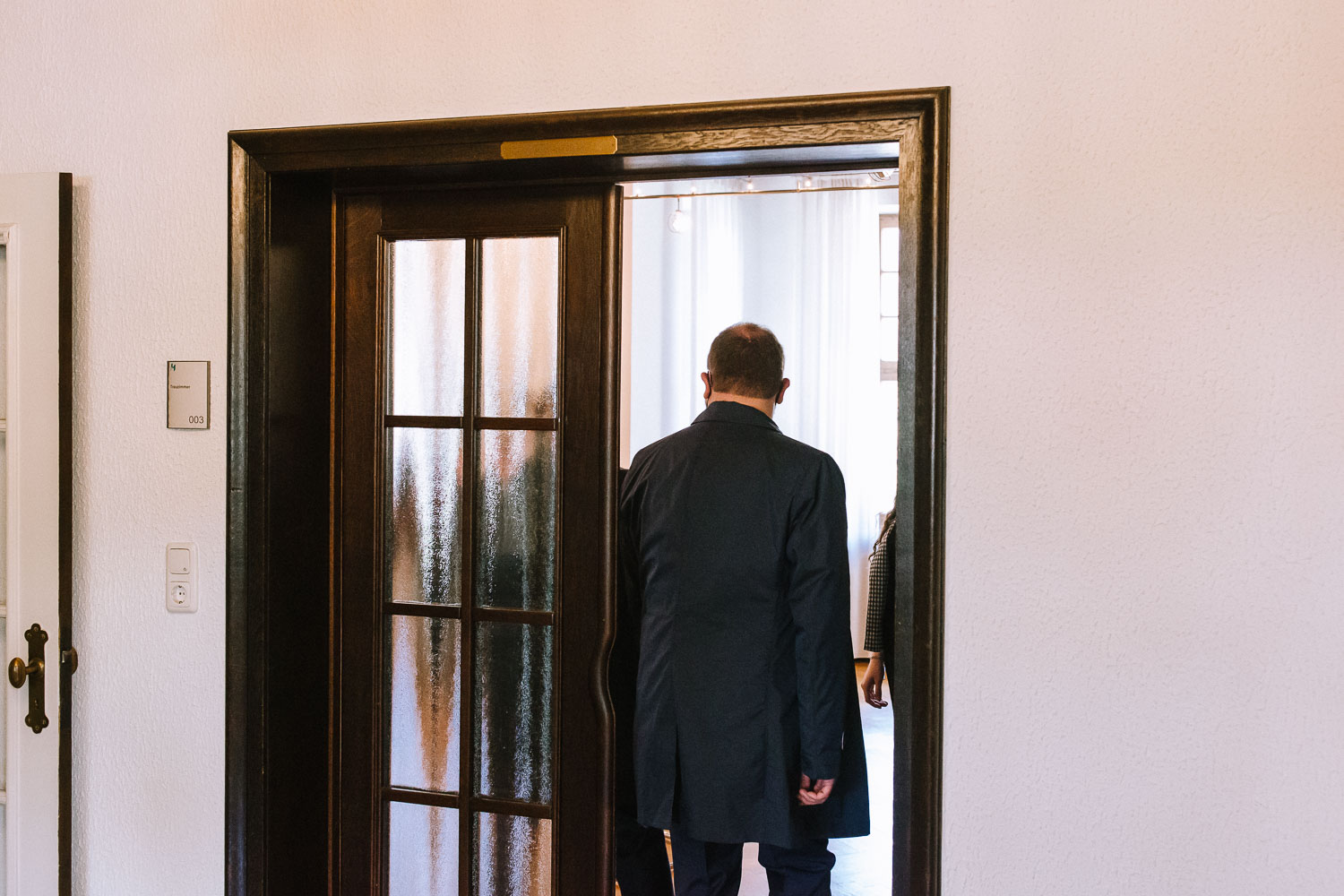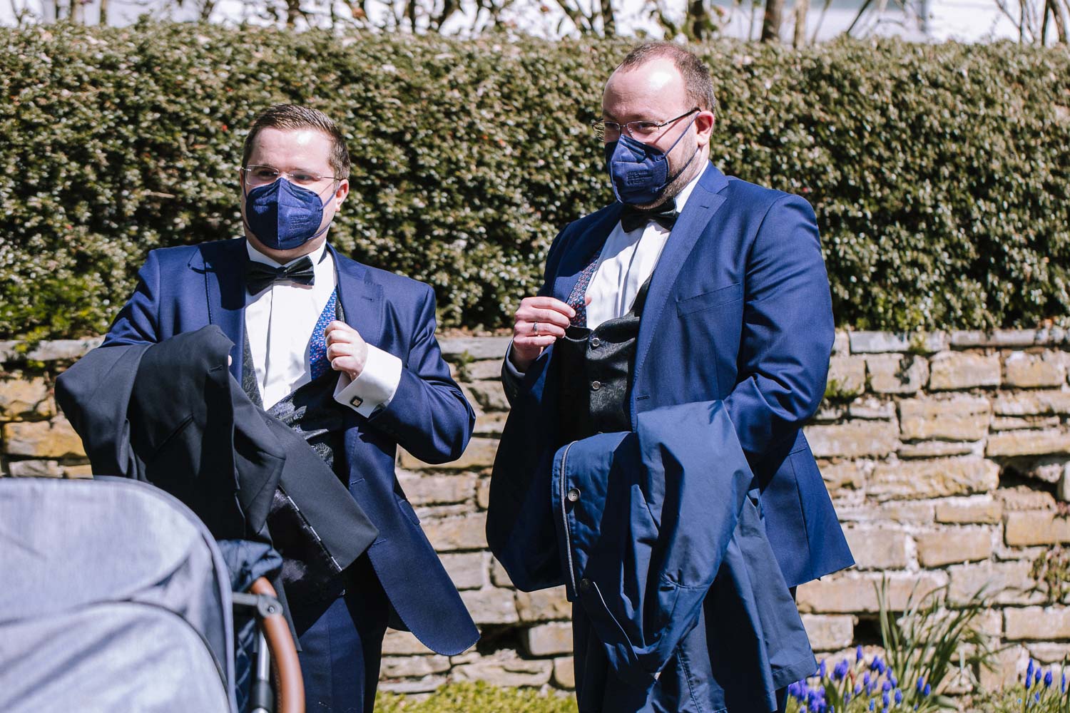 Florian und Sebastian waren tatsächlich mein erstes gleichgeschlechtliches Paar, das ich am Tag ihrer Trauung begleiten durfte. Schon während des Vorgesprächs in einem Café mit lecker Kaffee und Kuchen habe ich gemerkt, was für zwei großartige Menschen da vor mir saßen. Umso mehr freute ich mich, als die Nachricht kam, dass ich die Beiden am Tag ihrer Trauung im Standesamt Meinerzhagen mit anschließendem Bräutigamshooting an der Villa im Park Meinerzhagen und Feier im Hotel Sportalm Gipfelglück begleiten darf. Doch dann machte uns eine gewisse Pandemie mit „C“ einen Strich durch die Rechnung, sodass beinahe alles auf der Kippe stand. Doch auch für dieses Problem fanden wir schnell eine Lösung. Bezieheungsweise waren es eigentlich Florian und Sebastian, die eine Lösung fanden. Denn die ließen sich nicht unterkriegen und zogen die standesamtliche Trauung einfach durch. Zwar durften nur wenige Personen mit ins Trauzimmer und auch ich durfte nur ganz kurz die Kamera durch die Tür halten, um eine Handvoll Bilder zu machen, aber trotzdem waren alle Lieblingsmenschen von Florian und Sebastian dabei und empfingen die Beiden herzlich mit selbstgemachten Weddingwands draußen vor dem Standesamt Meinerzhagen. Nach der Gratulation und dem Sektempfang machten wir uns auf den Weg in den