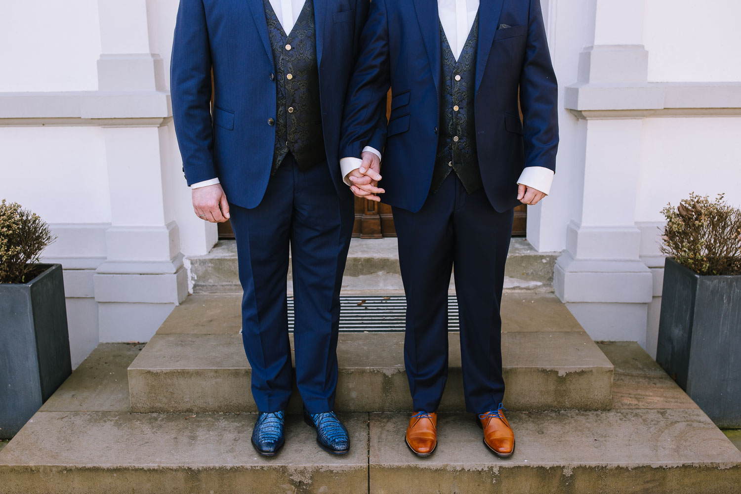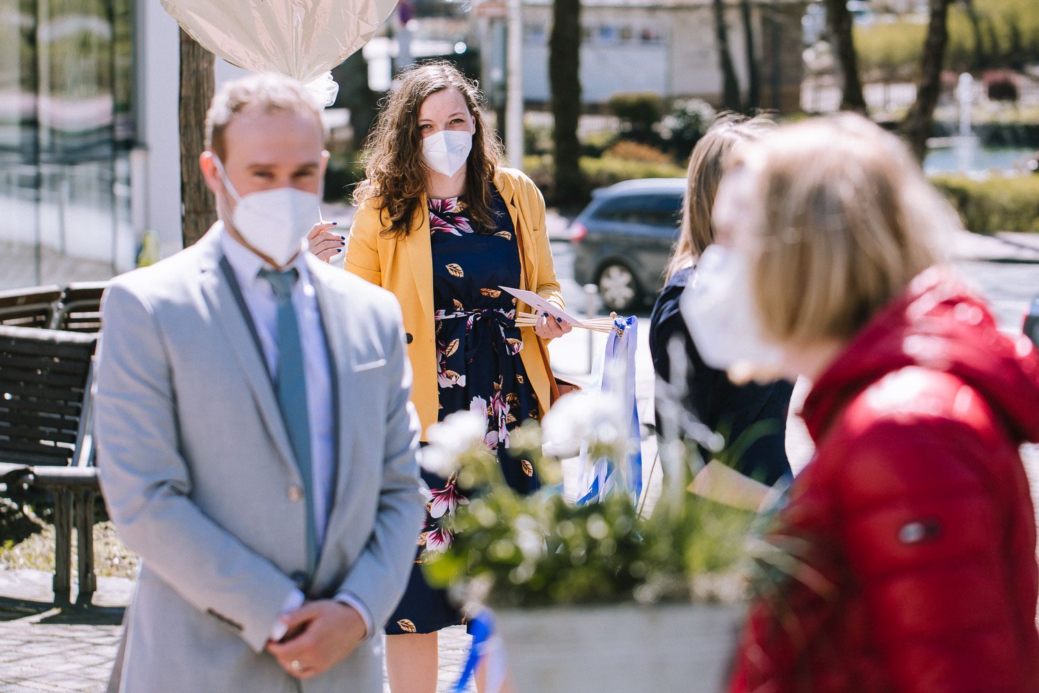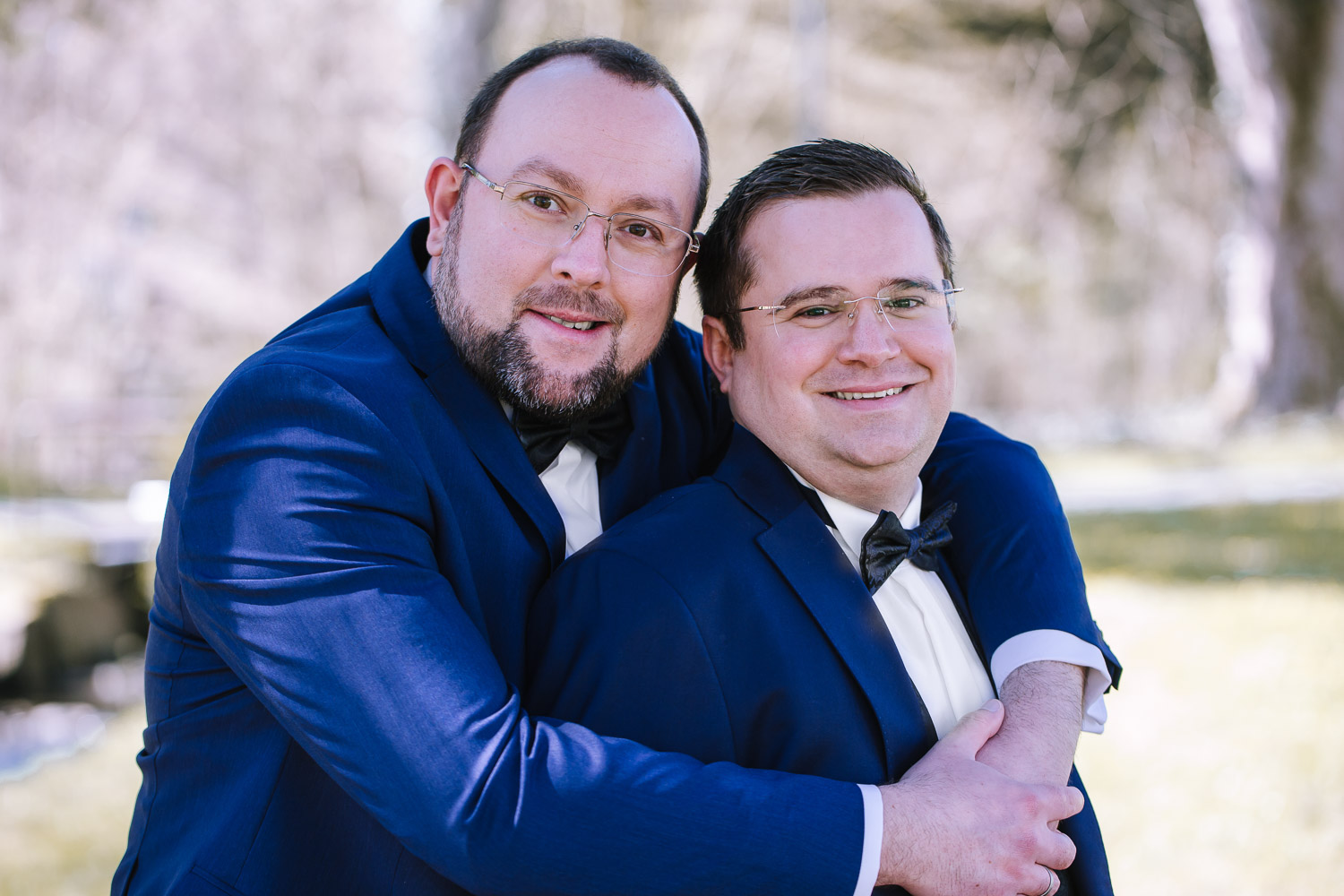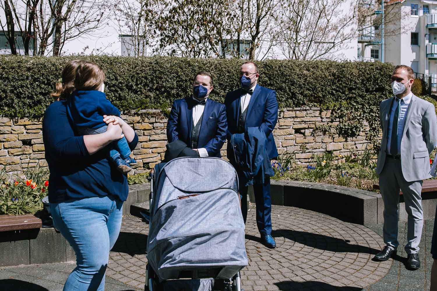 Florian und Sebastian waren tatsächlich mein erstes gleichgeschlechtliches Paar, das ich am Tag ihrer Trauung begleiten durfte. Schon während des Vorgesprächs in einem Café mit lecker Kaffee und Kuchen habe ich gemerkt, was für zwei großartige Menschen da vor mir saßen. Umso mehr freute ich mich, als die Nachricht kam, dass ich die Beiden am Tag ihrer Trauung im Standesamt Meinerzhagen mit anschließendem Bräutigamshooting an der Villa im Park Meinerzhagen und Feier im Hotel Sportalm Gipfelglück begleiten darf. Doch dann machte uns eine gewisse Pandemie mit „C“ einen Strich durch die Rechnung, sodass beinahe alles auf der Kippe stand. Doch auch für dieses Problem fanden wir schnell eine Lösung. Bezieheungsweise waren es eigentlich Florian und Sebastian, die eine Lösung fanden. Denn die ließen sich nicht unterkriegen und zogen die standesamtliche Trauung einfach durch. Zwar durften nur wenige Personen mit ins Trauzimmer und auch ich durfte nur ganz kurz die Kamera durch die Tür halten, um eine Handvoll Bilder zu machen, aber trotzdem waren alle Lieblingsmenschen von Florian und Sebastian dabei und empfingen die Beiden herzlich mit selbstgemachten Weddingwands draußen vor dem Standesamt Meinerzhagen. Nach der Gratulation und dem Sektempfang machten wir uns auf den Weg in den