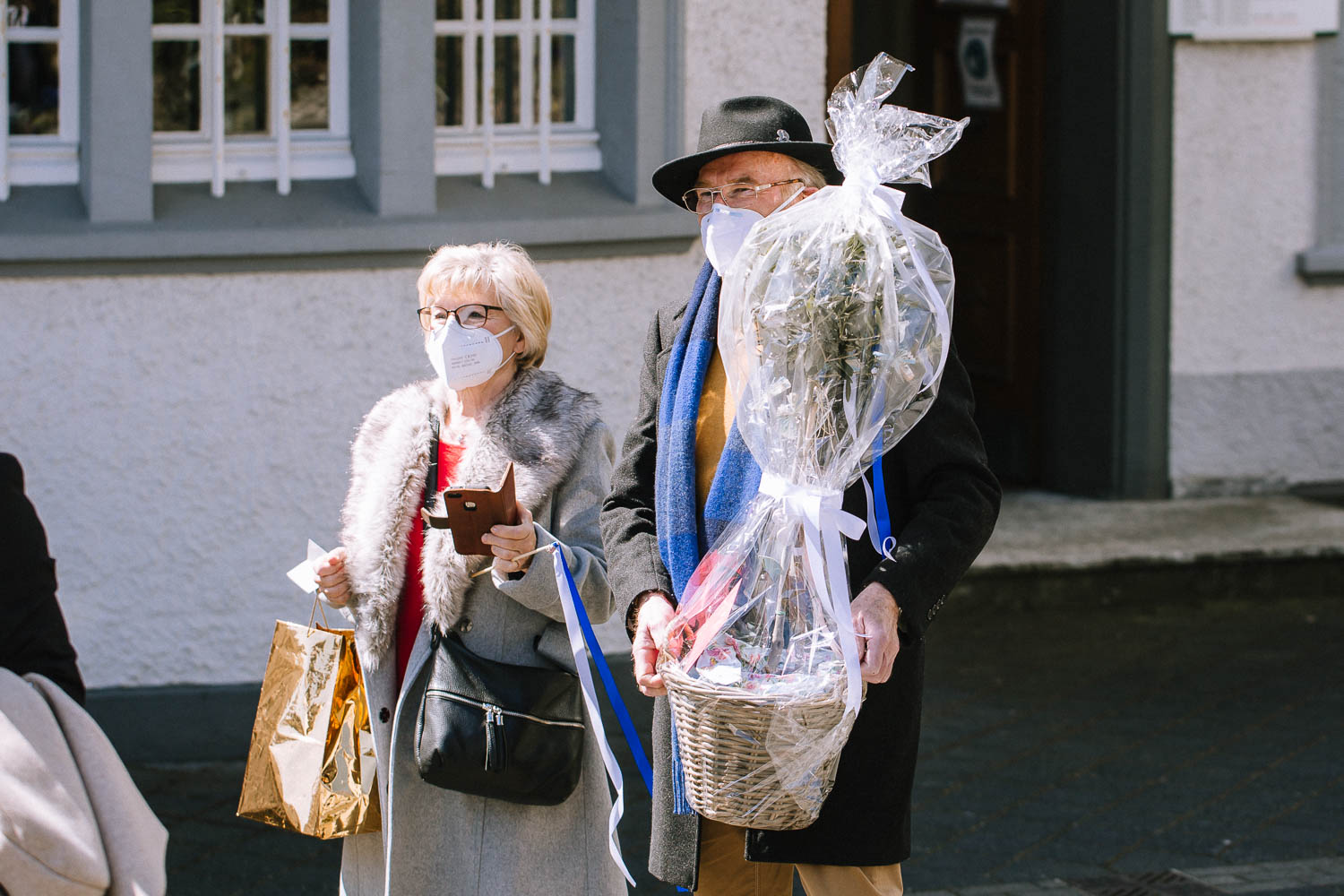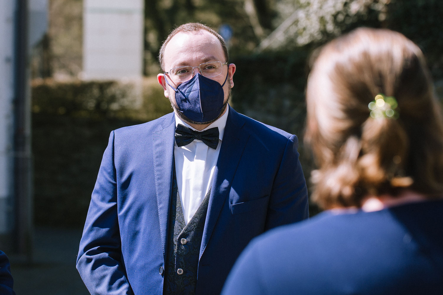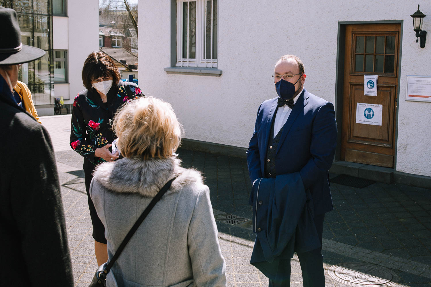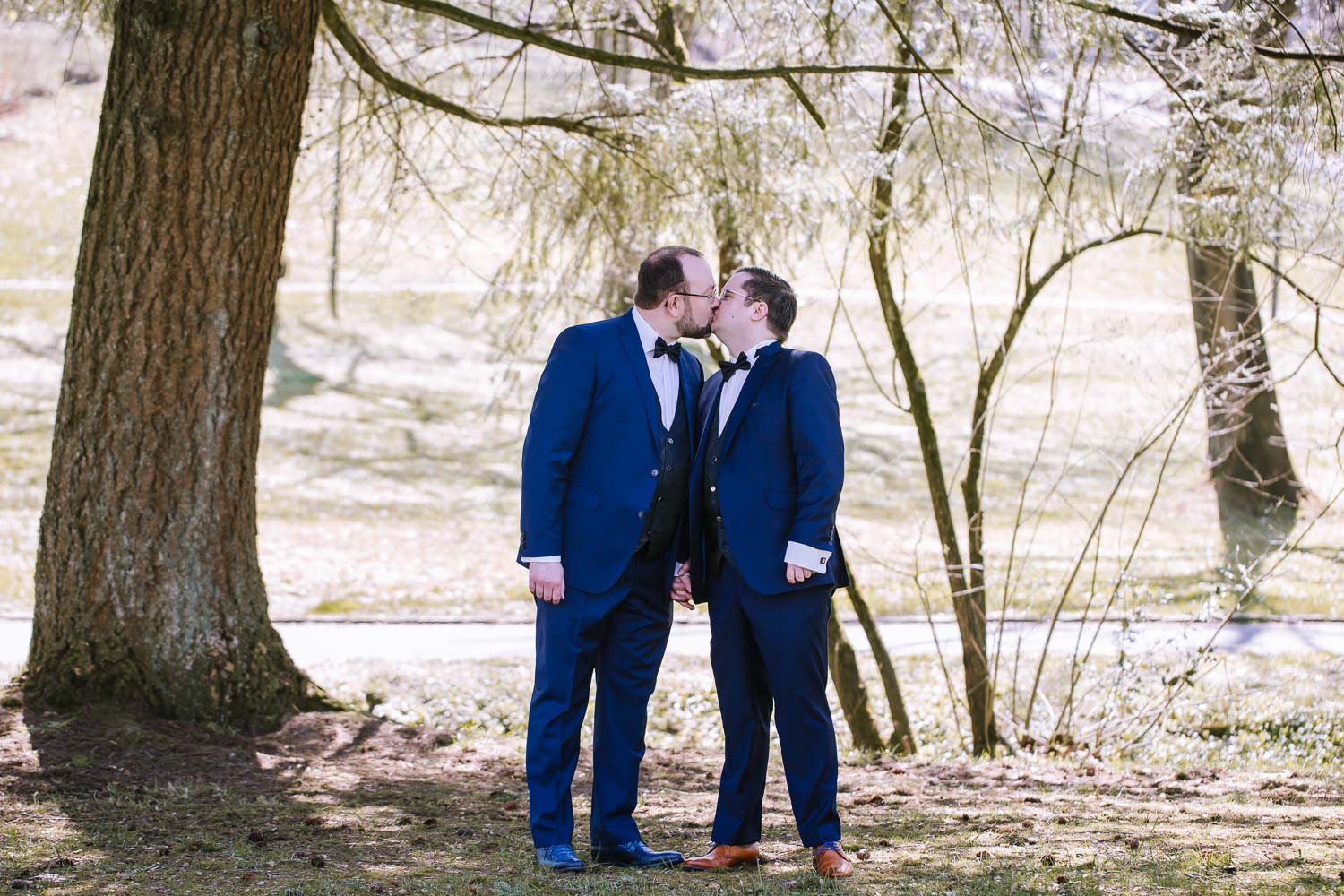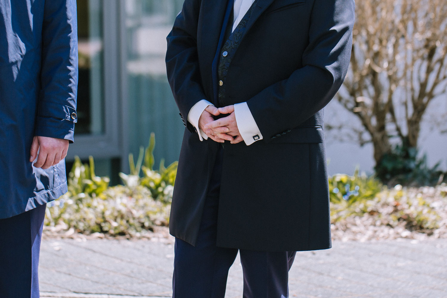 Florian und Sebastian waren tatsächlich mein erstes gleichgeschlechtliches Paar, das ich am Tag ihrer Trauung begleiten durfte. Schon während des Vorgesprächs in einem Café mit lecker Kaffee und Kuchen habe ich gemerkt, was für zwei großartige Menschen da vor mir saßen. Umso mehr freute ich mich, als die Nachricht kam, dass ich die Beiden am Tag ihrer Trauung im Standesamt Meinerzhagen mit anschließendem Bräutigamshooting an der Villa im Park Meinerzhagen und Feier im Hotel Sportalm Gipfelglück begleiten darf. Doch dann machte uns eine gewisse Pandemie mit „C“ einen Strich durch die Rechnung, sodass beinahe alles auf der Kippe stand. Doch auch für dieses Problem fanden wir schnell eine Lösung. Bezieheungsweise waren es eigentlich Florian und Sebastian, die eine Lösung fanden. Denn die ließen sich nicht unterkriegen und zogen die standesamtliche Trauung einfach durch. Zwar durften nur wenige Personen mit ins Trauzimmer und auch ich durfte nur ganz kurz die Kamera durch die Tür halten, um eine Handvoll Bilder zu machen, aber trotzdem waren alle Lieblingsmenschen von Florian und Sebastian dabei und empfingen die Beiden herzlich mit selbstgemachten Weddingwands draußen vor dem Standesamt Meinerzhagen. Nach der Gratulation und dem Sektempfang machten wir uns auf den Weg in den