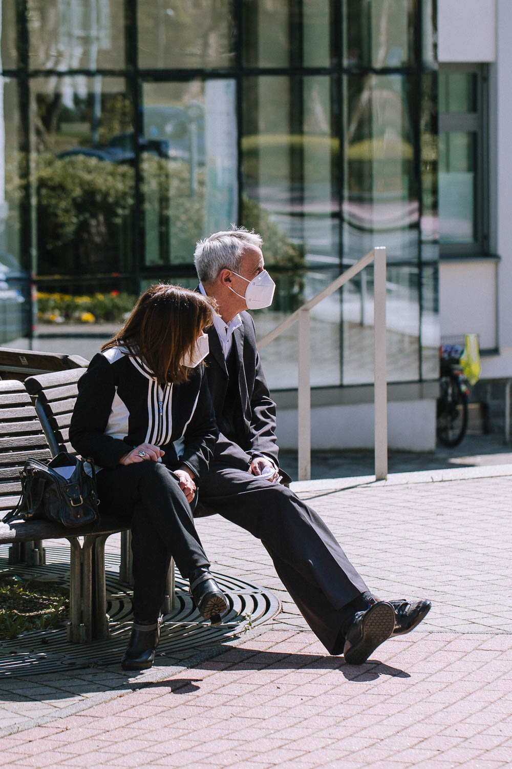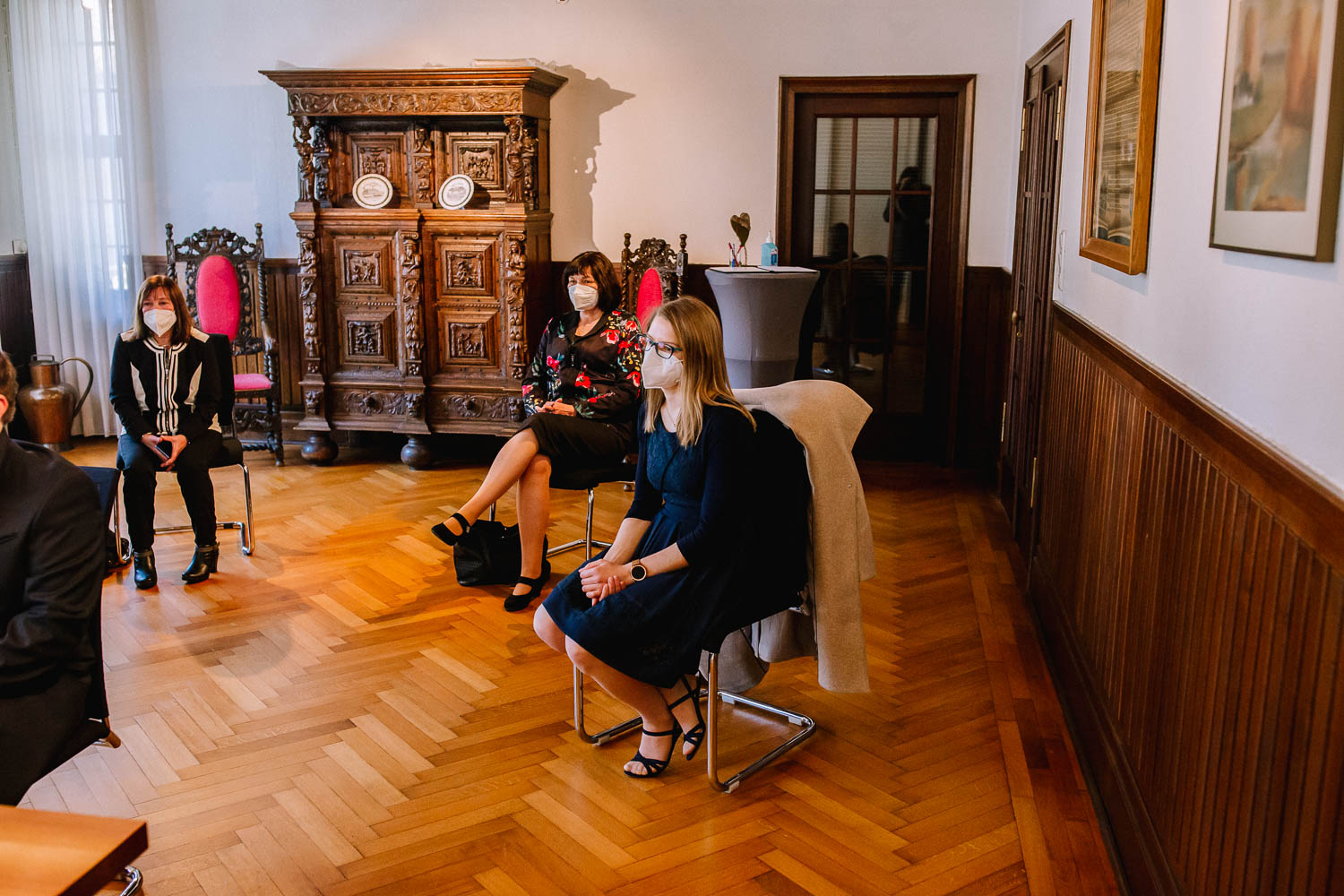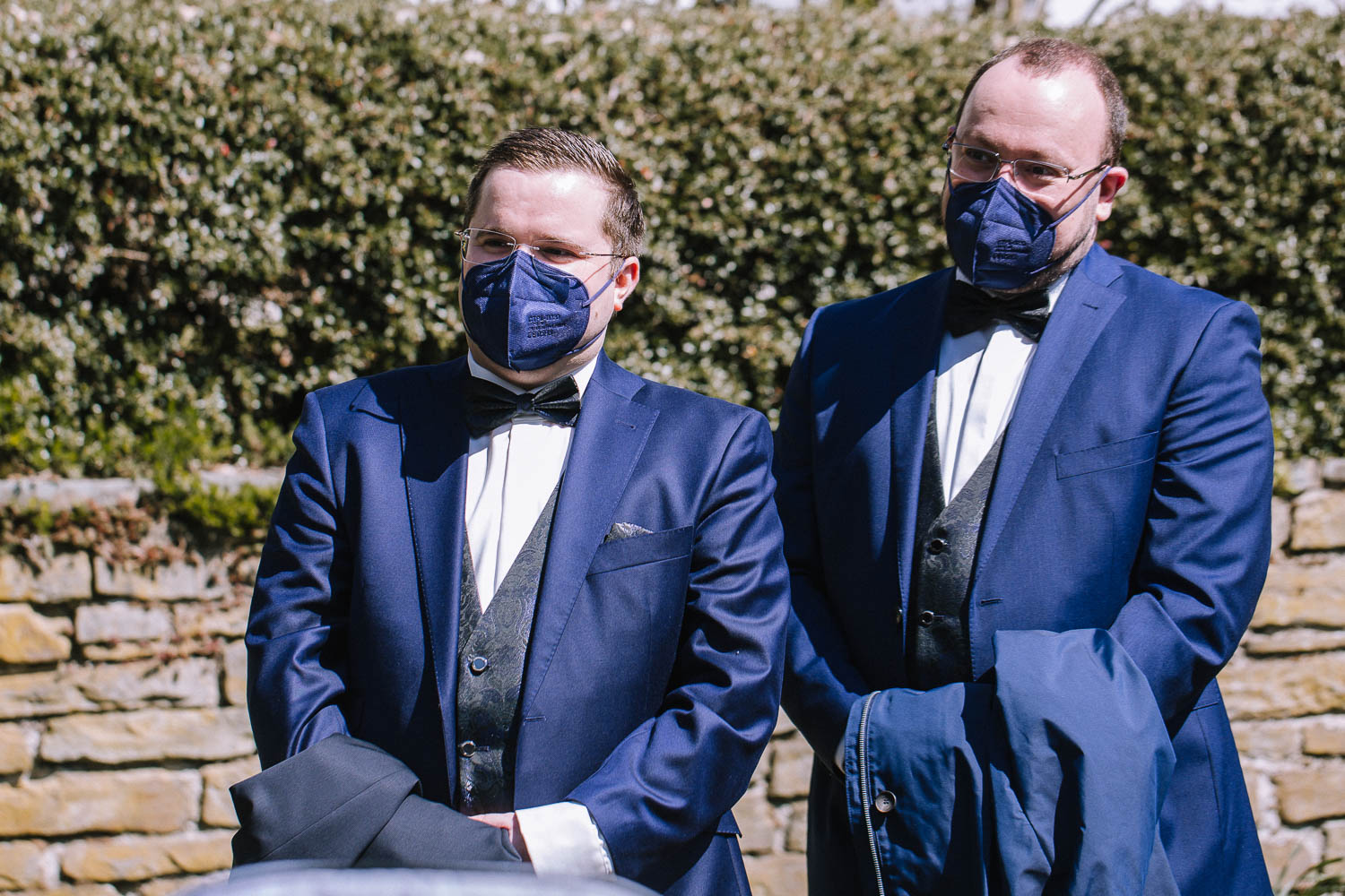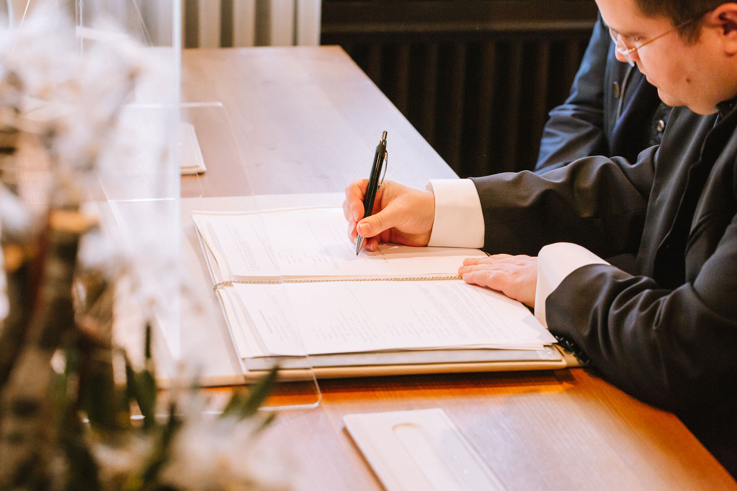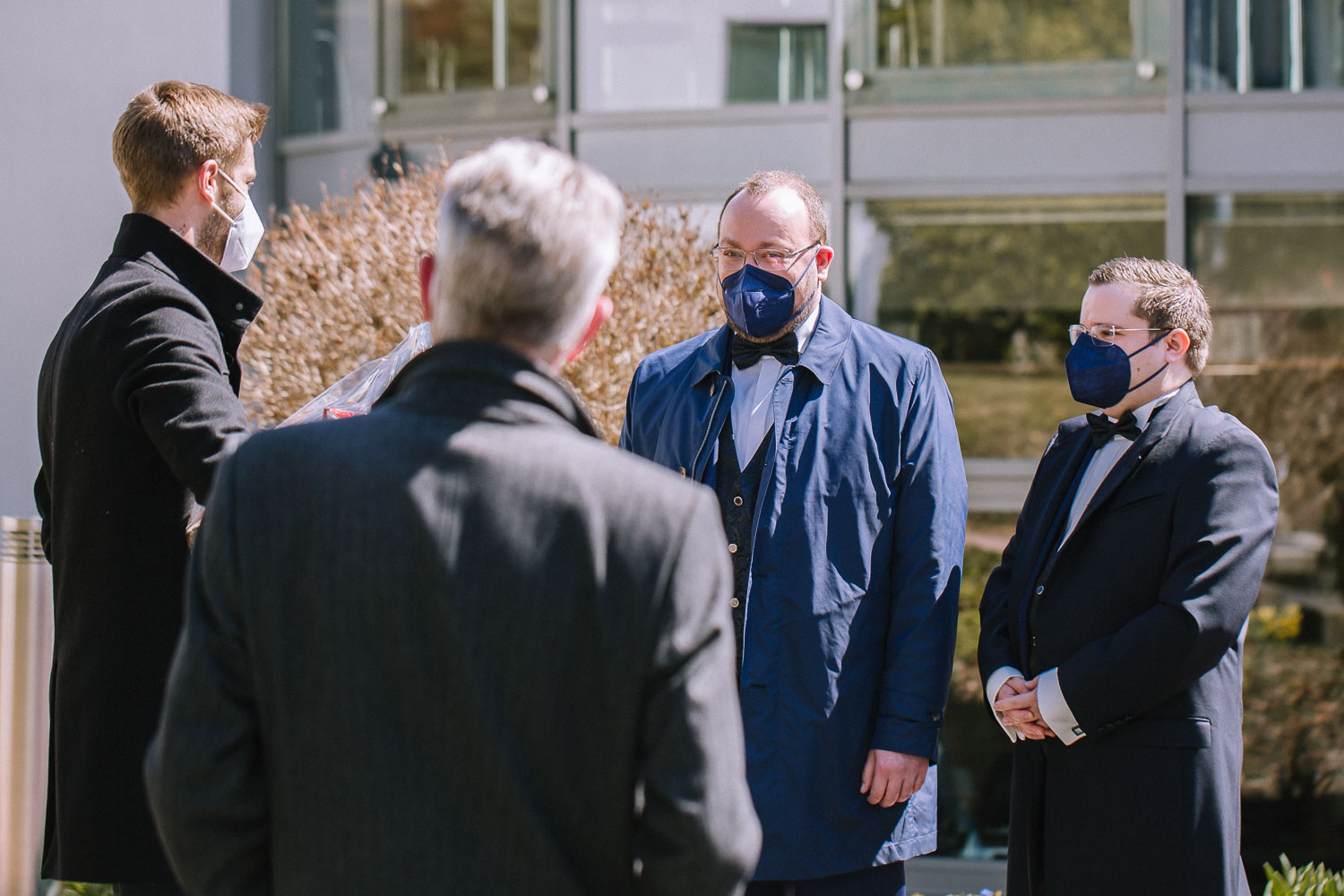 Florian und Sebastian waren tatsächlich mein erstes gleichgeschlechtliches Paar, das ich am Tag ihrer Trauung begleiten durfte. Schon während des Vorgesprächs in einem Café mit lecker Kaffee und Kuchen habe ich gemerkt, was für zwei großartige Menschen da vor mir saßen. Umso mehr freute ich mich, als die Nachricht kam, dass ich die Beiden am Tag ihrer Trauung im Standesamt Meinerzhagen mit anschließendem Bräutigamshooting an der Villa im Park Meinerzhagen und Feier im Hotel Sportalm Gipfelglück begleiten darf. Doch dann machte uns eine gewisse Pandemie mit „C“ einen Strich durch die Rechnung, sodass beinahe alles auf der Kippe stand. Doch auch für dieses Problem fanden wir schnell eine Lösung. Bezieheungsweise waren es eigentlich Florian und Sebastian, die eine Lösung fanden. Denn die ließen sich nicht unterkriegen und zogen die standesamtliche Trauung einfach durch. Zwar durften nur wenige Personen mit ins Trauzimmer und auch ich durfte nur ganz kurz die Kamera durch die Tür halten, um eine Handvoll Bilder zu machen, aber trotzdem waren alle Lieblingsmenschen von Florian und Sebastian dabei und empfingen die Beiden herzlich mit selbstgemachten Weddingwands draußen vor dem Standesamt Meinerzhagen. Nach der Gratulation und dem Sektempfang machten wir uns auf den Weg in den
