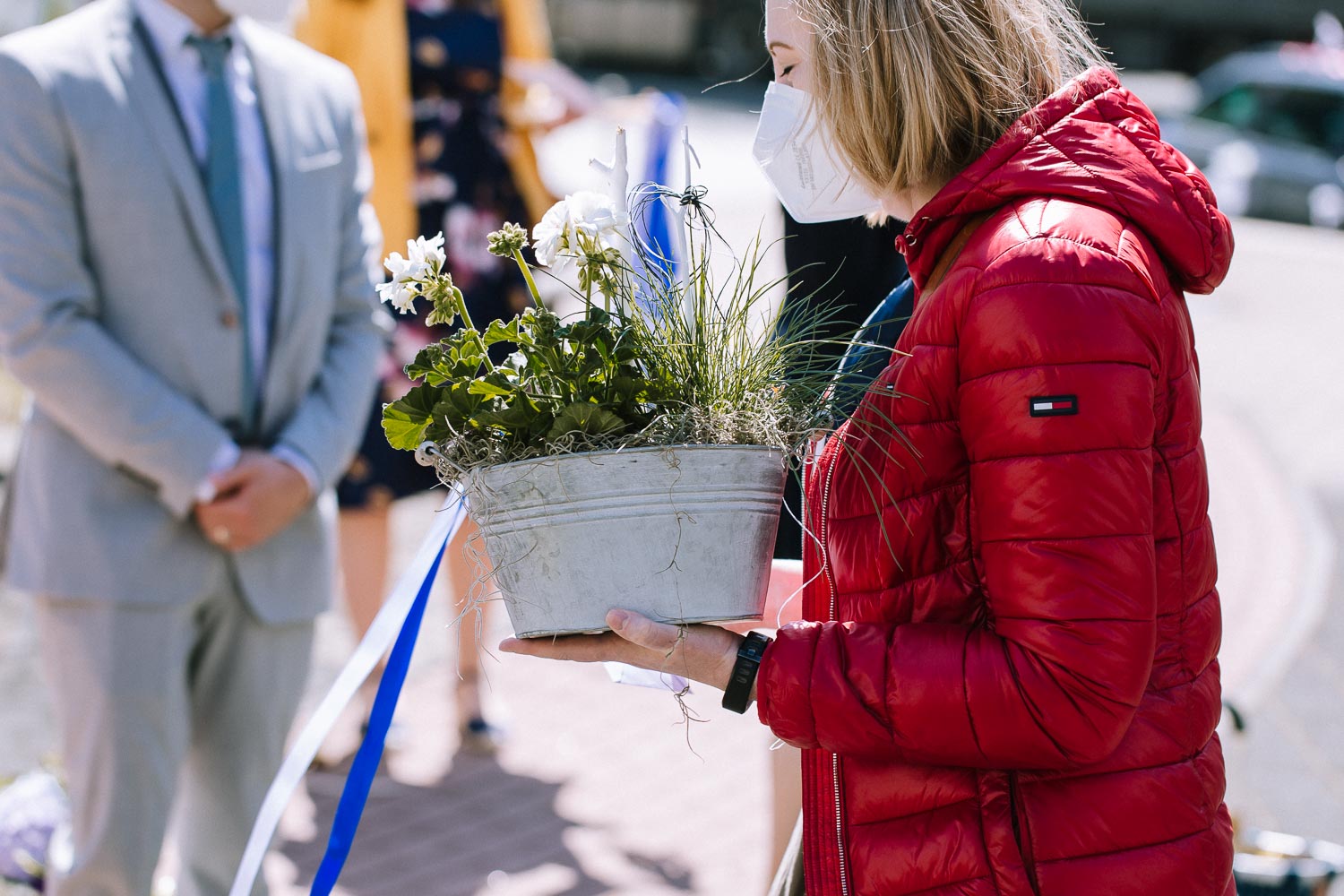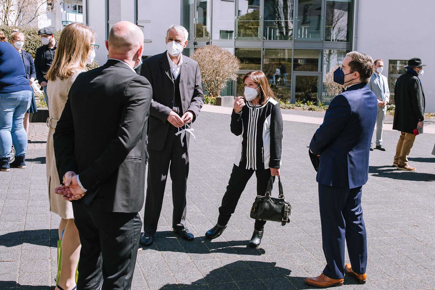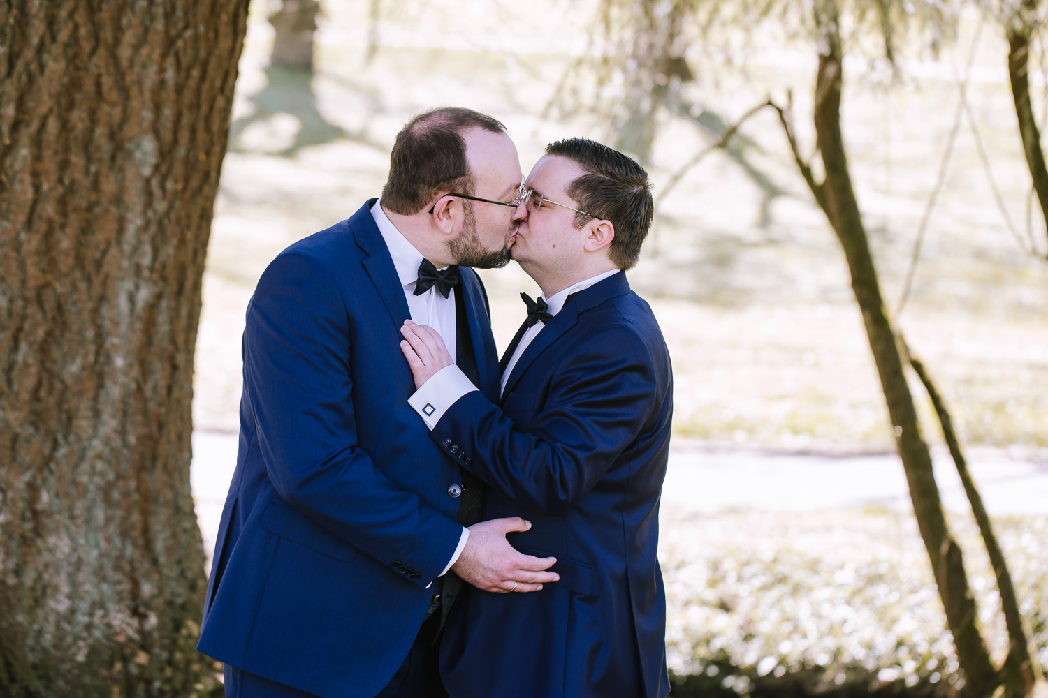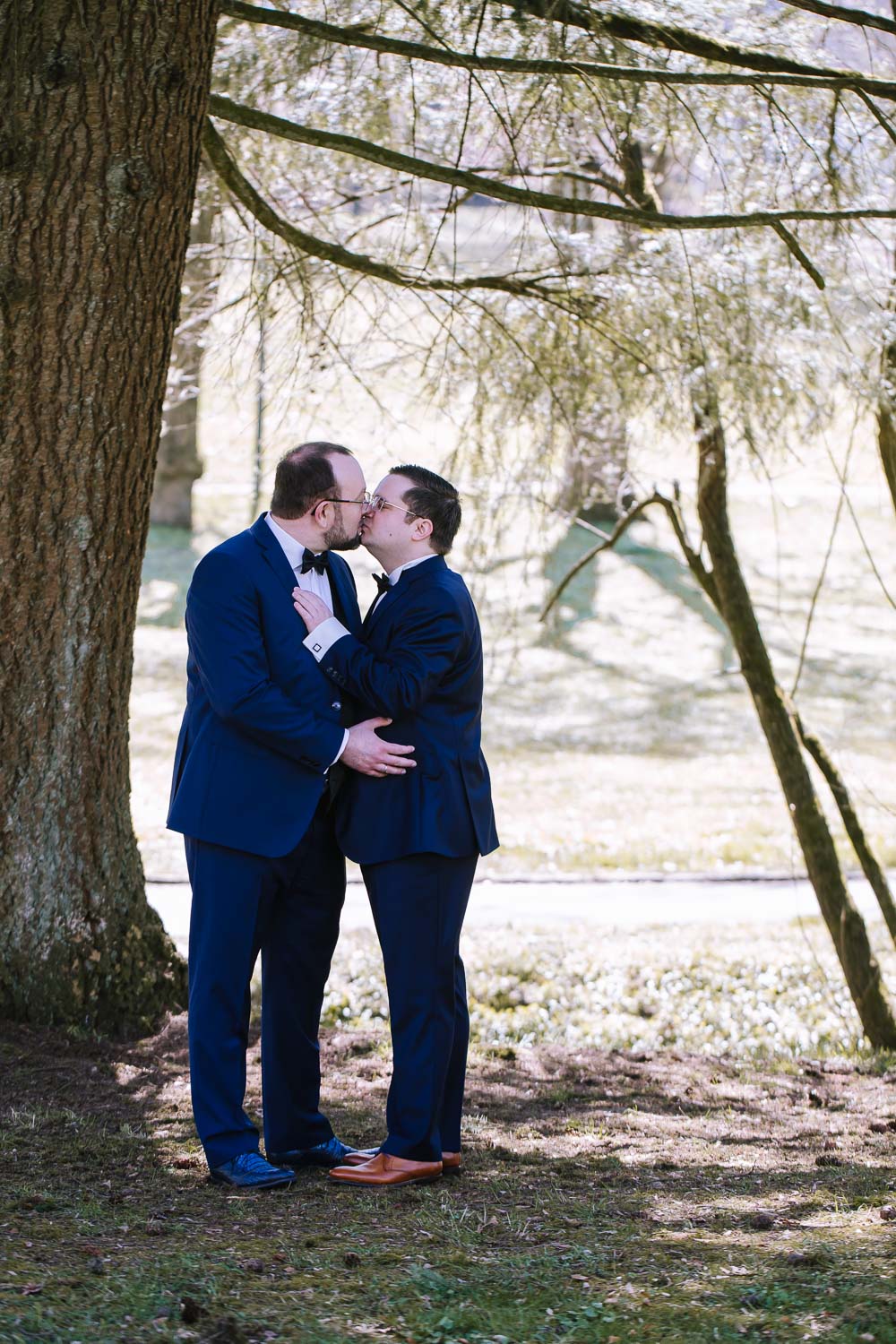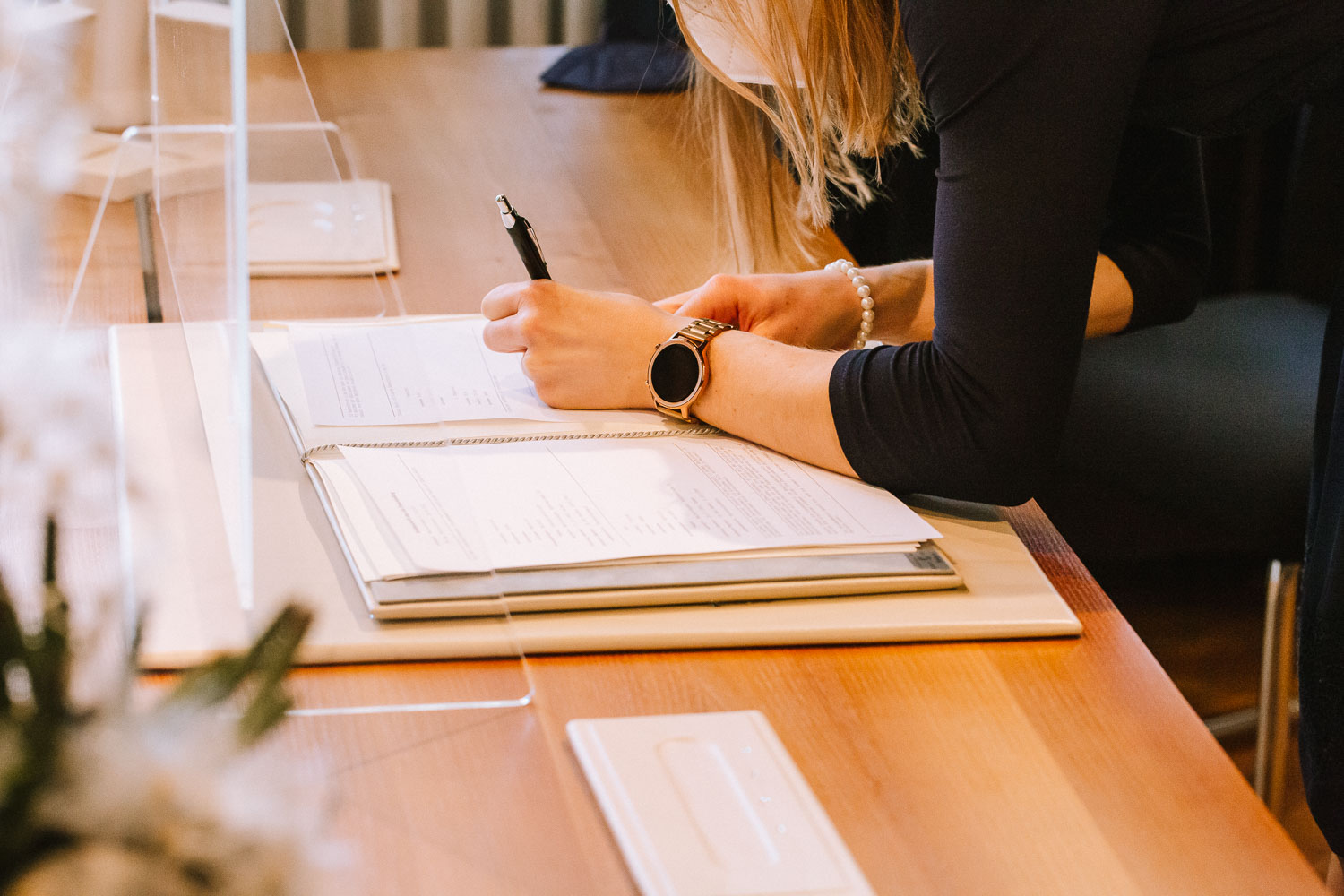 Florian und Sebastian waren tatsächlich mein erstes gleichgeschlechtliches Paar, das ich am Tag ihrer Trauung begleiten durfte. Schon während des Vorgesprächs in einem Café mit lecker Kaffee und Kuchen habe ich gemerkt, was für zwei großartige Menschen da vor mir saßen. Umso mehr freute ich mich, als die Nachricht kam, dass ich die Beiden am Tag ihrer Trauung im Standesamt Meinerzhagen mit anschließendem Bräutigamshooting an der Villa im Park Meinerzhagen und Feier im Hotel Sportalm Gipfelglück begleiten darf. Doch dann machte uns eine gewisse Pandemie mit „C“ einen Strich durch die Rechnung, sodass beinahe alles auf der Kippe stand. Doch auch für dieses Problem fanden wir schnell eine Lösung. Bezieheungsweise waren es eigentlich Florian und Sebastian, die eine Lösung fanden. Denn die ließen sich nicht unterkriegen und zogen die standesamtliche Trauung einfach durch. Zwar durften nur wenige Personen mit ins Trauzimmer und auch ich durfte nur ganz kurz die Kamera durch die Tür halten, um eine Handvoll Bilder zu machen, aber trotzdem waren alle Lieblingsmenschen von Florian und Sebastian dabei und empfingen die Beiden herzlich mit selbstgemachten Weddingwands draußen vor dem Standesamt Meinerzhagen. Nach der Gratulation und dem Sektempfang machten wir uns auf den Weg in den